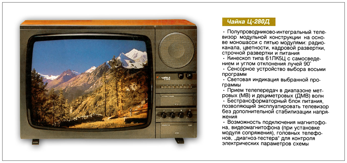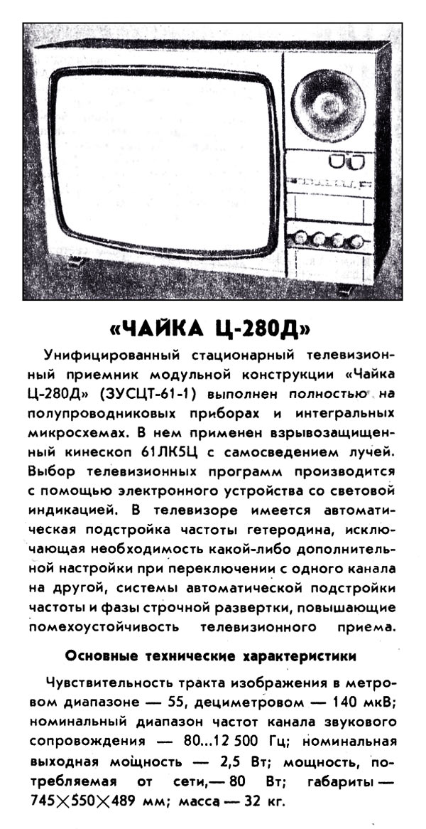 Цветной телевизор *Чайка Ц-280Д* с 1985 года выпускал Горьковский телевизионный завод им. Ленина. Унифицированный полупроводниково-интегральный модульный цветной телевизор **Чайка Ц-280Д** предназначен для приёма в диапазонах МВ и ДМВ. В ТВ имеются автоматические регулировки. Выбор любой из 8-ми программ осуществляется сенсорным переключателем. Применение импульсного блока питания и новой элементной базы, позволили уменьшить габариты, вес и потребляемую мощность аппарата. Применены: цветной масочный кинескоп 61ЛК5Ц с углом отклонения лучей 90°, с самосведением; сенсорный переключатель телепрограмм УСУ-1-15; селекторы типа СК-М-24 и СК-Д-24; световая индикация канала. Есть возможность подключения магнитофона; видеомагнитофона при установке модуля сопряжения; прослушивания звука на телефоны; подключения диагноз-тестера. Размер изображения 362х482 мм. Диапазон рабочих частот 80...12500 Гц. Чувствительность в МВ 55, ДМВ 90 мкВ. Номинальная выходная мощность 2,5 Вт. Потребляемая мощность 80 Вт. Габариты ТВ - 500х745х550 мм. Вес 32 кг. С 1986 года Сормовский телевизионный завод *Лазурь* выпускал телевизор *Лазурь Ц-280* аналог телевизора *Чайка Ц-280Д* отличавшийся оформлением.