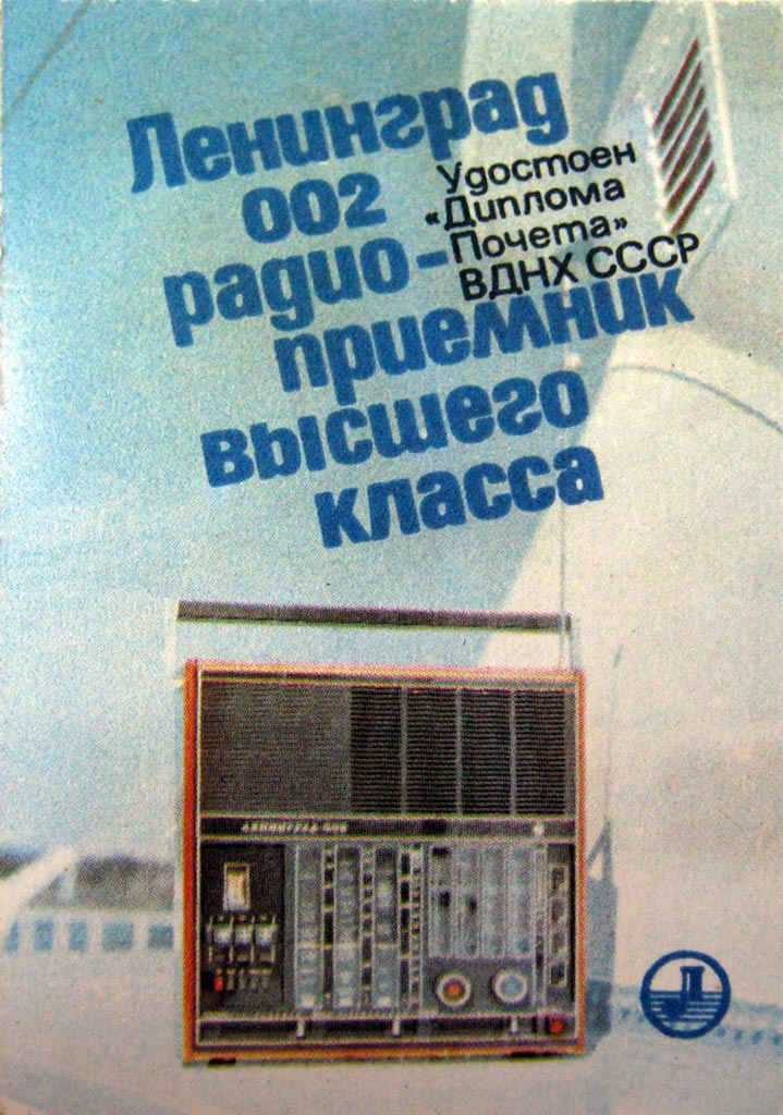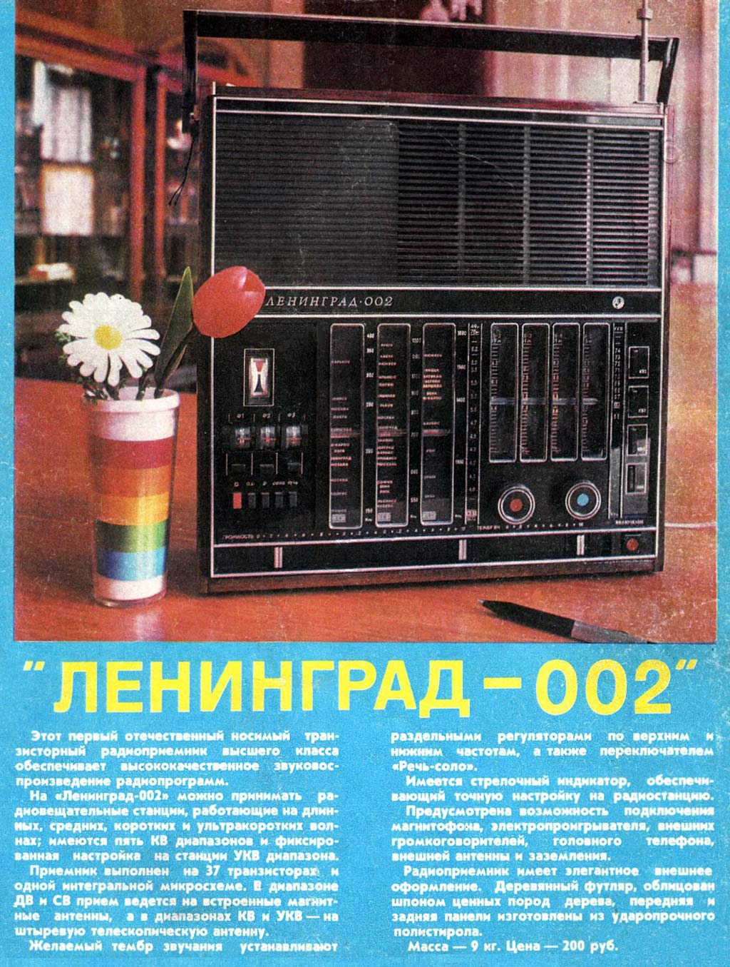 Портативный транзисторный радиоприёмник *Ленинград-002* с осени 1974 года выпускал Ленинградский завод *Радиоприбор*. Первый отечественный переносной приёмник высшего класса **Ленинград-002** обеспечивает высококачественное прослушивание программ радиостанций. Есть возможность зафиксировать настройку на три радиостанции в УКВ диапазоне. Есть регуляторы тембров ВЧ и НЧ, переключатель речь-соло, стрелочный индикатор уровня сигнала и питания, две шкалы настройки. Есть гнёзда для подключения магнитофона на запись, электропроигрывателя, для прослушивания через усилитель приёмника, АС, внешней антенны, заземления и головных телефонов. Радиоприёмник собран на 36 транзисторах и 1-й микросхеме. Деревянный корпус облицован шпоном ценных пород, передняя и задняя стенки изготовлены из полистирола. Масса приёмника без элементов - 9 кг.