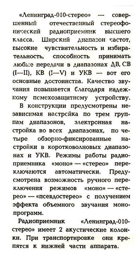 Стереофонический радиоприёмник *Ленинград-010-стерео* с 1979 года выпускал Ленинградский завод *Радиоприбор*. Радиоприёмник **Ленинград-010-стерео** предназначен для приёма радиовещательных станций в диапазонах ДВ, CB-I, CB-II, пяти коротковолновых и УКВ-ЧМ. По параметрам приёмник соответствует требованиям ГОСТ 5651-76 на модели высшего класса, а по некоторым из них имеет и значительный запас. Высокая чувствительность достигнута в диапазонах ДВ и СВ применением 2-х отдельных магнитных антенн, в диапазоне УКВ симметричного вибратора из двух телескопических антенн, в диапазонах KB они включаются параллельно с использованием балансных смесителей каскадов. Высокая селективность обеспечивается многоконтурным ФСС и двумя пьезокерамическими фильтрами. Приёмник имеет три раздельные группы шкал с отдельными ручками для настройки. Предусмотрена и возможность фиксированной настройки на 4 заранее выбранные станции в диапазоне УКВ и такое же число станций в поддиапазонах КВ. Во всех диапазонах возможна бесшумная настройка. Автоматическая подстройка частоты (КВ, УКВ) включается нажатием на соответствующую ручку настройки, причём после этого настройка этой ручкой становится невозможной. В приёмнике имеются световые индикаторы приёма стереофонических передач и многолучевого приёма в диапазоне УКВ, стрелочные индикаторы точной настройки, напряженности поля и напряжения источника питания. Для улучшения звука моно-программ предусмотрен перевод усилителя приёмника в режим псевдостерео. К приёмнику можно подключить внешние антенны, магнитофон, проигрыватель, стереотелефоны. В АС применены широкополосные громкоговорители ЗГД-32. АС крепятся к корпусу и могут разнесены для улучшения стереоэффекта. Питание от 6 элементов А-373 и через встроенный БП от электрической сети. Чувствительность со входов внешних антенн, мкВ (с встроенными антеннами, мкВ/м), в диапазонах; ДВ - 50/800. СВ - 50/500. KB - 30/50. УКВ - 2,5/5. Селективность приёмника; дБ, по каналам: соседнему 70, зеркальному и другим побочным 50...100. Диапазон воспроизводимых частот, Гц, в диапазонах АМ при полосе пропускания: узкая 80...2400, средняя 80...4000, широкая 80...6300, ЧМ - 80...12500. Максимальная выходная мощность, Вт при питании от батарей 2х1,5, от сети 2х4. Потребляемая от сети мощность Вт, 25. Габариты приёмника с прикрепленными АС - 430х388х150 мм. Общая масса 9,5 кг. Розничная цена 375 рублей.