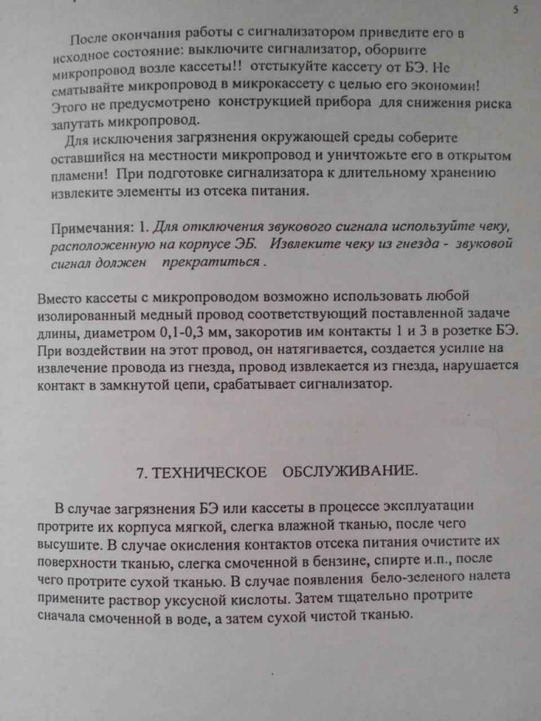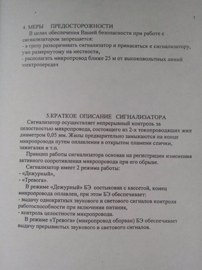 Сигнализатор обрывного типа *Лиана-1* выпускался предположительно с 1990 года. Изготовитель не установлен. Сигнализатор обрывного типа предназначен для обнаружения проникновения посторонних лиц на охраняемую территорию. Подаёт сигнал при обрыве тонкого микропровода. КРАТКОЕ ОПИСАНИЕ СИГНАЛИЗАТОРА Сигнализатор осуществляет непрерывный контроль за целостностью микропровода, состоящего из 2-х токопроводящих жил диаметром 0,05 мм. Жилы предварительно замыкаются на конце микропровода путем оплавления в открытом пламени спички, зажигалки и т.п.Принцип работы сигнализатора основан на регистрации изменения активного сопротивления микропровода при его обрыве.Сигнализатор имеет 2 режима работы: «Дежурный», «Тревога».В режиме «Дежурный» БЭ состыкован с кассетой, конец микропровода оплавлен, при этом БЭ обеспечивает:выдачу однократных звукового и светового сигналов контроля работоспособности при включении питания,контроль целостности микропровода. В режиме «Тревога» (микропровод оборван) БЭ обеспечивает выдачу прерывистых звукового и светового сигналов.
