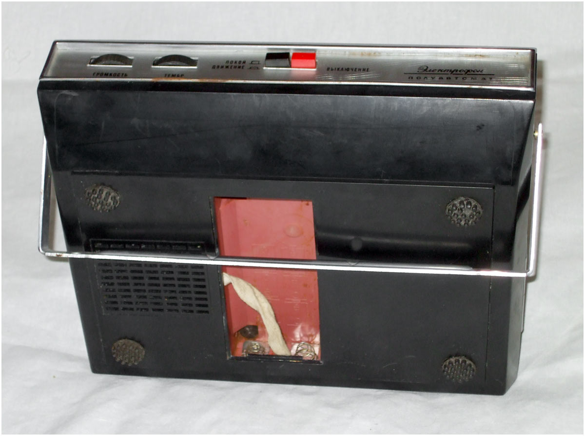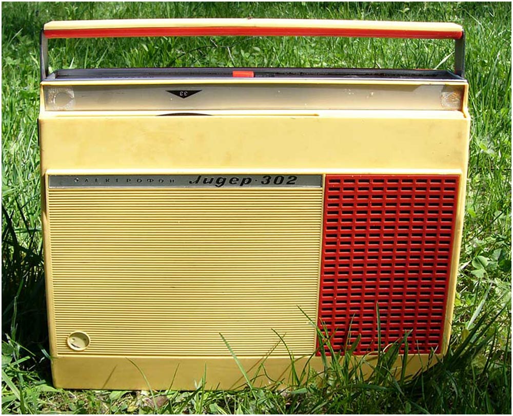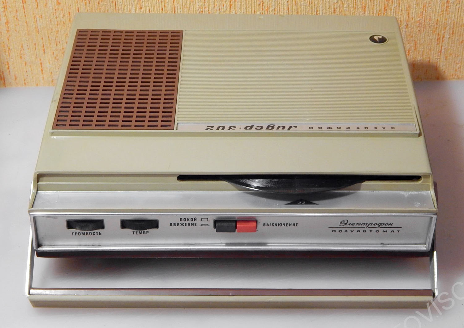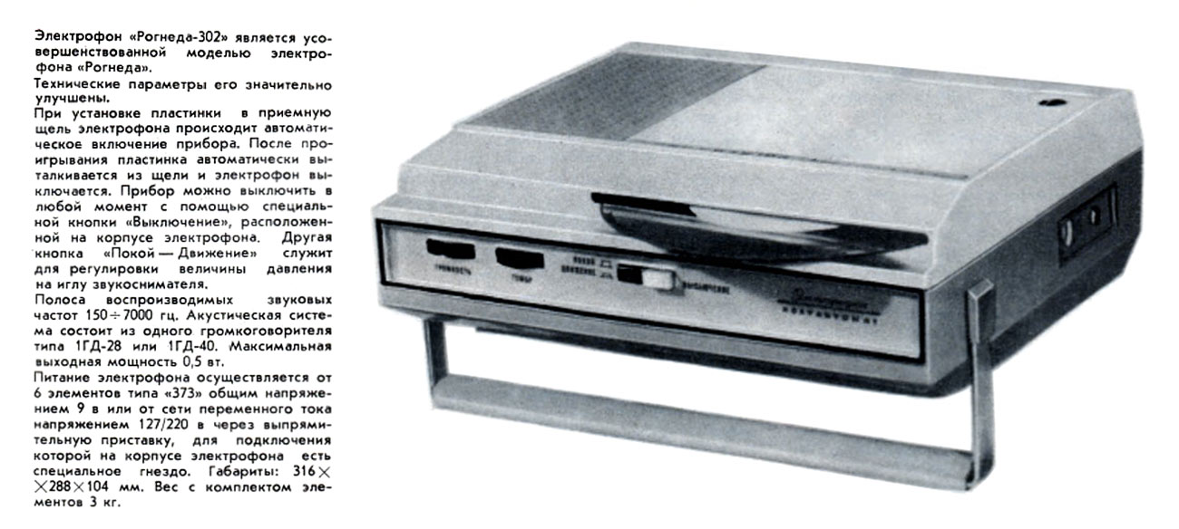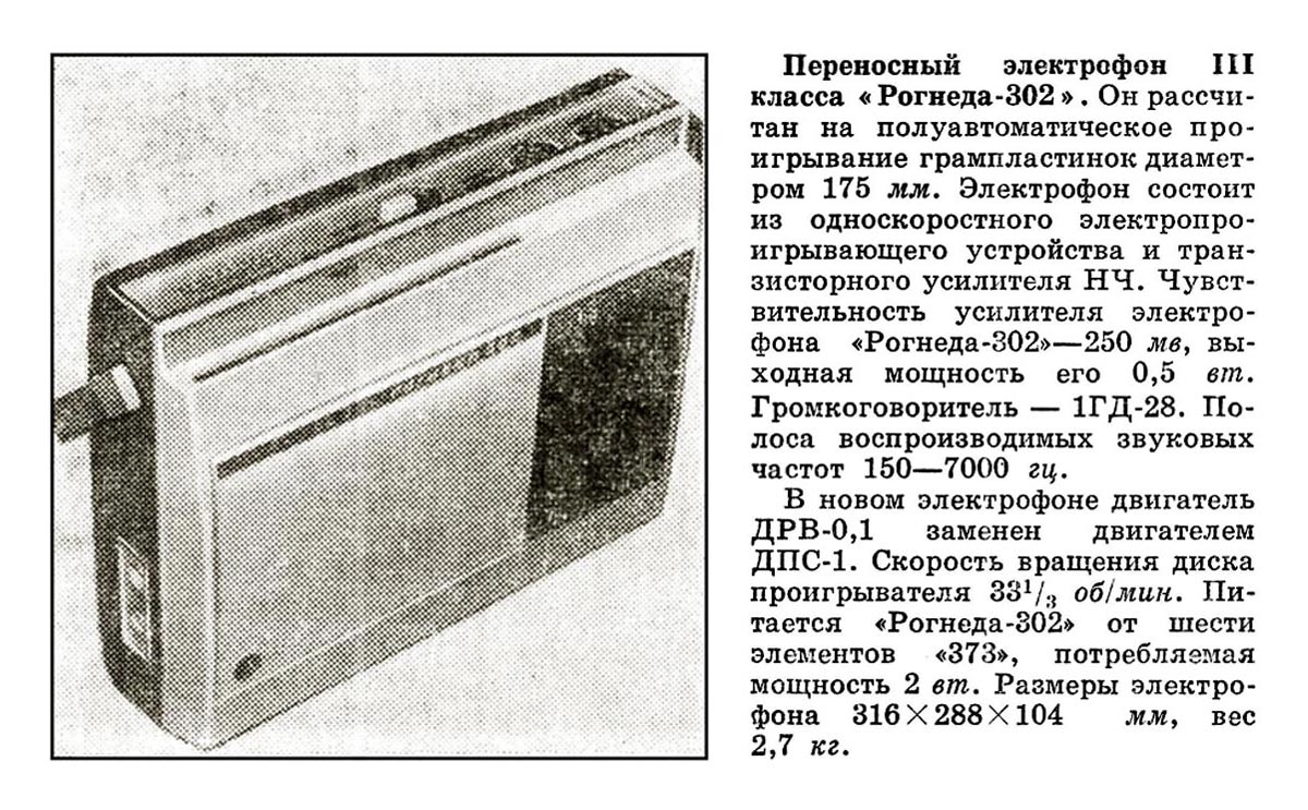Электрофоны портативные *Лидер-302* и *Рогнеда-302* с 1970 года выпускал Саратовский завод точной электромеханики. Переносные электрофоны 3-го класса **Лидер-302** и **Рогнеда-302** рассчитаны на полуавтоматическое проигрывание грампластинок, диаметром 175 мм в стационаре при умеренном движении. Любой электрофон состоит из электропроигрывателя и усилителя НЧ на транзисторах. Усилитель имеет чувствительность - 250 мВ, номинальную выходную мощность 0,5 Вт. В электрофонах применён громкоговоритель типа 1ГД-28. Полоса воспроизводимых звуковых частот 150...7000 Гц. Двигатель ДРВ-0,1 применённый в старой модели электрофона **Рогнеда** заменен на новый ДЛФ-1. Скорость вращения диска 33 об/мин. Питание электрофонов осуществляется от шести элементов А-373, потребляемая мощность не превышает 2 Вт. Размеры электрофона - 316х288х104 мм, масса - 2,7 кг. Конструкция, электрическая схема и внешний вид моделей одинакова. В двух наименованиях электрофоны выпускали для расширения ассортимента продукции.