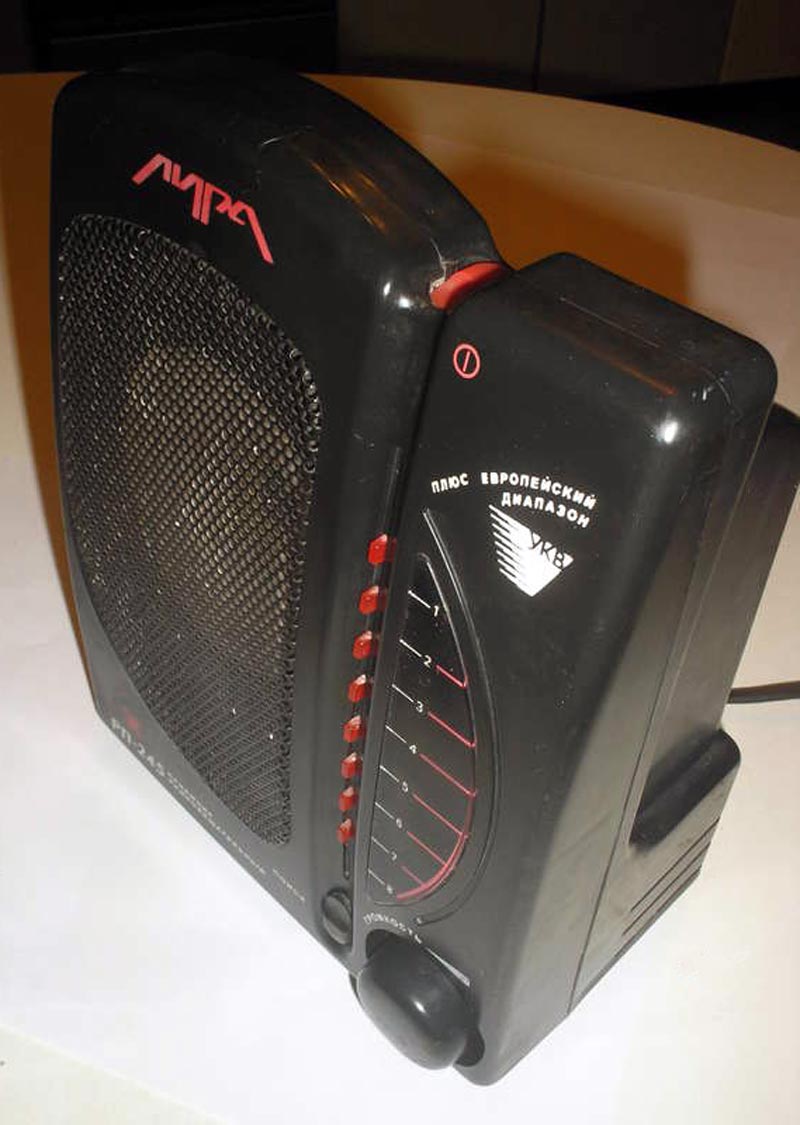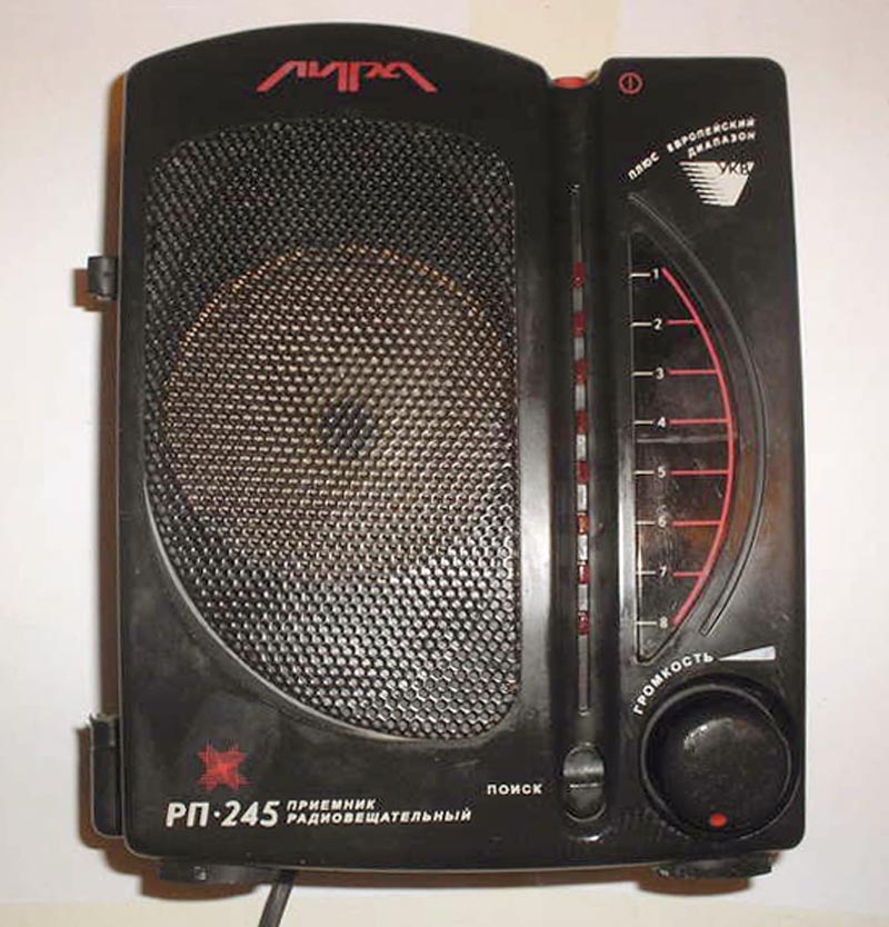 Стационарный УКВ радиоприёмник *Лира РП-245* с 1992 года выпускало ДООО *Ижрадио*. Приёмник предназначен для приёма радиостанций в УКВ диапазоне 65,8...108 МГц, разбитом на два поддиапазона. Высокая чувствительность позволяет на съёмную телескопическую антенну вести приём на большом удалении от радиостанций. Приёмник имеет 8 фиксированных настроек, каждая из которых может работать в любом из поддиапазонов в зависимости от установки перемычки. Имеется светодиодная индикация выбранной настройки. Имеется разъёмы для подключения внешней антенны и внешнего источника питания. Питание приёмника осуществляется от сети переменного тока. Технические характеристики РП: Чувствительност в обоих поддиапазонах - 5 мкВ. Максимальная выходная мощность 1 Вт. Диапазон воспроизводимых частот по звуковому давлению 315...6300 Гц (реально 150...8000 Гц). Габариты приёмника 181х222х108 мм. Вес 1,5 кг.