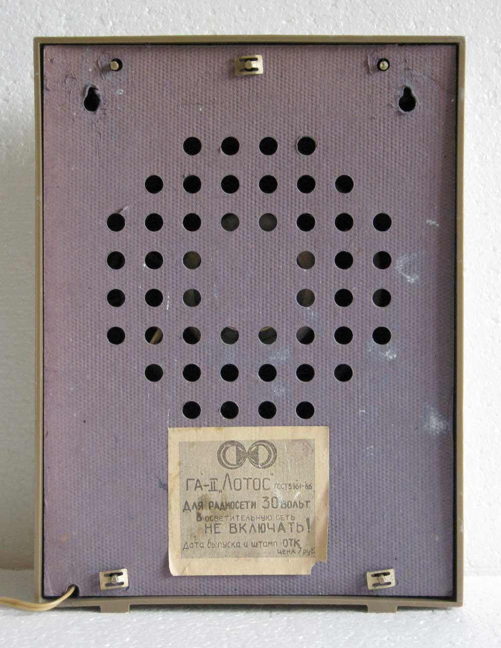 Абонентский громкоговоритель "Лотос" с 1972 года выпускал Гжатский завод радиодинамиков. Абонентский громкоговоритель "Лотос" - модель второго класса, он отличается от массы других АГ улучшенными потребительскими свойствами. В модели используется головка прямого излучения 2ГД-21П. По сравнению с другими моделями "Лотос" имеет большую выходную мощность и более широкую полосу рабочих частот звука, отсюда и улучшенное качество звучания. Номинальная рабочая мощность 0,25 Вт. Среднее звуковое давление 0,25 Па. Диапазон воспроизводимых частот 100...6300 Гц. Неравномерность АЧХ - 15 дБ. Входное сопротивление 6 кОм. КНИ - 7%. Габариты модели 305х223х104 мм. Масса 1,5 кг.