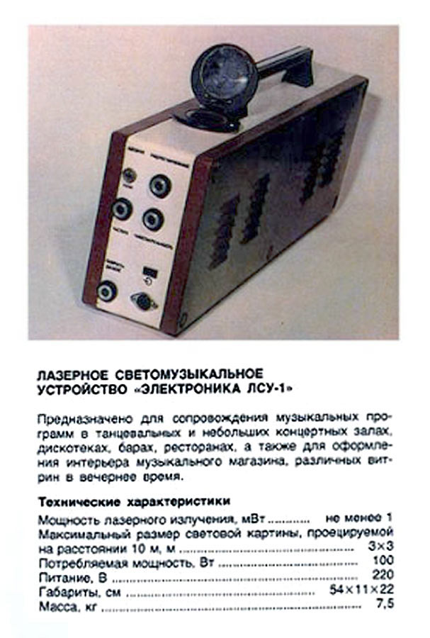 Лазерное светомузыкальное устройство *ЛСУ-1* выпускалось с 1986 года. Информация только в рекламном проспекте.
