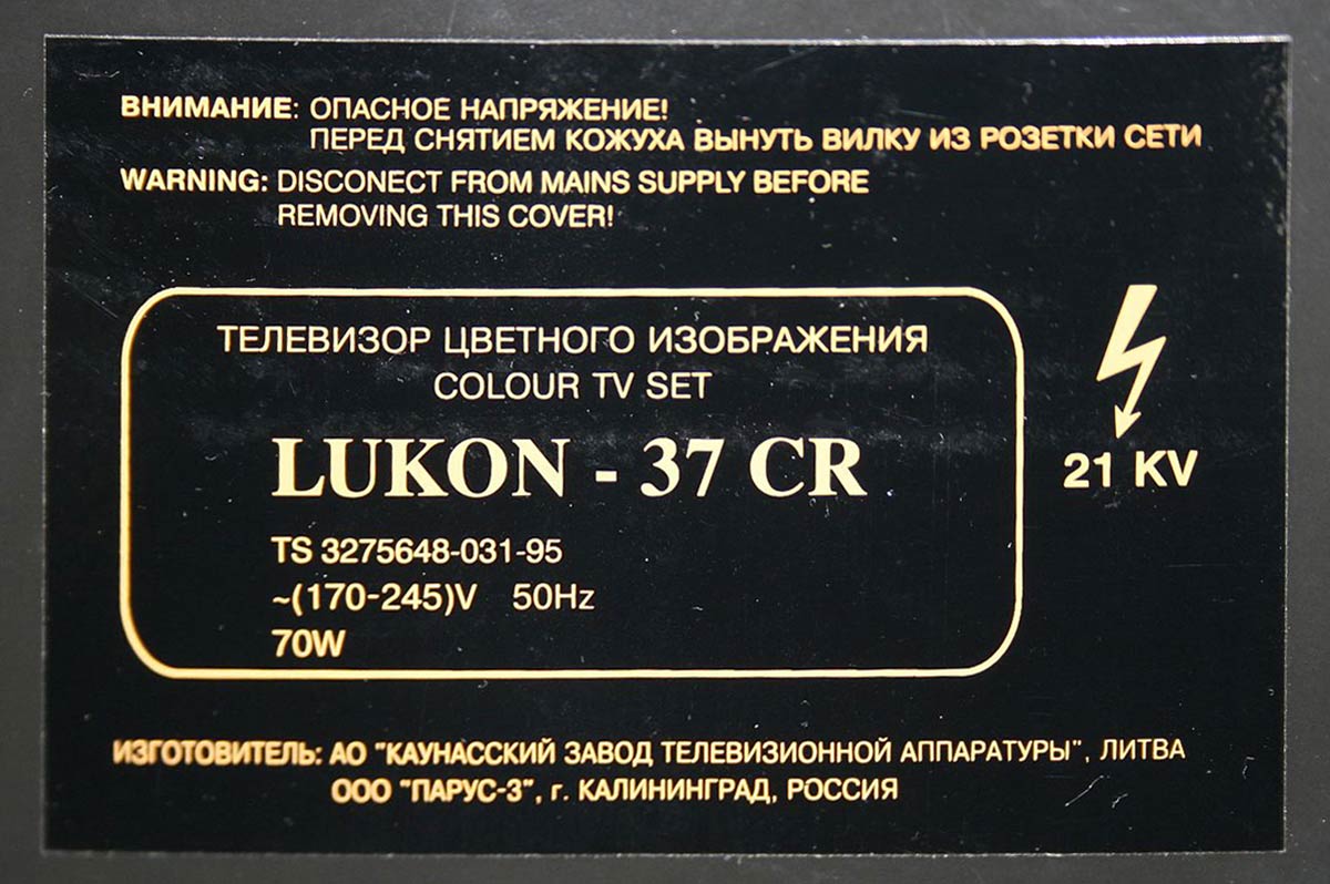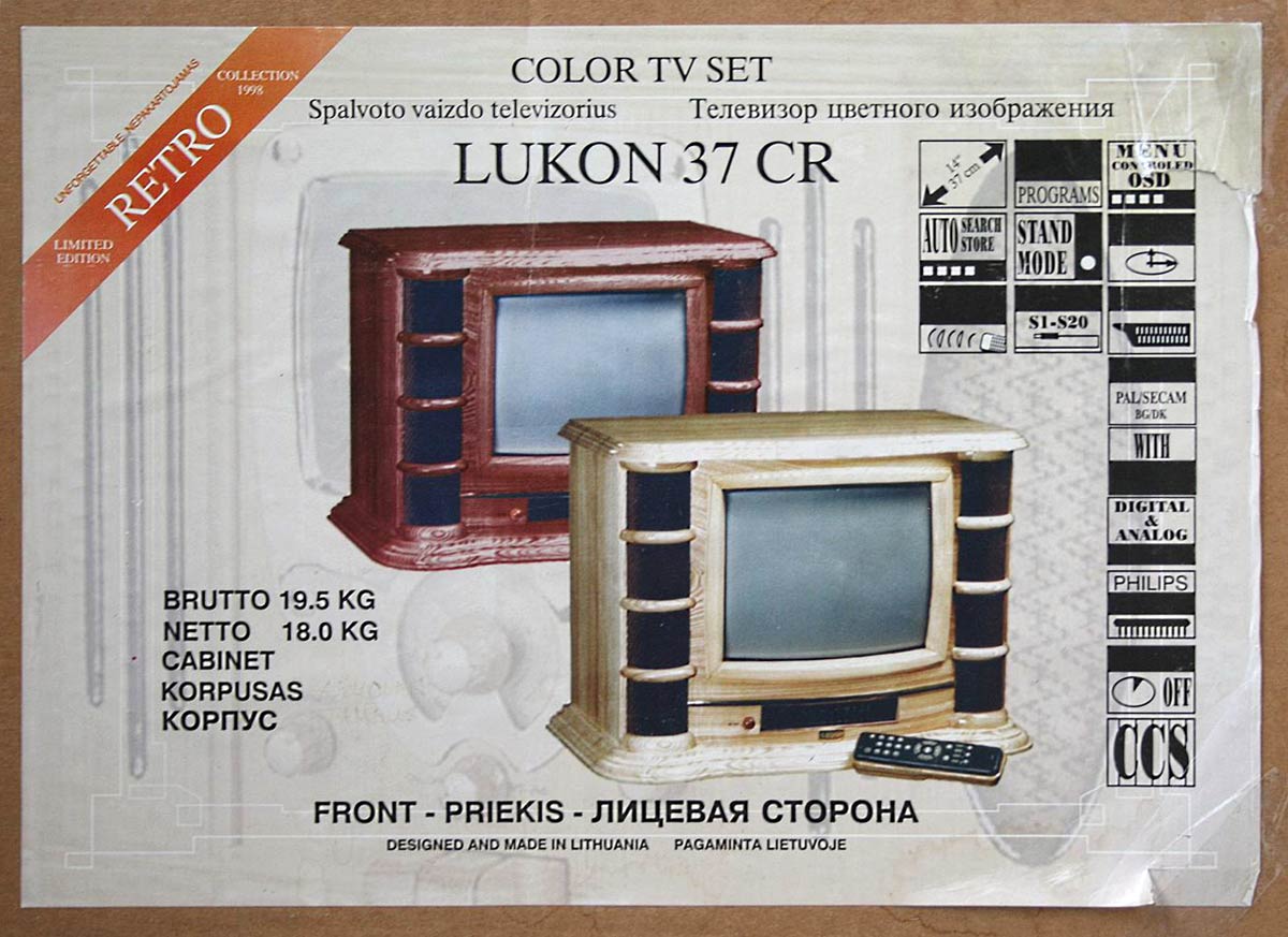 Малогабаритный цветной телевизор *LUKON-37CR* выпускался ограниченной серией с 1997 по 2002 годы АО *Каунасский завод телевизионной аппаратуры*, филиалом *SELEKA*, Каунас и ООО *Парус-3* в городе Калининграде. Когда в 1995 году прекратил своё существование Каунасский радиозавод, работники стараясь как-то выжить создали несколько филиалов, одним из которых был *SELEKA*. В нём для *новых русских* стали штучно изготавливать телевизоры в деревянных корпусах (дуб) стиля *РЕТРО* марок *LUKON* и SILELIS*. Телевизор *LUKON-37CR* работает в диапазонах МВ и ДМВ. Диагональ экрана 37 сантиметров. Имеется пульт дистанционного управления. Питание от сети переменного тока 170...240 вольт. Габариты телевизора 595x415x415 мм. Масса модели 18 кг. Для внутреннего рынка телевизоры именовались как *SILELIS-37CR*, на экспорт как *LUKON-37CR*. Стоили телевизоры очень дорого по тем временам.