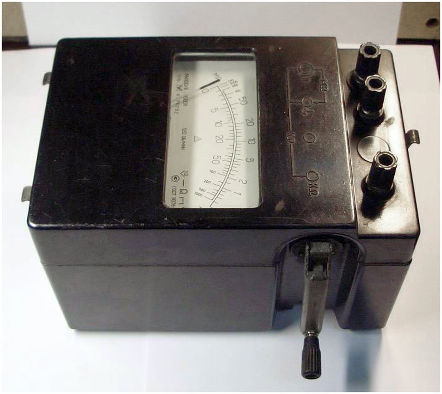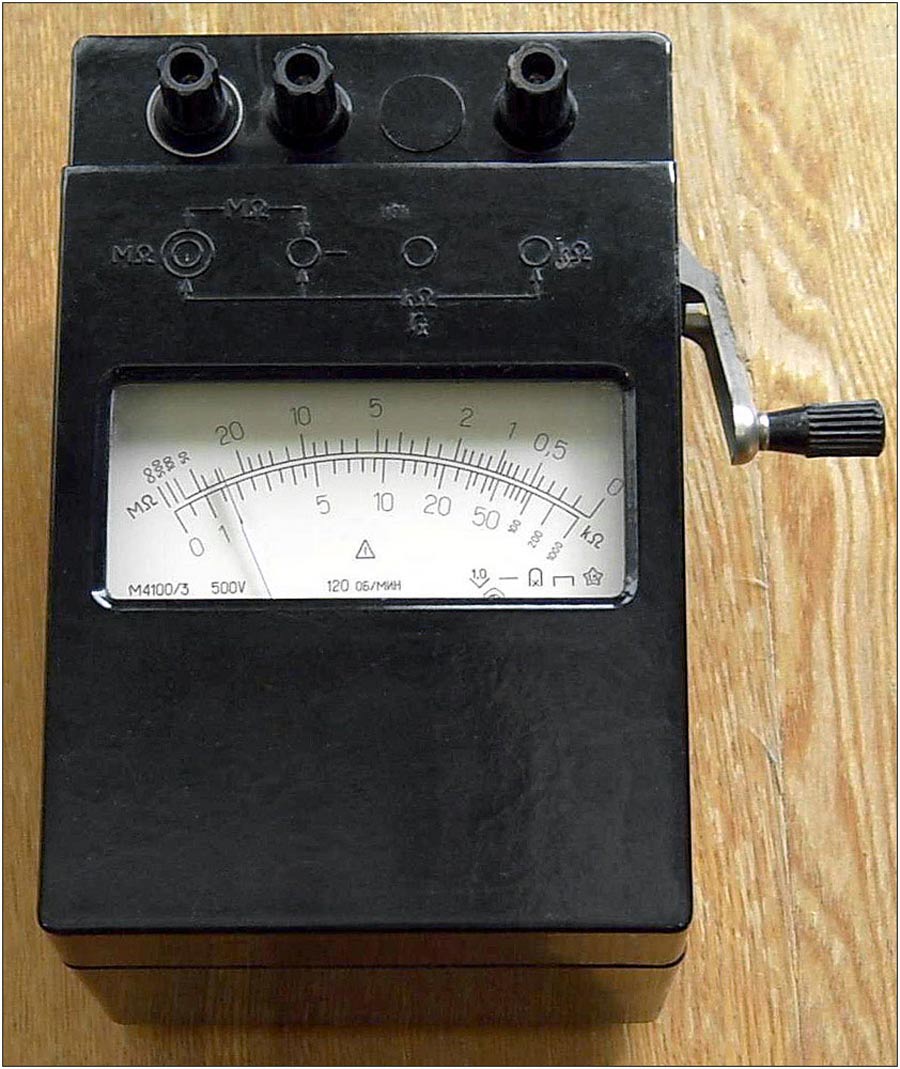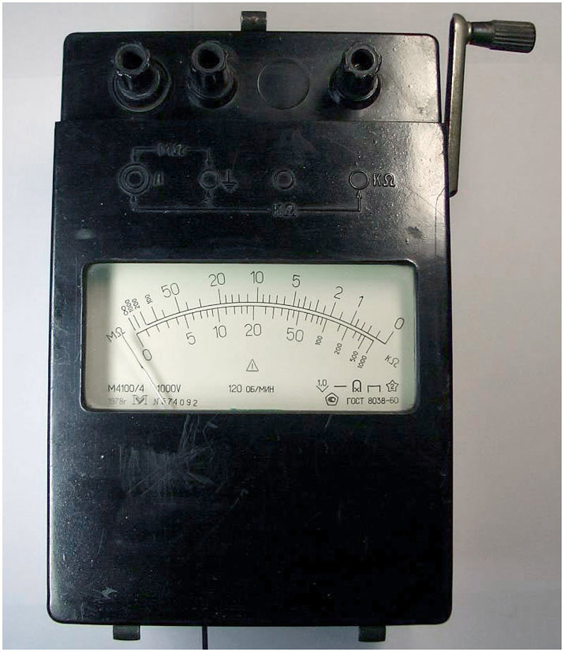 Мегаомметр *М4100* выпускал с 1976 года Уманьский завод *Мегомметр*. Портативный мегаомметр *М-4100** выпускался в пяти вариантах по выходному напряжению и наибольшему значению измеряемого сопротивления. Мегаомметр *М4100* является двухпредельным переносным прибором и предназначен для измерения сопротивления изоляции обесточенных электрических цепей на пяти пределах.