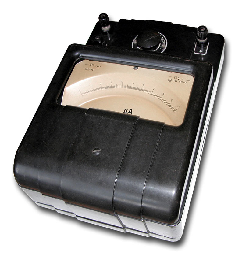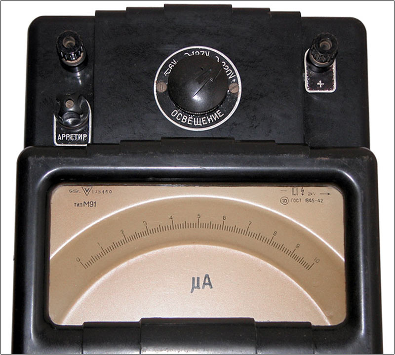 Микроамперметр *М-91* с 1949 года выпускал Ленинградский завод *Вибратор*. Прибор выполнен на базе гальванометра М-91 и отличаются от него лишь пределами измерений и параметрами измерительного механизма (противодействующим моментом растяжек и возможно, намоточными данными рамки). Микроамперметр выпускалcя на пределы измерений: 0 – 1; 0 – 3; 0 – 10; 0 – 30; 0 – 100 мка. Класс точности 1,0. Диапазон рабочих температур от +10 до +350С. Изменение показаний прибора от ухода температуры в сторону от нормальной (+200С) не превышает - /+ 0,5% от верхнего предела шкалы на каждые 10 градусов.Противодействующий момент растяжек на прибор 0–10 мка ...0,4 мг*см/900 на длину 100 мм. Существовал вариант прибора отличающийся от представленного на фото – у него питание лампочки осветителя подавалось не через штепсельный разъем в верхнем торце корпуса (на фото не показан), а через шнур с вилкой, вмонтированный непосредственно в переключатель родов питания на лицевой панели. Цена прибора 540 руб (по прейскуранту 1954 года).