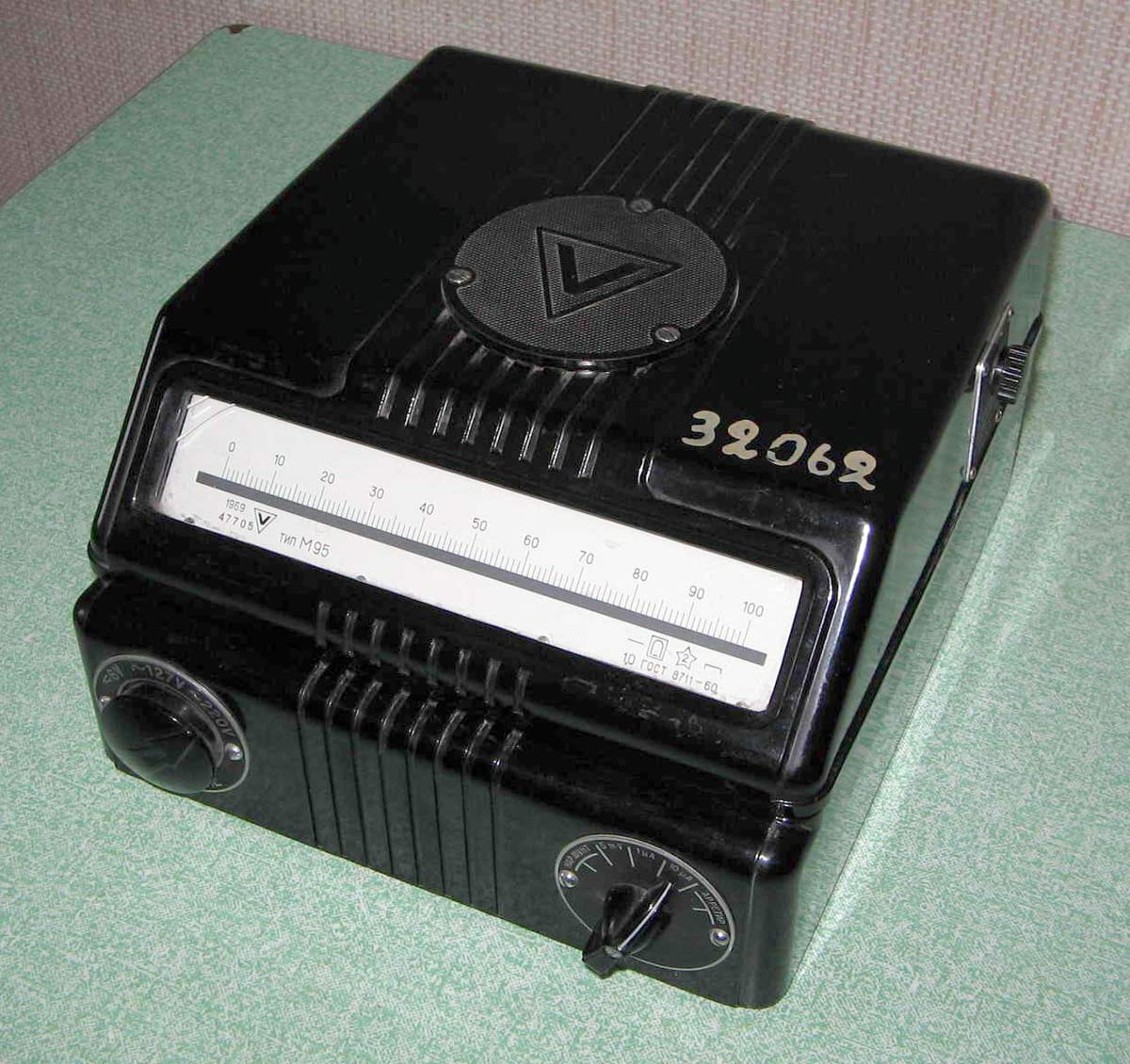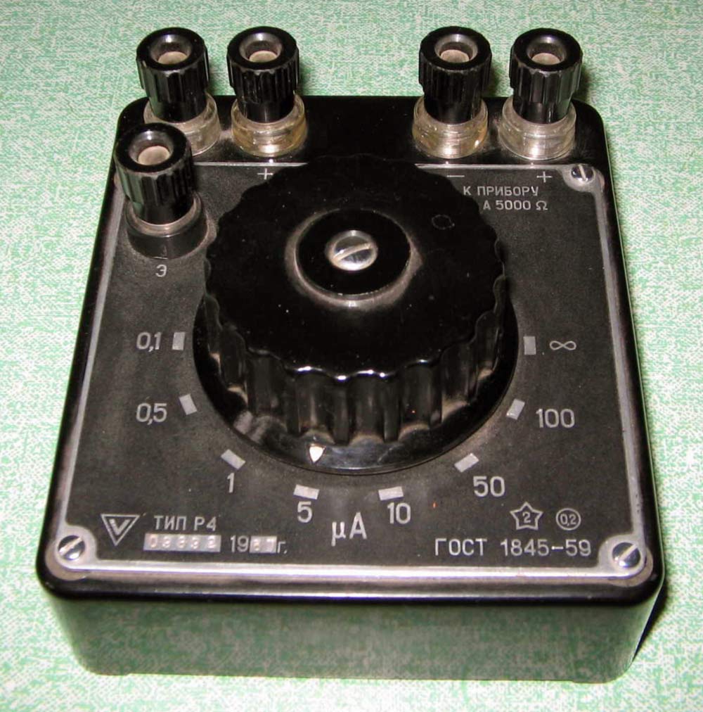 Микроамперметр *М-95* с комбинированным шунтом *Р-4* выпускался с 1967 года. Представляет собой переносной лабораторный двухпредельный по току и однопредельный по напряжению прибор, предназначенный для измерения очень малых величин тока и напряжения в цепях постоянного тока. Класс точности: 1,0. Педел измерения 0,1; 1 и 10 микроампер. Габариты *М-95* - 213х122х270 мм. Вес 3,6 кг. Габариты *Р-4* - 126х110х62 мм. Вес 0,6 кг. Длина шкалы 140мм.