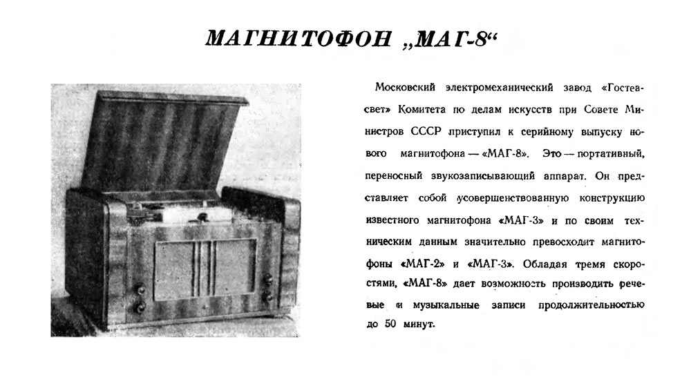 Сетевой катушечный магнитофон *МАГ-8* с 1950 года выпускал Московский завод *Гостеасвет*. Полустудийный катушечный магнитофон **МАГ-8** создан на основе серийного магнитофона **МАГ-3**. Магнитофон **МАГ-8** имеет три скорости протяжки магнитной ленты; 76, 38 и 19 см/с. Он предназначен для записи и проигрывания уже заранее записанных однодорожечных программ звука. Магнитная лента применяется типа **1**, наматанная на специальных сердечниках. Полный сердечник содержит 500 метров ленты. Время записи или воспроизведения соответственно; 10, 21 и 42 минуты. В магнитофоне используются раздельные усилители записи и воспроизведения, что позволяет контролировать качество фонограмм непосредственно во время записи. В электрической схеме магнитофона применены семь радиоламп. В АС установлены два громкоговорителя типа 3ГД-2. Рабочий диапазон записываемых или воспроизводимых частот на большей скорости - 40...12000 Гц на средней - 50...7000 Гц и на меньшей - 60...4000 Гц. Усилитель магнитофона имеет номинальную выходную мощность 3 Вт, максимальную 7 Вт. Коэффициент нелинейных искажений тракта записи 3%, тракта воспроизведения при номинальной выходной мощности 5%. В лентопротяжном механизме применены 3 асинхронных конденсаторных электродвигателя. Питание магнитофона осуществляется от электрической сети. Потребляемая мощность при записи 250 Вт, при воспроизведении 280 Вт. Футляр магнитофона изготовлен из дерева с иммитацией ценных пород, полирован. Масса магнитофона 50,5 кг. Магнитофон **МАГ-8** выпускался заводом до начала 1955 года, а ещё в 1952 году его производство было передано и на Горьковский завод им. Петровского, где после модернизации он выпускался в железном корпусе, под наименованием **МАГ-8М**.