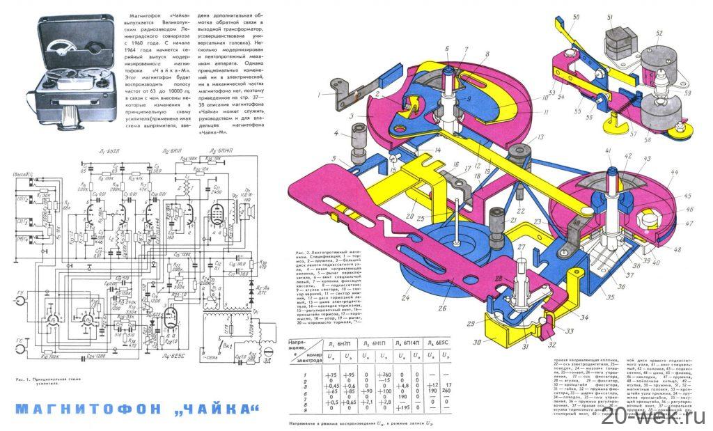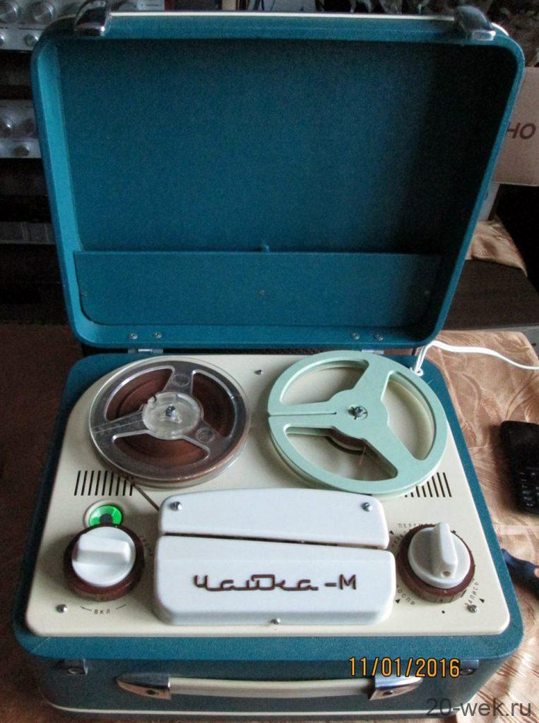 Магнитофоны "Чайка" и "Чайка-М" выпускал с 1960 и 1964 года Великолукский радиозавод. ''Чайка'' - модернизация модели "Чайка" 1956 года. Он служит для записи и воспроизведения фонограмм. Скорость 9,53 см/сек. Катушки вмещают 240 м. магнитной ленты. Запись 2-х дорожечная, длительность записи 40 мин. При использовании ленты типа 2 или СН полоса рабочих частот 40...6000 Гц. Номинальная выходная мощность 1 Вт. В магнитофоне применены 4 радиолампы. Корпус из гнутой фанеры, облицован синтетическим пластиком. Потребляемая мощность 60 Вт. Габариты модели 340х270х180 мм, вес 12 кг. Магнитофон ''Чайка-М'' имеет отличия в схеме и конструкции. На ленте типа 2 или СН полоса частот 40...10000 Гц. Потребляемая от сети мощность 75 Вт. Радио №1/1964 Доработка Радио №1/1966, ст.42