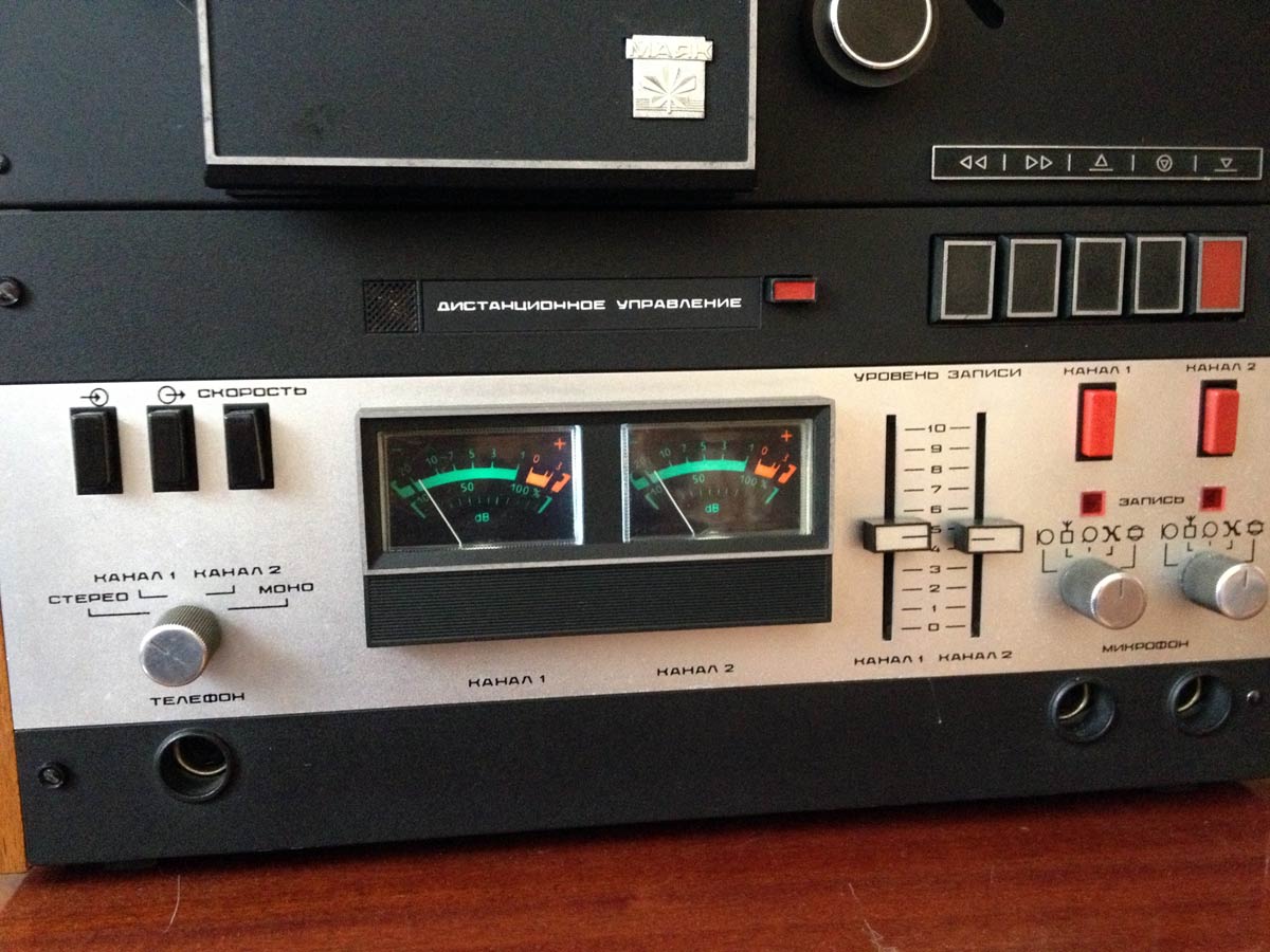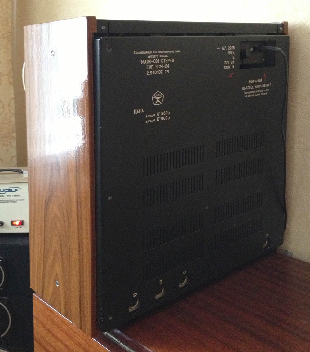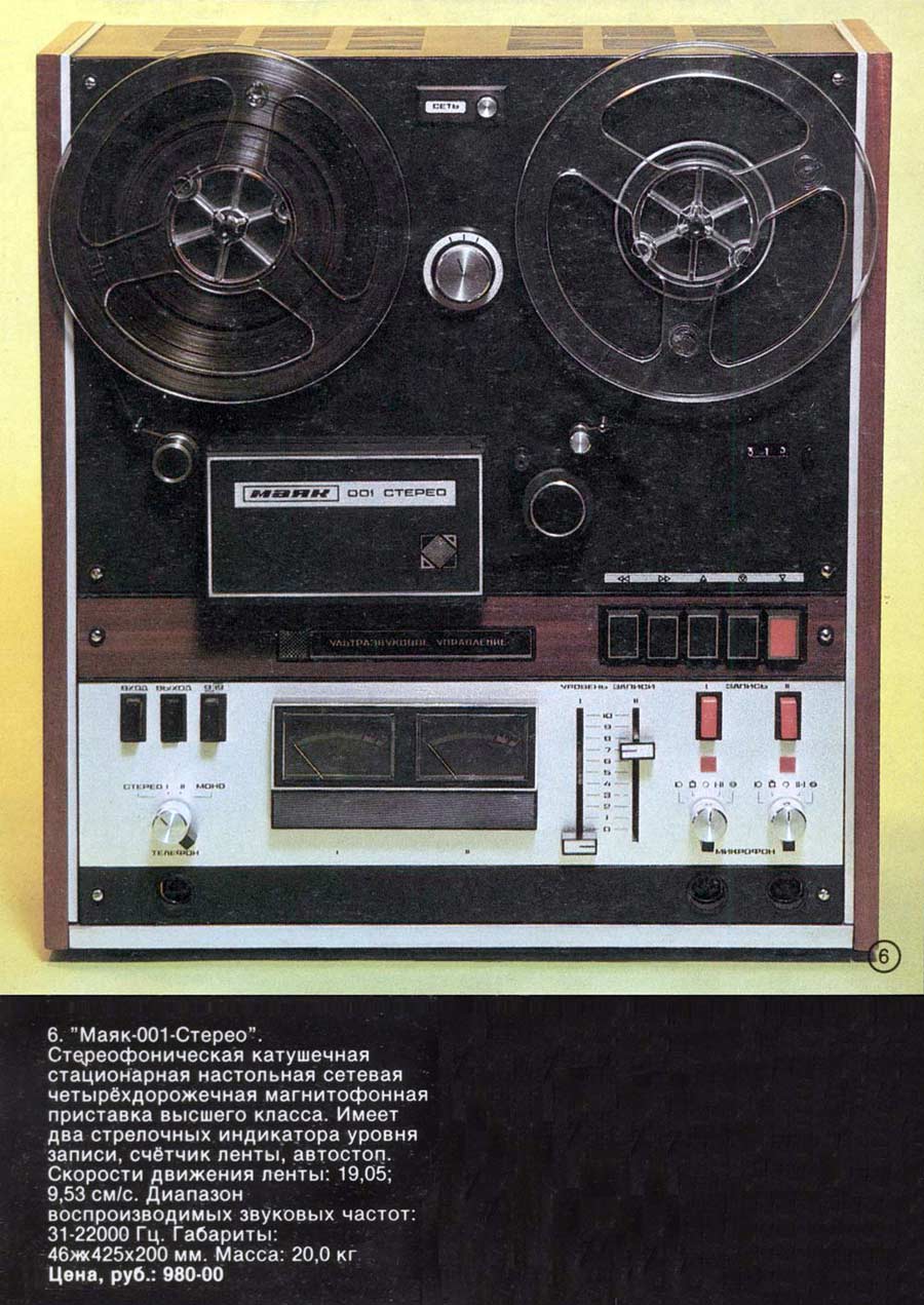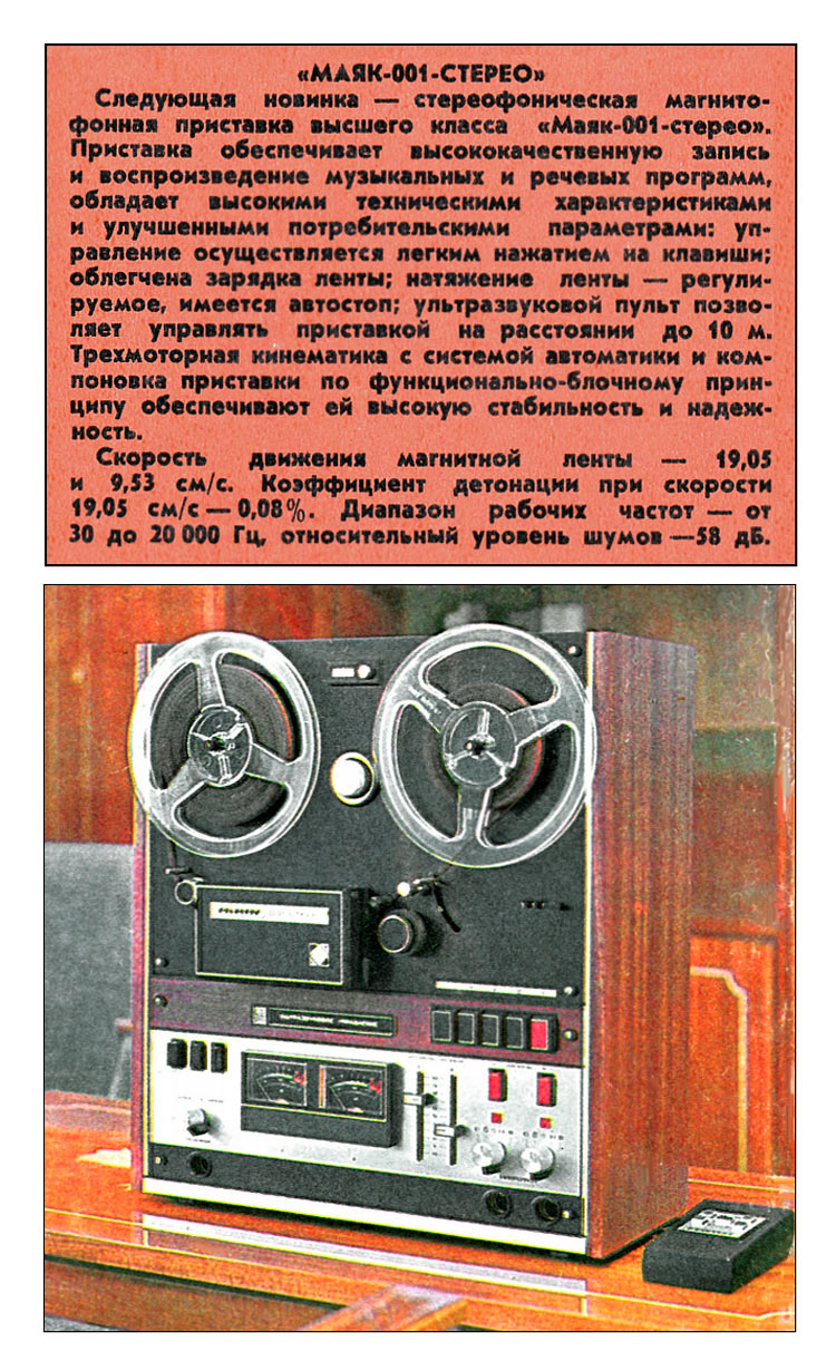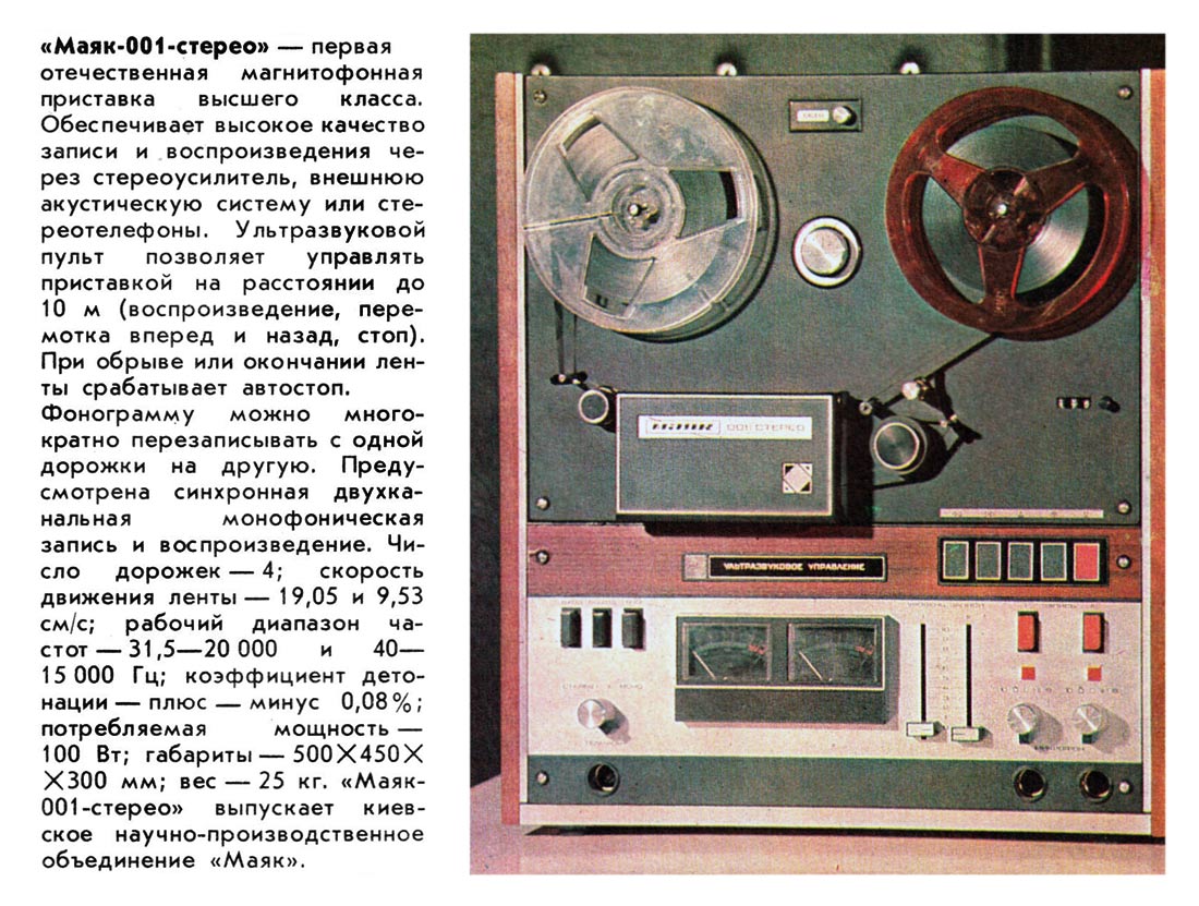 Сетевая катушечная магнитофон-приставка *Маяк-001-стерео* с начала 1973 года выпускалась Киевским заводом *Маяк*. МП обеспечивает запись и воспроизведение моно и стереофонических фонограмм. Возможна многократная перезапись с одной дорожки на другую, с наложением новой записи на имеющуюся и синхронная запись по разным входам. Есть контроль записи на стереотелефоны и индикация уровней по стрелочными индикаторам при движущейся или неподвижной магнитной ленте. Имеется возможность ДУ всеми режимами ЛПМ, а наличие счётчика метража ленты и автостопа увеличивает возможности аппарата. В МП две скорости протяжки ленты: 19,05 и 9,53 см/сек. Диапазон частот на ЛВ на высшей скорости 31,5...20000 Гц. На низшей скорости 31,5...16000 Гц. Коэффициент детонации ЛПМ соответственно 0,1 и 0,2%. Габариты МП - 425х460х200 мм, масса 20 кг. Вес пульта для управления 300 грамм. В 1980 году у магнитофона-приствки были улучшены технические параметры и ей был присвоен знак качества.
