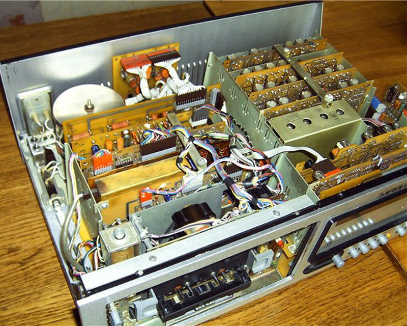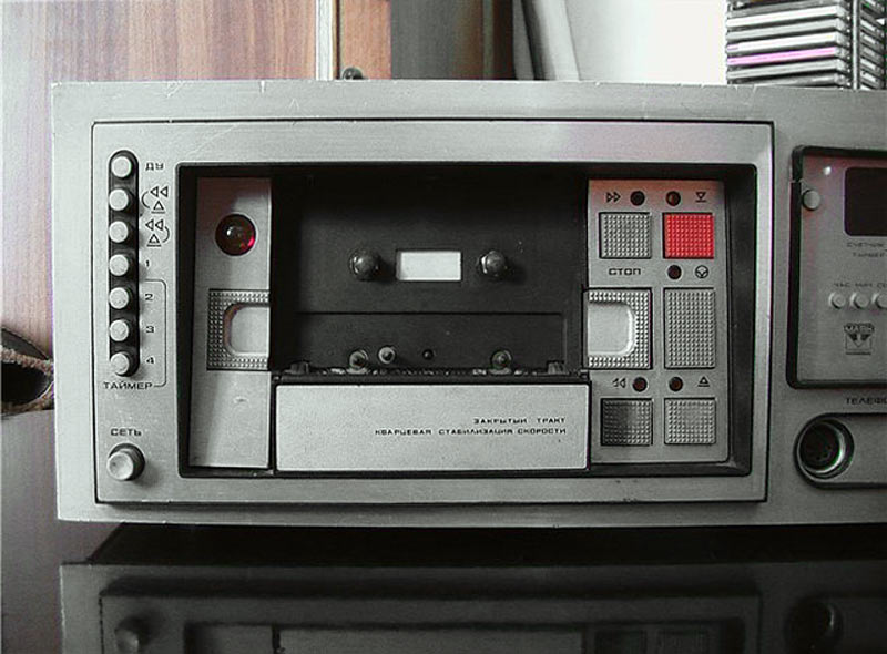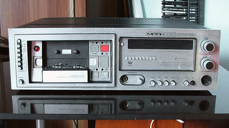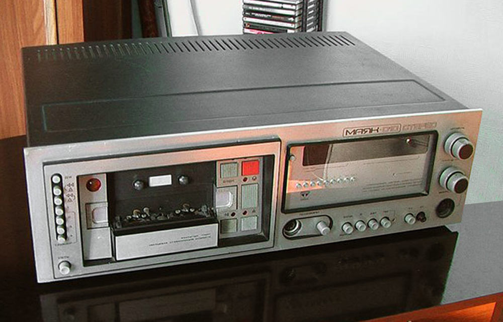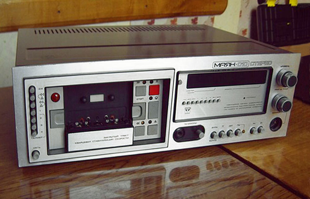 Магнитофон-приставка *Маяк-010-стерео* с I-кв 1983 года выпускалась Киевским заводом *Маяк*. Магнитофон-приставка **Маяк-010 стерео** предназначен для высококачественной записи и воспроизведения моно и стереофонических музыкальных и речевых программ на магнитных лентах А4212-3Б и А4205-3, размещенных в кассетах МК-60/90. МП предназначен для совместной работы с внешним усилителем или УКУ с АС и обеспечивает запись с микрофона, пьезоэлектрического звукоснимателя, радиоприёмника, другого магнитофона, телевизора; воспроизведение записей; стирание записи; перемотку ленты; индикацию уровня записи с возможностью раздельного и синхронного регулирования; автоматический останов по окончании ленты; временный стоп; подключение стереотелефонов; электронный счетчик расхода ленты; компандерную систему шумопонижения. МП обеспечивает функции: микширование сигналов с микрофонного и основного входов; возможность применения двух типов магнитных лент А4205-3 Fe; А4212-3Б Сг; индикацию уровня записи средних и пиковых значений люминесцентным индикатором; контроль уровня воспроизведения; контроль записываемого или записанного сигнала на ЛВ; регулировку уровня громкости на стереотелефонах; запись паузы на движущейся ленте (Редактор); автоматическую подстройку записи по токам записи и подмагничивания; световую индикацию включения в сеть; световую индикацию режимов работы ЛПМ; работу с внешним таймерным устройством; работу со встроенным таймером осуществляющим: индикацию текущего времени; коррекцию времени; измерение временных интервалов; выключение магнитофона по заданному времени; работу магнитофона в заданном интервале времени; беспроводное инфракрасное ДУ режимами ЛПМ; кварцевую стабилизацию скорости движения магнитной ленты; квазисенсорное управление режимами ЛПМ; возможность работы с лентами толщиной 9 и 12 мкм; возможность работы ЛПМ в режиме Память по электронному счетчику; работа ЛПМ в автоматическом режиме. Питается приставка от сети. Потребляемая от сети мощность 55 ВА. Коэффициент детонации ±0,15%. Диапазон частот на ЛВ: 40...14000 Гц с лентой А4206-3 и 31,5...18000 Гц с А4213-3Б. Коэффициент гармоник на ЛВ 1,5%. Относительный уровень шумов и помех в канале записи-воспроизведения -58 дБ, с компандерной системой ШП -80 дБ. Чувствительность основного входа 200 мВ, микрофона 0,08 мВ. Напряжение ЛВ - 500 мВ. Габариты МП - 460x340х150 мм. Масса МП - 10 кг.