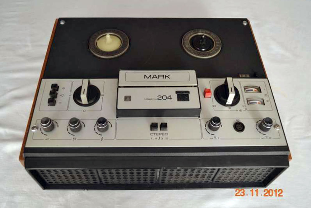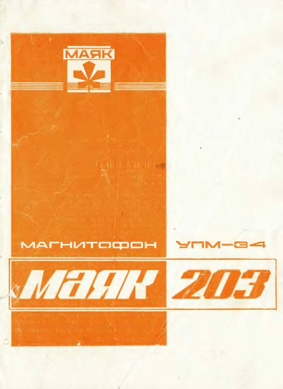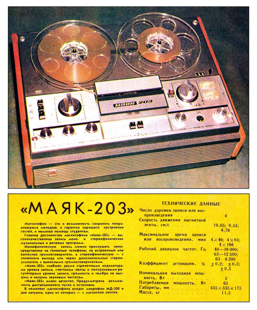 Катушечный магнитофон *Маяк-203* с осени 1976 года выпускал Киевский завод *Маяк*. Предназначен для записи и воспроизведения фонограмм с применением магнитной ленты типа 10. Позволяет производить запись (моно/стерео) с микрофона, звукоснимателя, радиоприёмника, телевизора, радиолинии и другого магнитофона и воспроизведение стерео-фонограмм в моно режиме, а на головные стереотелефоны в стерео. Уровень записи контролируется стрелочными индикаторами, а качество прослушиванием. Магнитофон выполнен переносной конструкцией в деревянном корпусе. В АС стоит две головки 1ГД-40Р. Магнитофон питается от сети, потребляя мощность 65 Вт. Скорость ленты 19,05, 9,53 и 4,76 см/с. Диапазон частот при скорости 19,05 см/с - 40...18000 Гц, 9,53 см/с - 63...12500 Гц, 4,76 см/с - 63...6300 Гц. Длительность записи на 4-х дорожках при использовании катушки №18 с лентой А4407-6Б (525 м) на скорости 19,05 см/с 3 часа, 9,53 см/с 6 часов, 4,76 см/с 12 часов. Номинальная выходная мощность на внутренней АС - 2 Вт, на внешней АС - 4 Вт. Габариты магнитофона 165х432х332 мм. Масса 12,5 кг. Для увеличения ассортимента продукции завод одновременно выпускал и магнитофон *Маяк-204*, который кроме изменений в своём оформлении был полным аналогом магнитофона *Маяк-203*.