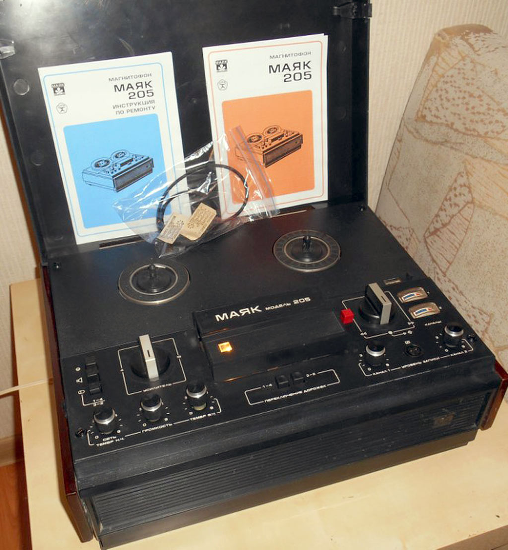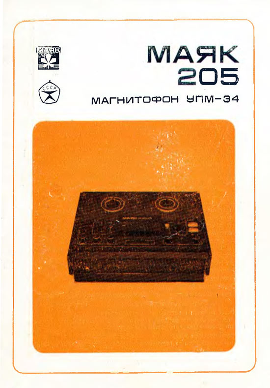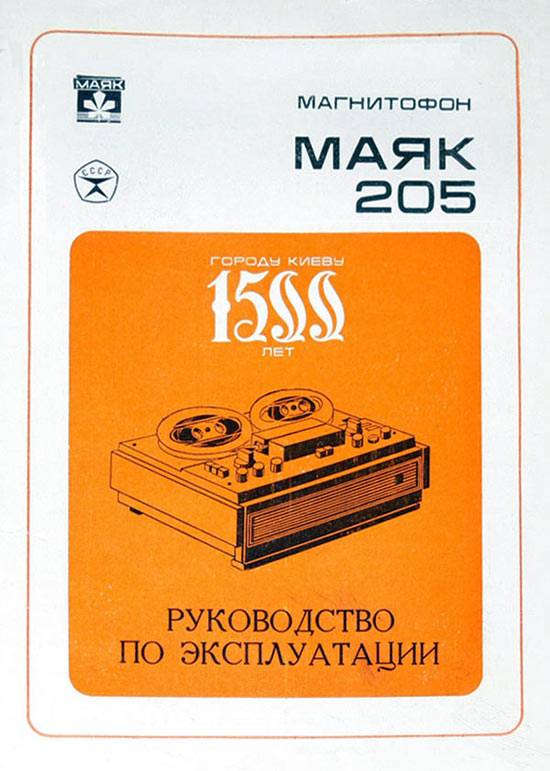 Катушечный (стереофонический до ЛВ) магнитофон *Маяк-205* с начала 1979 года выпускал Киевский завод *Маяк*. Предназначен для записи фонограмм на магнитной ленте и их воспроизведение на собственную или внешнюю АС, а так же на головные телефоны. В магнитофоне предусмотрены: раздельная регулировка уровня записи; ускоренная перемотка ленты; временный останов ленты; автоматический стоп ленты при окончании и обрыве; контроль уровня записи раздельно по каналам при неподвижной и движущейся ленте; регулировка тембра по ВЧ и НЧ; регулировка громкости с тонкомпенсацией; счётчик расхода магнитной ленты; использование магнитофона в качестве УЗЧ; отключение головок; ДУ пуском и остановом. Скорости: 19,05, 9,53 и 4,76 см/сек. Диапазон рабочих частот соответственно: 40...18000, 63...12500, 63...6300 Гц. Уровень шумов и помех в каналах ЗВ -44/42 дБ. КНИ 3%. Номинальная выходная мощность 2, на внешнюю АС - 4 Вт, максимальная 4 и 8 Вт. Потребляемая от сети мощность 65 Вт. Габариты модели 432х338х165 мм. Масса 12,5 кг.