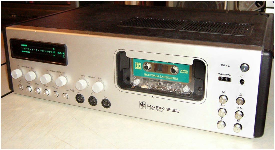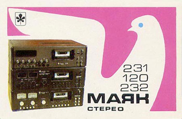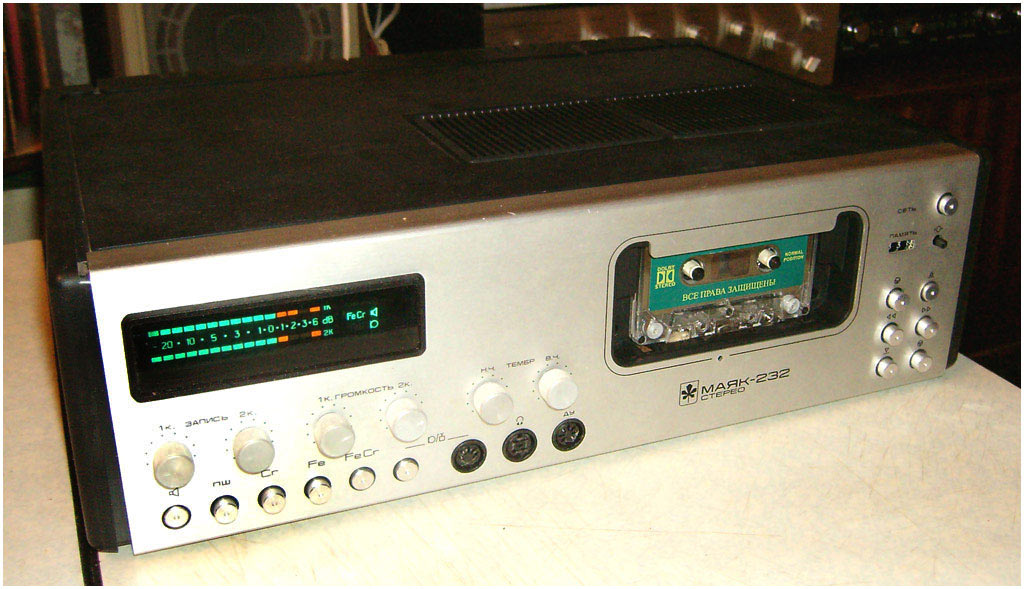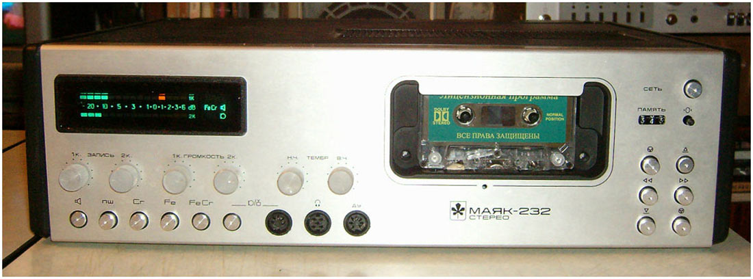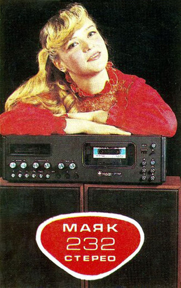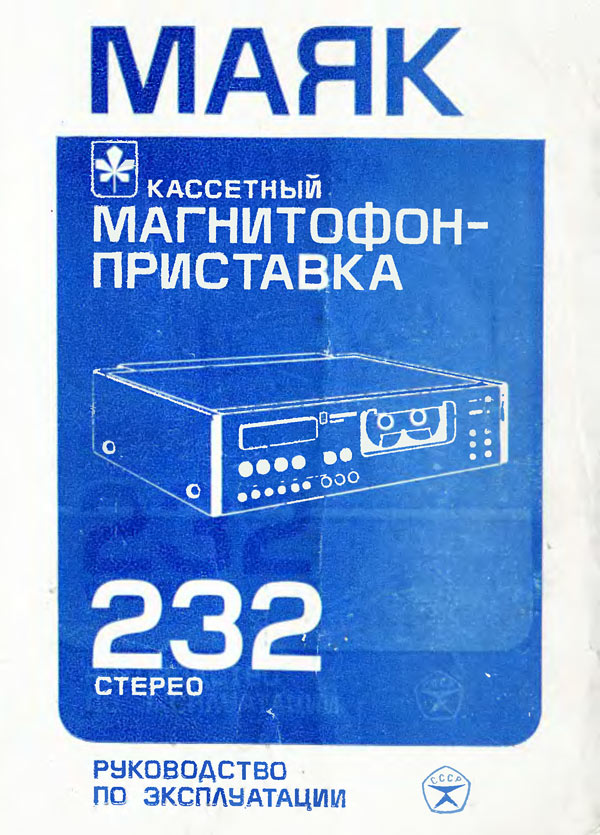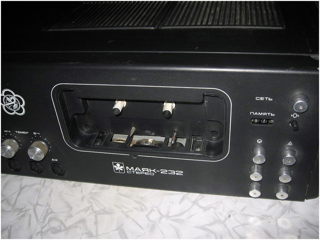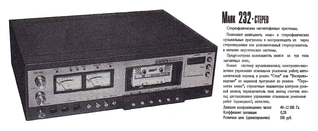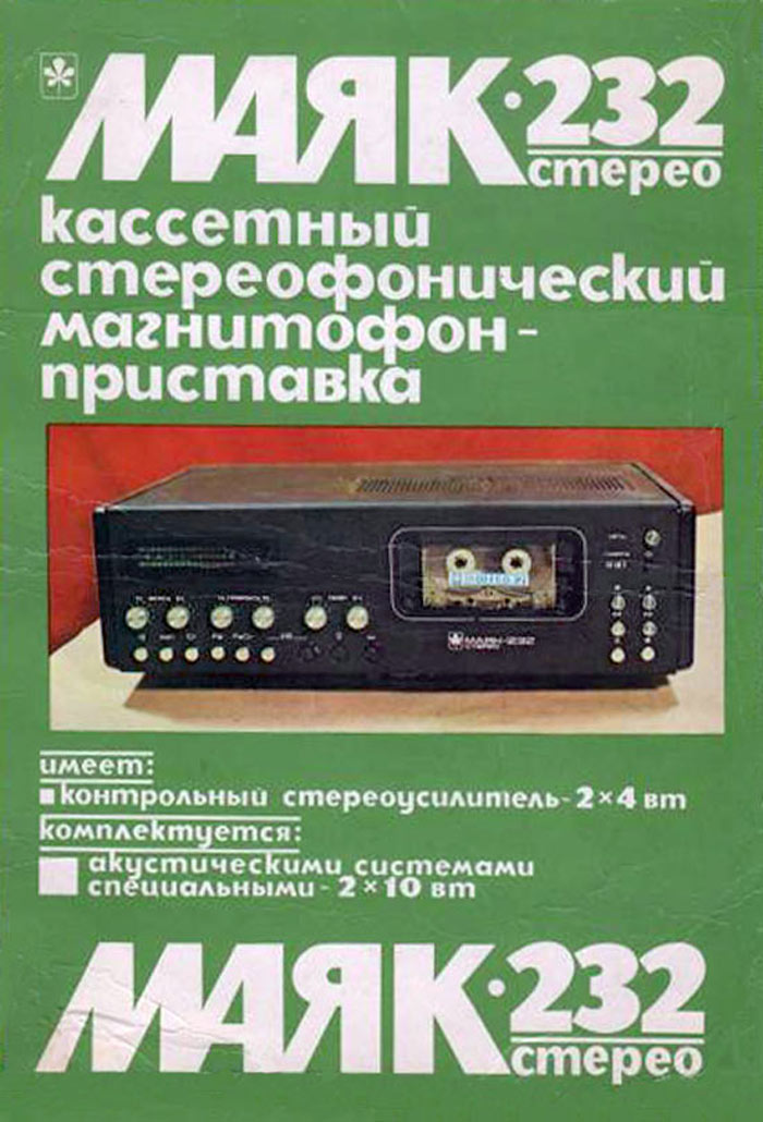 Стереофоническая кассетнная магнитофон-приставка *Маяк-232-стерео* с 1985 года выпускалась Киевским заводом *Маяк*. МП предназначена для записи и воспроизведения фонограмм в кассетах МК и работает с 3-мя типами лент. В модели имеются: регуляторы тембра по ВЧ и НЧ; раздельное регулирование уровня записи и воспроизведения; электронный индикатор уровня записи-воспроизведения; световая индикация сети; люминесцентная индикация включения СШП, микрофона, режима записи и типа магнитных лент; счетчик расхода ленты; устройство «Память»; подключение АС и стереотелефонов; СШ; проводное ДУ основными режимами; переключатель входов. Коэффициент детонации ±0,2%. Рабочий диапазон частот для ленты из: гамма окиси железа 40...12500 Гц; хромдиоксида 40...14000 Гц; гамма окиси железа-хромдиоксида 40...16000Гц. Уровень шумов и помех в канале З/В -50...56 дБ. Максимальная мощность на АС при сопротивлении 4 Ом - 4 Вт. Потребляемая мощность 38 Вт. Габариты МП - 460х130х360 мм. Масса 9,2 кг. Габариты АС - 383х265х185 мм. Масса 5 кг. Магнитофон-приставка *Маяк-232-стерео* (один из вариантов разработки) на пятом рекламном изображении, значительно отличается от серийной модели.