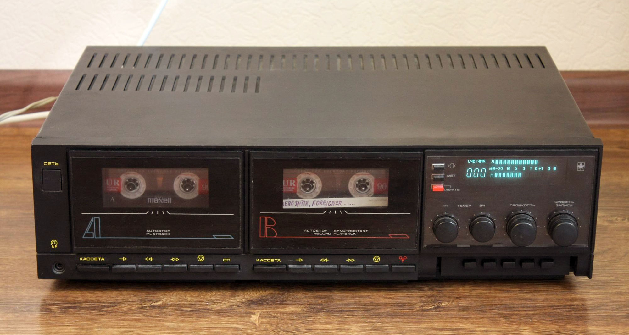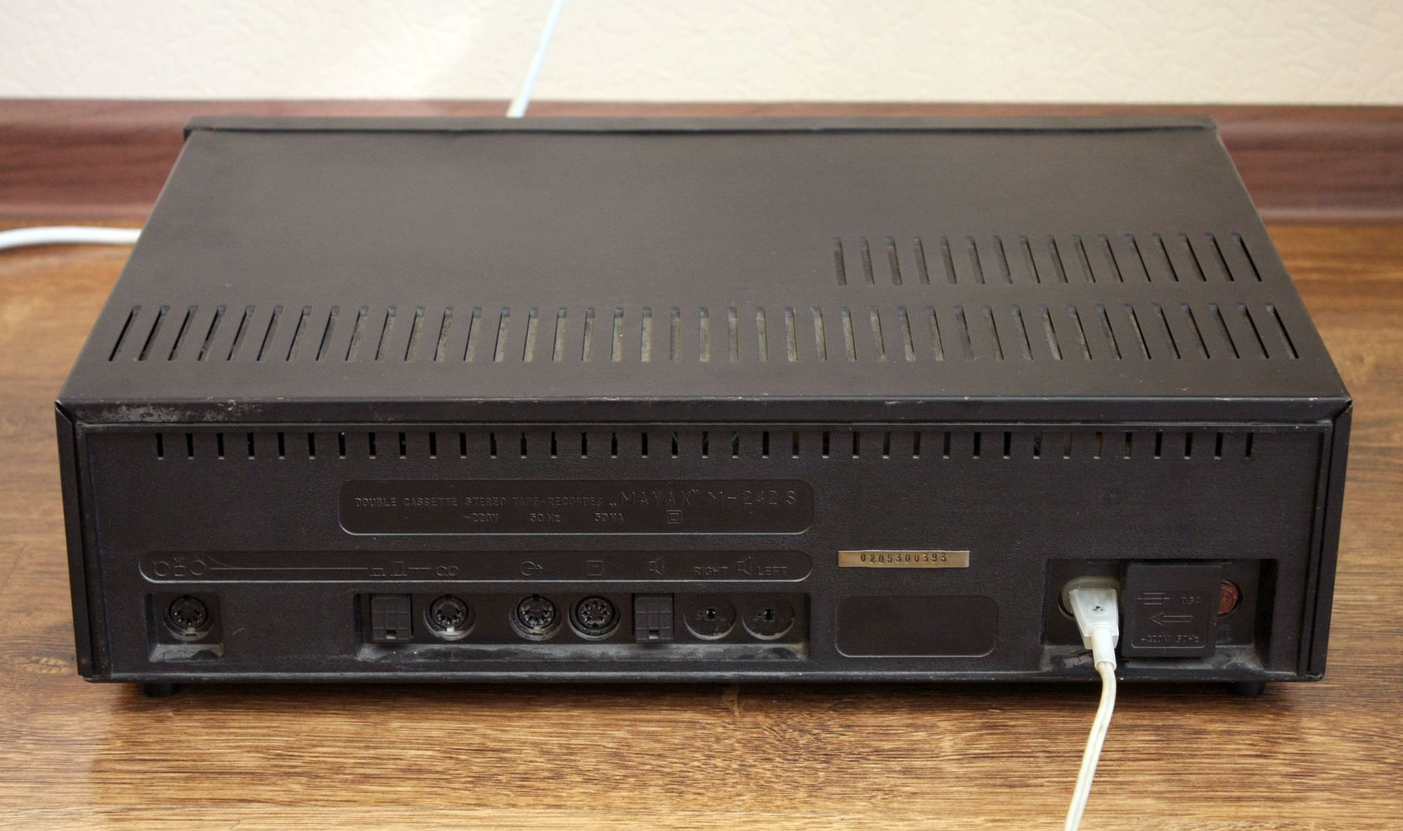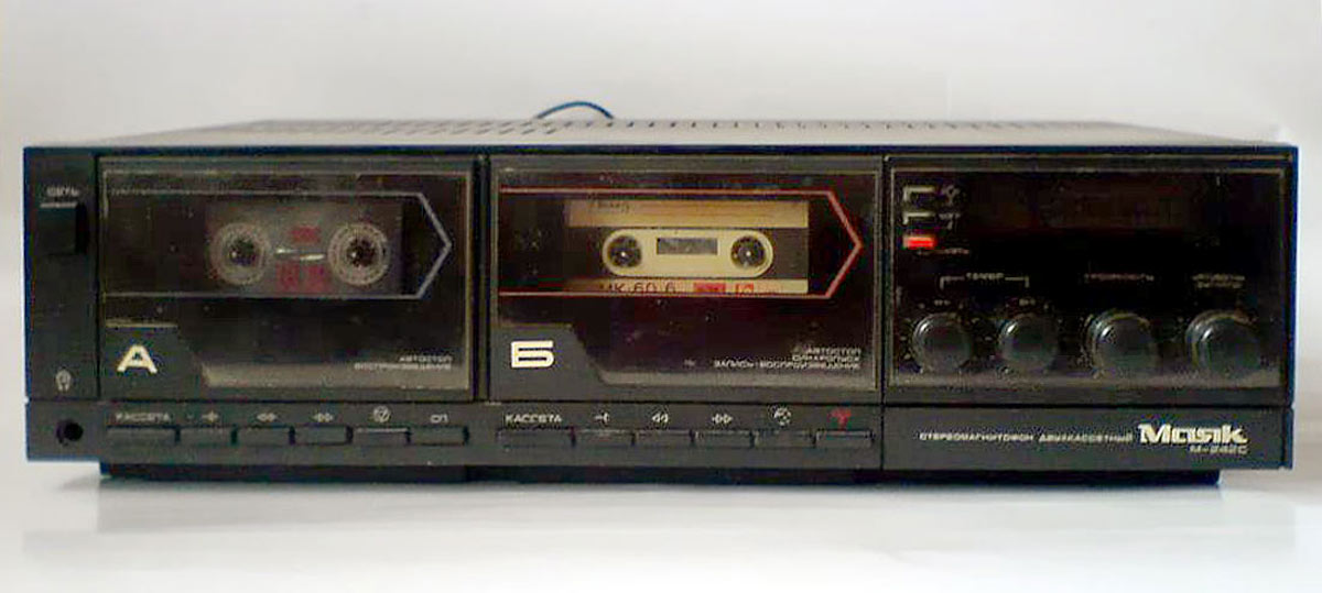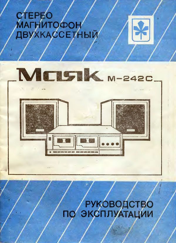 Двухкассетный магнитофон *Маяк М-242С* с 1992 года выпускал Киевский завод *Маяк*. Аппарат предназначен для записи фонограмм на магнитную ленту в кассетах МК и последующего их воспроизведения через АС или внешнее УКУ с АС. Есть возможность перезаписи фонограмм с кассеты на кассету. Можно использовать ленты с рабочим слоем из гамма-окиси железа и двуокиси хрома. В магнитофоне применено квазисенсорное электронно-логическое управление ЛПМ. Имеется: автостоп по окончании ленты; счётчик расхода ленты с режимом *Память*; демпфированные кассетоприёмники; люминесцентный индикатор уровня записи и воспроизведения; устройство ШП системы *Маяк*; световая индикация режимов работы; подсветка кассет; переключатель типа лент; регулировка уровня записи; тембры по ВЧ и НЧ; СДП; выход для телефонов. Коэффициент детонации 0,15%. Рабочий диапазон частот на ЛВ - 31,5...18000 Гц. Коэффициент гармоник на ЛВ не более 1,5%. Уровень шумов и помех в канале З/В -60 дБ. Номинальная выходная мощность 2х10 Вт, максимальная 2х15 Вт. Габариты магнитофона - 430х120х300 мм. Масса - 6,2 кг.