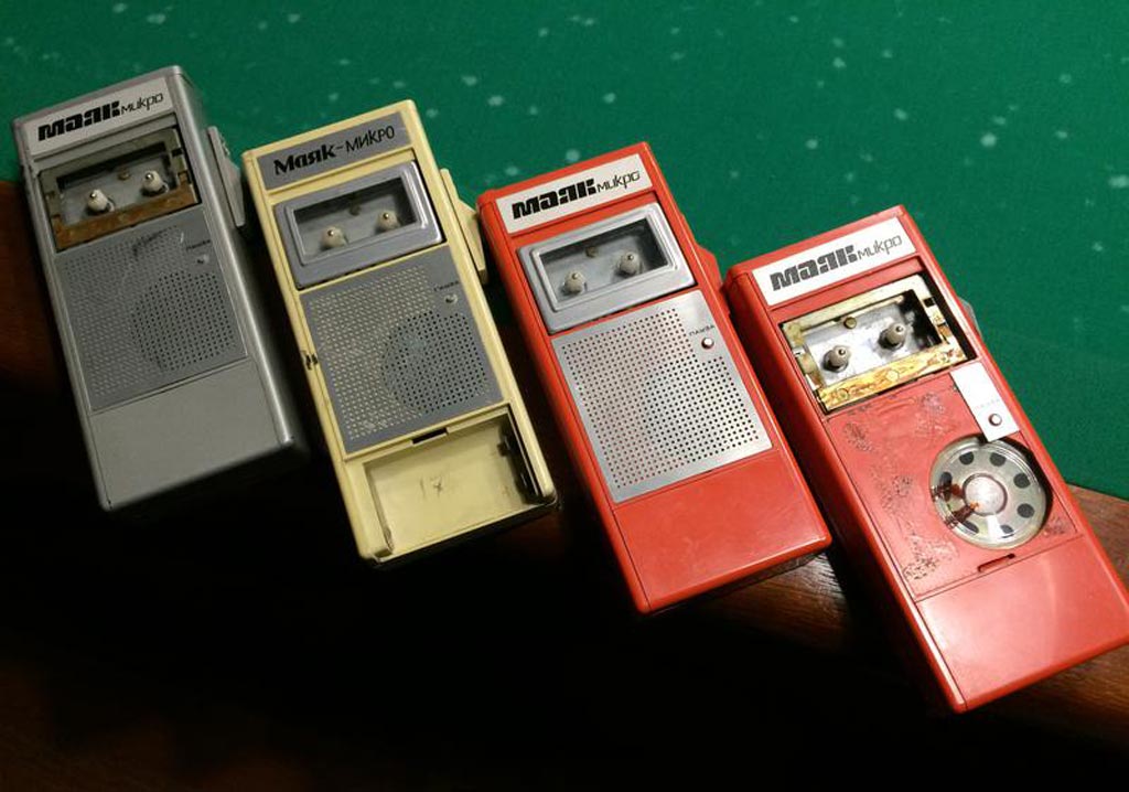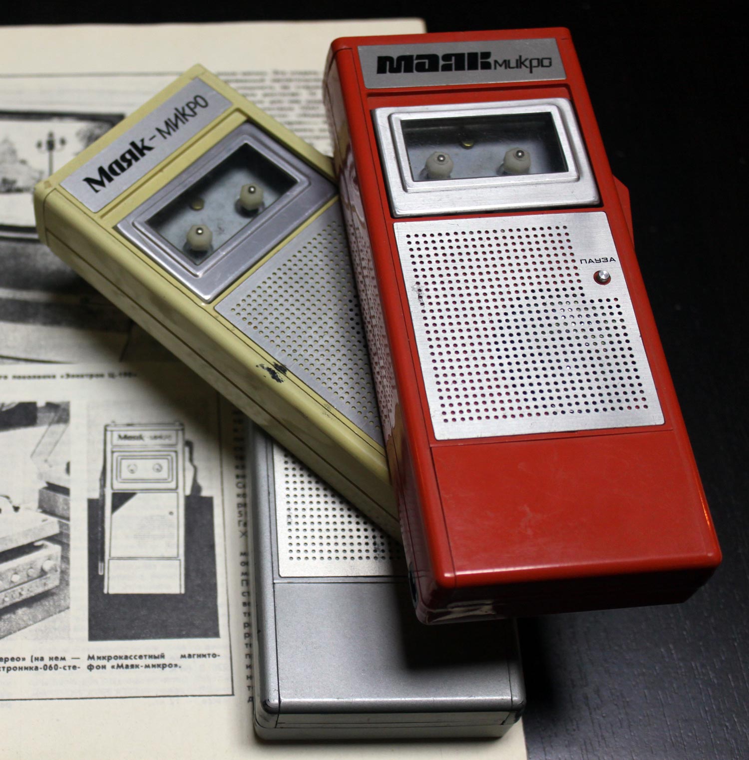 Малогабаритный микрокассетный магнитофон *Маяк-микро* опытно выпускался с 1986 года. Магнитофон (диктофон) *Маяк-микро* предназначен для записи на микрокассету МС-60 речевых программ (лекций, докладов,бесед) и последующего их воспроизведения. Аппарат имеет встроенный микрофон, может питаться от автономного источника (два элемента типа А-316 *Квант*) и от сети переменного тока через малогабаритный блок питания. В магнитофоне предусмотрены автоматическая регулировка уровня записи, работа от внешнего микрофона, подключение головных микротелефонов, внешнего усилителя или активной АС. Скорость протяжки магнитной ленты 2,38 см/с, коэффициент детонации ±0,8 %, рабочий диапазон записываемых или же воспроизводимых микротелефонами звуковых частот 300...5000 Гц, громкоговорителем 300...2550 Гц, номинальная выходная мощность 0,1 Вт. Габариты магнитофона 160х70х24 мм, масса 300 гр.