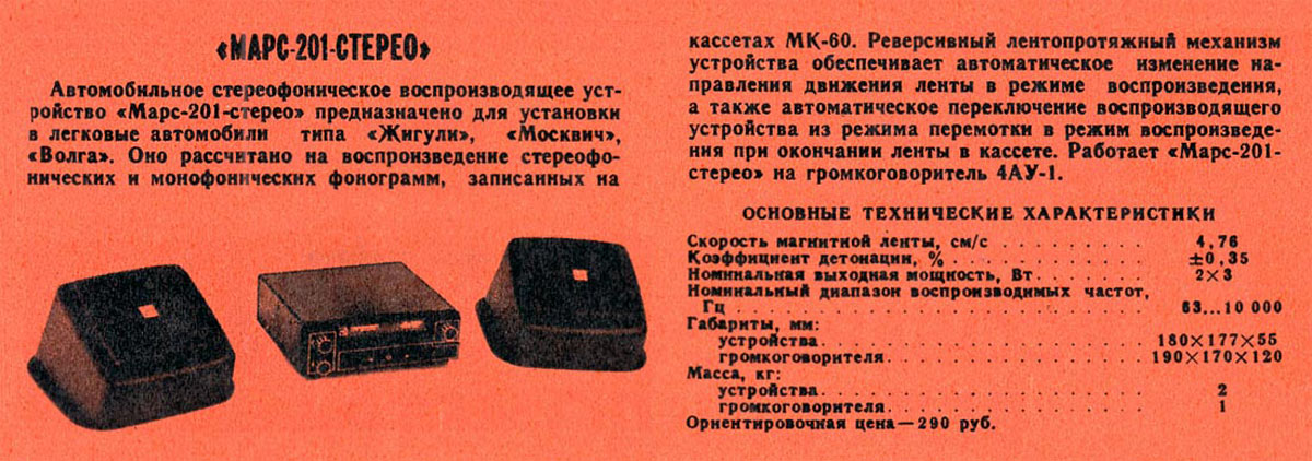Автомобильное стереофоническое воспроизводящее устройство *Марс-201-стерео* выпускалось с 1978 года. АВУ предназначено для установки в автомобили Жигули, Москвич, Волга и рассчитано на воспроизведение фонограмм с кассет МК-60. Реверсивный ЛПМ обеспечивает изменение направления движения ленты в режиме воспроизведения при окончании ленты и автопереключение из режима перемотки на воспроизведение при окончании ленты в кассете. Работает АВУ на 2 АС типа **4АУ-1**. Скорость ленты 4,76 см/с. Коэффицнент детонации ±0,35%. Номинальная выходная мощность 2х3 Вт. Диапазон частот звука на входах АС 6З...10000 Гц, а по звуковому давлению 100...10000 Гц. Габариты устройства 180х177х55 мм. Одной акустической системы - 190х170х120 мм. Масса АВУ 2 кг. Одной АС 1 кг. Цена комплекта АВУ - 290 рублей.