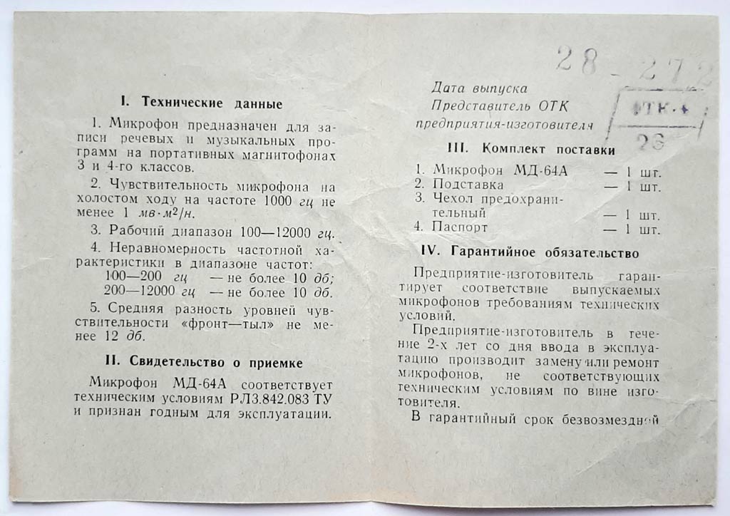 Микрофон динамический *МД-64А* выпускался с 1967 года Тульским заводом *Октава* (з-д *Прибой*). Предназначен для комплектования кассетных магнитофонов третьего и четвёртого классов, с функцией для дистанционного включения записи, включением или выключением питания. Диапазон воспринимаемых частот - 100...12000 Гц. Выходное сопротивление - 250 Ом. Более подробно микрофон описан в приведённой ниже документации.