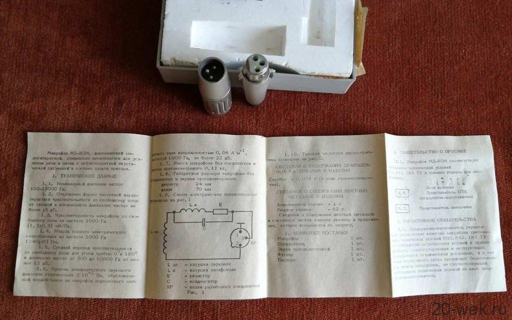 Микрофон динамический *МД-80М* выпускался предположительно с 1978 года Тульским заводом *Октава*. Микрофон предназначен для усиления речи в залах с неблагоприятной акустической ситуацией в составе пульта оратора. Диапазон рабочих частот - 100...15000 Гц. Чувствительность по свободному полю на частоте 1000 Гц, 1,3 мВ/Па. Модуль полного электрического сопротивления 200 Ом. Габаритные размеры 151х44 мм. Масса 110 гр.
