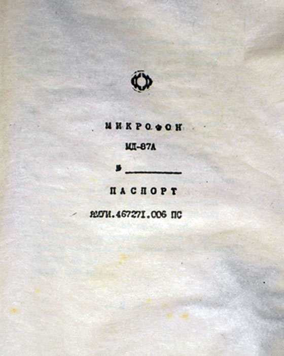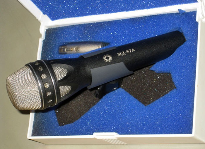 Концертный динамический микрофон *МД-87А* выпускался возможно с 1987 года Тульским заводом *Октава*. Односторонне направленный (суперкардиоида) с эластичной подвеской капсюля и встроенной ветрозащитой, обеспечивает эффективное подавление акустических, ветровых и механических помех, включая шумы, возникающие от контакта рук исполнителя с корпусом микрофона. В звуковом поле дальних источников частотные характеристики имеют спад к низким частотам, который выравнивается в рабочем положении по отношению к исполнителю за счет эффекта ближней зоны, что вместе с направленной пространственной характеристикой обеспечивает возможность работы на значительных уровнях громкости без опасности возникновения акустической *завязки*. Микрофон имеет диафрагму с двойным куполом, что обеспечивает достаточный уровень чувствительности в низкочастотном диапазоне. Частотный диапазон 40...16000 Гц. Чувствительность - 1,3...2,6 мВ/Па. Выходной импеданс 250 ±50 Ом. Уровень шумов 15 дБ. Температурный диапазон -20 / +50 С. Влажность 93 %. Размеры 50 x 197 мм. Вес 300 г.