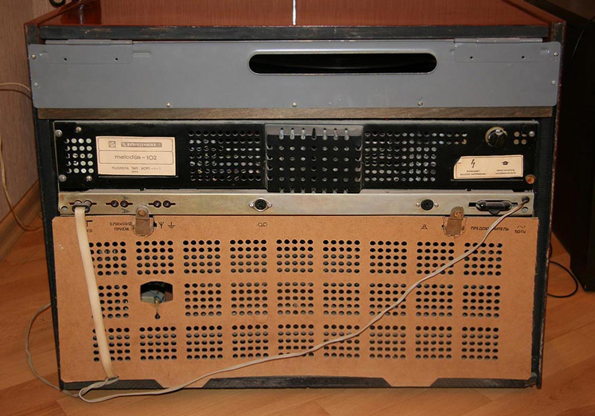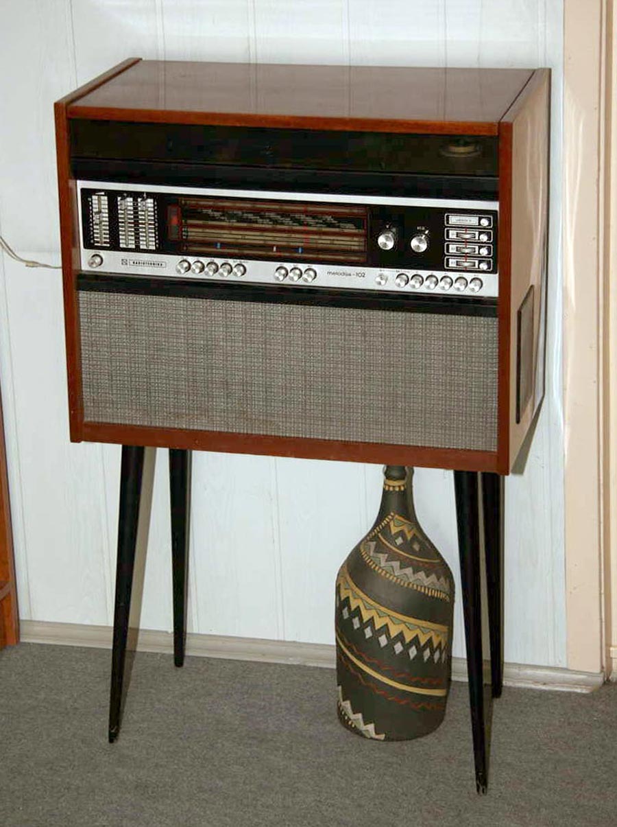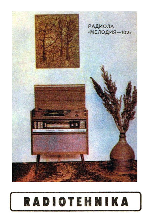 Радиола *Мелодия-102* с 1976 года выпускалась Рижским радиозаводом им. Попова. Радиола 1 класса **Мелодия-102** разработана на базе модели **Мелодия-101-стерео** и предназначена для приёма в диапазонах ДВ, СВ, трёх поддиапазонах КВ, УКВ диапазоне и воспроизведения грамзаписи. Радиола **Мелодия-102** сменила ламповую радиолу **Ригонда-102**. В модели применено ЭПУ - II-ЭПУ-60. В АС установлено 4 динамических головки 4ГД-35, одна 3ГД-31 и две 1ГД-40. В приёмнике имеется система БШН и фиксированная настройка на 3 радиостанции в диапазоне УКВ. В 1977 году вышел упрощённый вариант радиолы **Мелодия-102А**, в АС которой было установлено три громкоговорителя, один 4ГД-35 и два 1ГД-40. В остальном, за исключением корректировки номиналов деталей и нумерации по схеме обе радиолы одинаковы. Отсутствие громкоговорителя ВЧ особо не повлияло на АЧХ тракта НЧ. Чувствительность на внешнюю антенну: ДВ - 150 мкВ, СВ - 100 мкВ, KB - 100 мкВ, УКВ - 5 мкВ. При приёме на магнитную антенну в диапазонах ДВ- 2 мВ/м, СВ - 1.5 мВ/м. Селективность в диапазонах ДВ, СВ - 40 дБ. Система АРУ обеспечивает изменение выходного напряжения в 2 раза, при изменении входного в 1000 раз. Полоса звуковых частот AM тракта - 63...6300 Гц, ЧМ и ЭПУ - 63...12500 Гц. Номинальная выходная мощность 5 Вт, максимальная 9 Вт. Потребляемая мощность при приёме - 30 Вт, при работе ЭПУ - 42 Вт. Размеры радиолы без ножек - 630х500х338 мм, вес 23 кг.