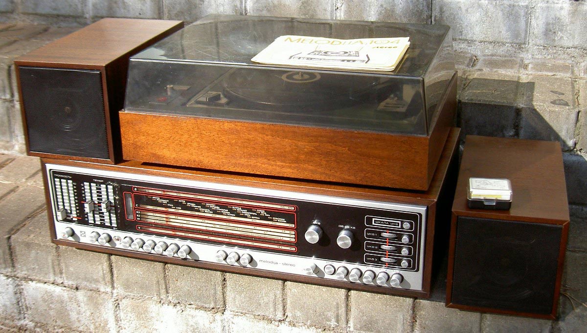 Сетевая стереофоническая блочная радиола *Мелодия-104-стерео* с 1978 года выпускалась Рижским радиозаводом им. А.С. Попова. Она работает в диапазонах ДВ, СВ, 3-х поддиапазонах КВ и УКВ. ЭПУ радиолы с магнитной головкой, воспроизводит грамзапись с моно и стереопластинок. В УКВ диапазоне приём ведётся с автоподстройкой. Есть возможность фиксированной настройки на три ЧМ радиостанции. Радиола имеет ступенчатую регулировку полосы пропускания в ПЧ АМ тракта, систему бесшумной настройки в диапазоне УКВ. Полоса воспроизводимых звуковых частот в тракте AM - 63...6300 Гц, ЧМ 63...12500 Гц. Чувствительность в диапазоне УКВ ЧМ - 2,5 мкВ. Номинальная выходная мощность - 2х6 Вт. Коэффициент гармоник 4%. Потребляемая мощность при приёме 46 Вт, воспроизведении грамзаписи 50 Вт. Габариты блока радиоприёма 168х630х300 мм, ЭПУ 175х455х330 мм, одной АС 157х157х300 мм. Масса комплекта 26 кг. Радиола выпускалась в 3-х вариантах комплектации.