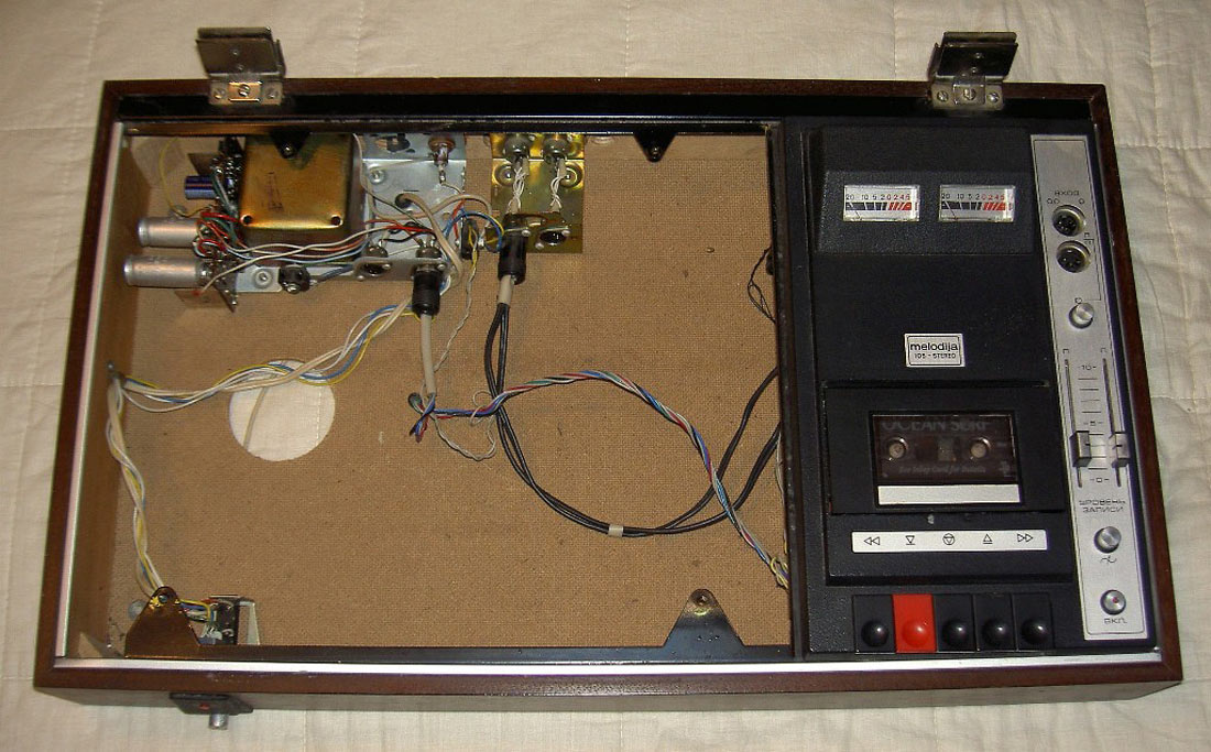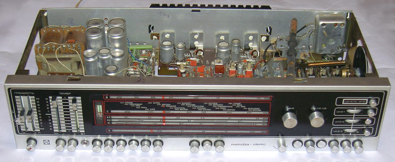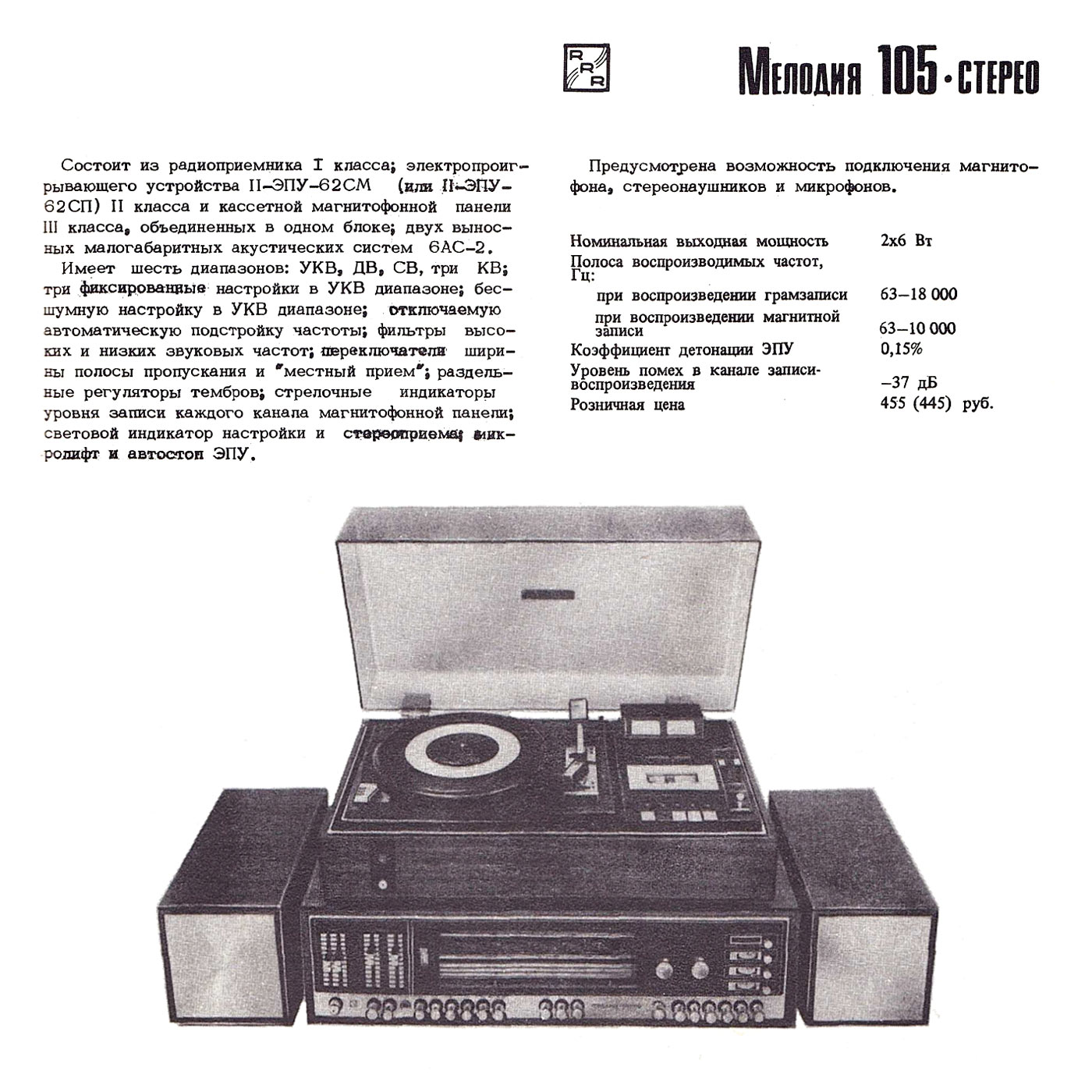 Стереофоническая радиола с кассетным магнитофоном *Мелодия-105-стерео* с 1979 года выпускалась Рижским радиозаводом им. А.С.Попова. Радиола предназначена для приёма в диапазонах ДВ, СВ, КВ и УКВ, прослушивания стереопрограмм в диапазоне УКВ и проигрывания моно или стереофонических грамзаписей. Магнитофонная панель позволяет воспроизводить моно или стереофонические записи и осуществлять запись программ с радиолы, радиолинии, микрофона и других внешних источников программ. Радиола имеет шесть диапазонов, поворотную магнитную антенну, внутренний УКВ диполь. Номинальная выходная мощность 2х6, максимальная 2х16 Вт. При приёме диапазон воспроизводимых частот на ДВ, СВ и KB - 63...4000 Гц, на ДВ и СВ в положении МП - 63...6300 Гц, УКВ и по тракту грамзаписи - 63...12500 Гц. При работе магнитофона диапазон частот - 63...10000 Гц. Габариты приёмника - 625х168х320 мм; ЭПУ 565x175x360 мм; одной АС - 158х158х300 мм. Вес комплекта 29 кг.