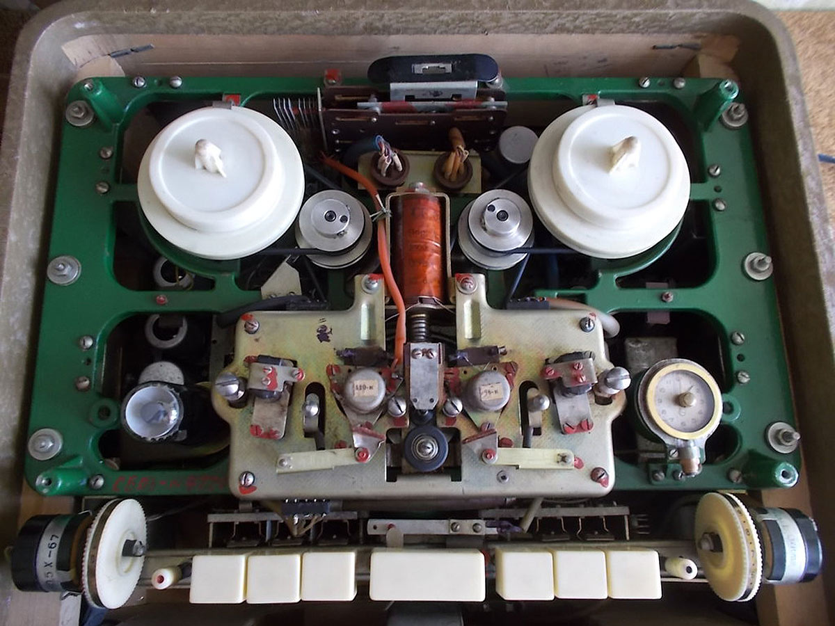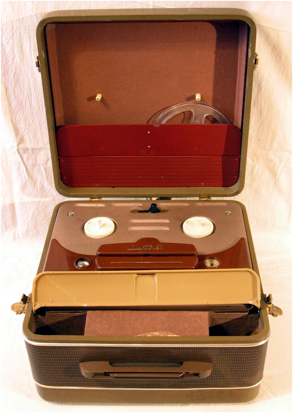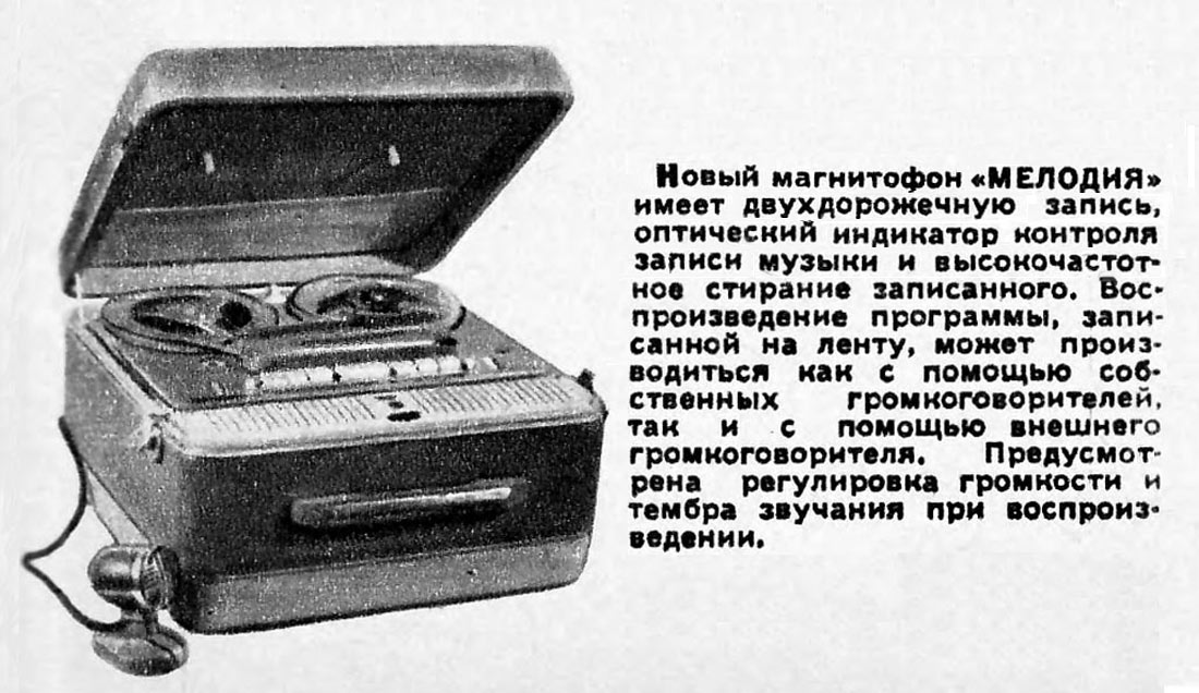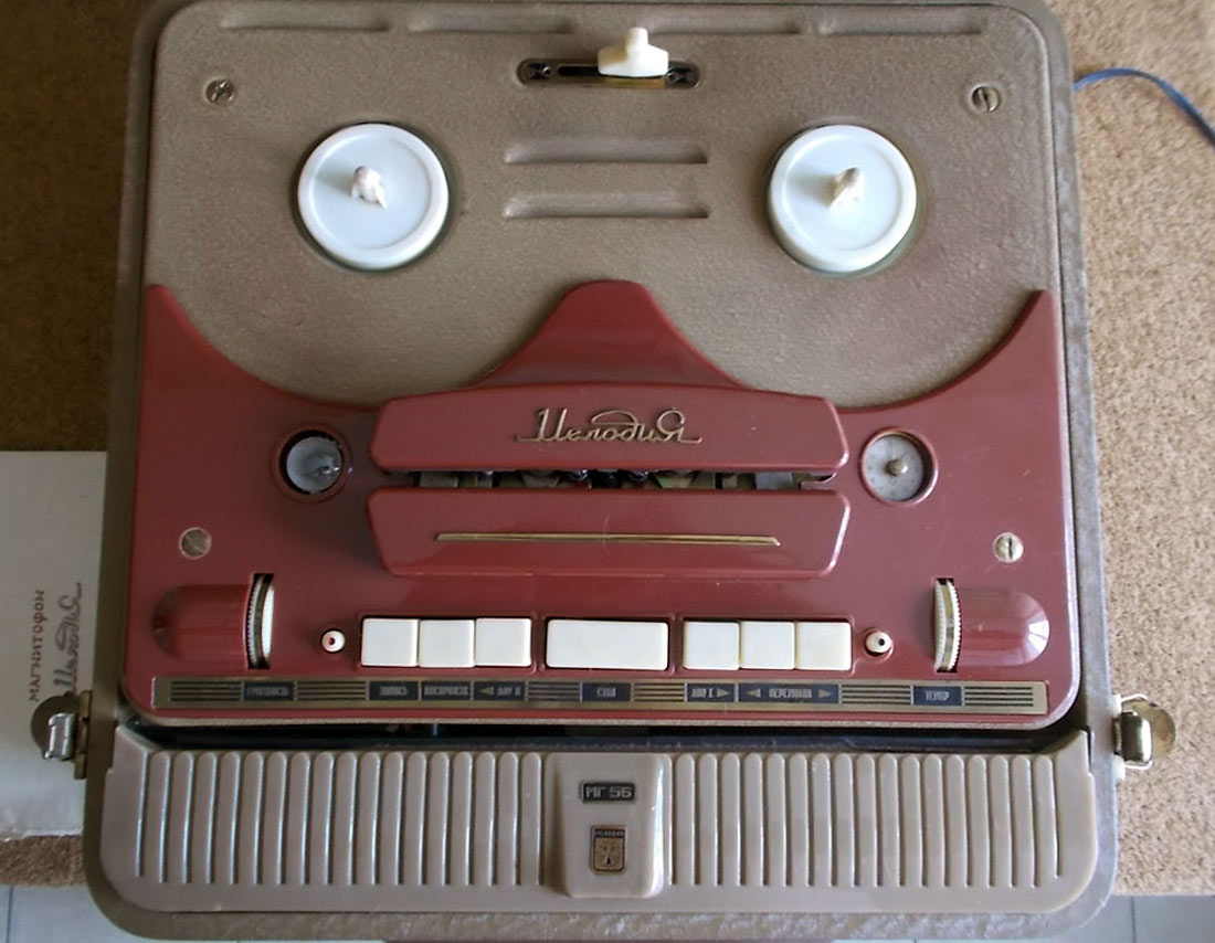 Магнитофон *Мелодия МГ-56* с 1956 года выпускал Новосибирский завод *Точмаш*. Он скопирован с немецкого магнитофона *Grundig TK-820*, 1955 года выпуска (первое фото). Магнитофон *Мелодия МГ-56* предназначен для записи и воспроизведения звуковых программ на магнитной ленте типа 2 с катушками № 18. Запись фонограмм двухдорожечная. Скорость протяжки магнитной ленты 9,53 см/сек и 19,05 см/сек. Диапазон частот канала записи или воспроизведения на большей скорости 50...10000 Гц, на меньшей 100...6000 Гц. Номинальная выходная мощность на двух громкоговорителях 2ГД-3 не менее 2 Вт. Потребляемая от сети мощность при записи около 100 Вт, при воспроизведении 80 Вт. Магнитофон имеет: индикатор уровня записи и схожий с ним по оформлению указатель метража магнитной ленты; кнопку пауза; регуляторы тембра НЧ и ВЧ; устройство выключения в конце рулона ленты. Всевозможные переключения в магнитофоне осуществляются с помощью обычных и тяговых реле, а так же с помощью электромагнитных муфт. Управление всеми режимами работ - кнопочное. Собран магнитофон в футляре из дерева и оклеен декоративным материалом. Габариты магнитофона - 420х420х210 мм. Масса 24 кг. На втором изображении реклама магнитофона *Мелодия МГ-56* в журнале *Техника Молодёжи* № 11 за 1957 год.