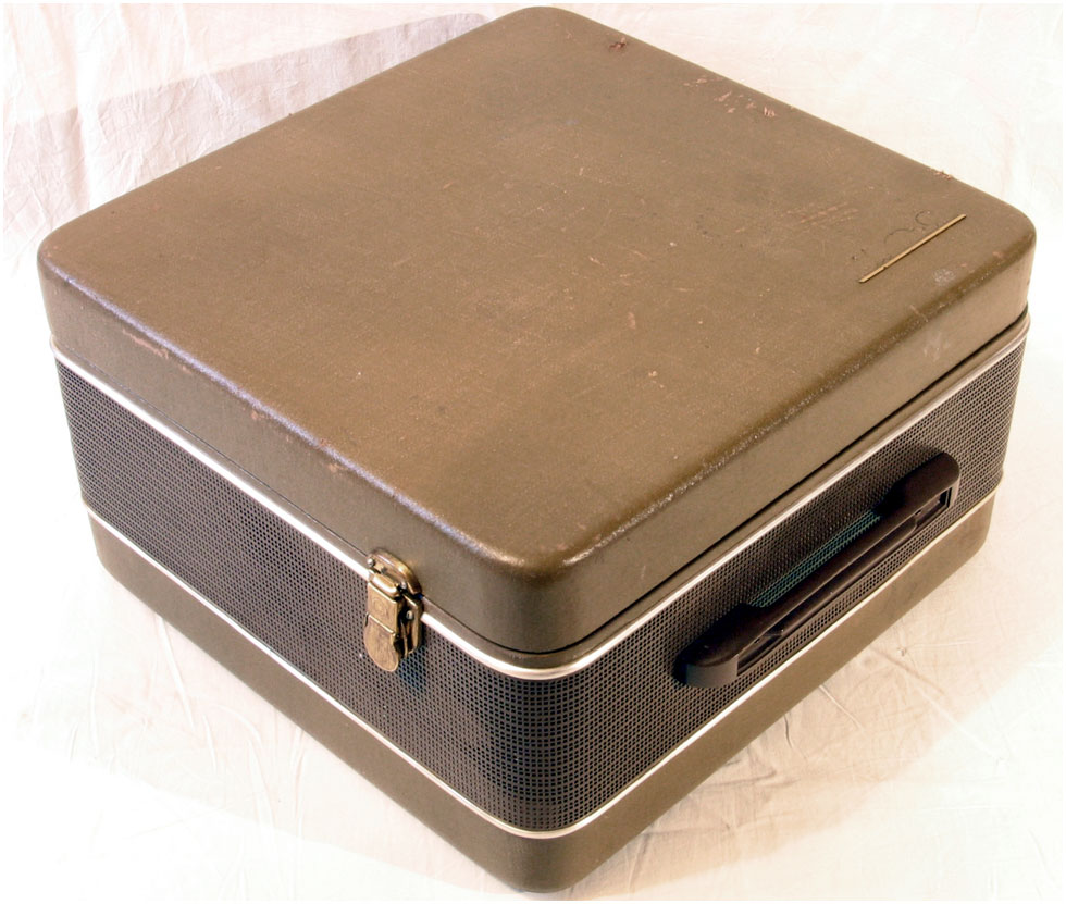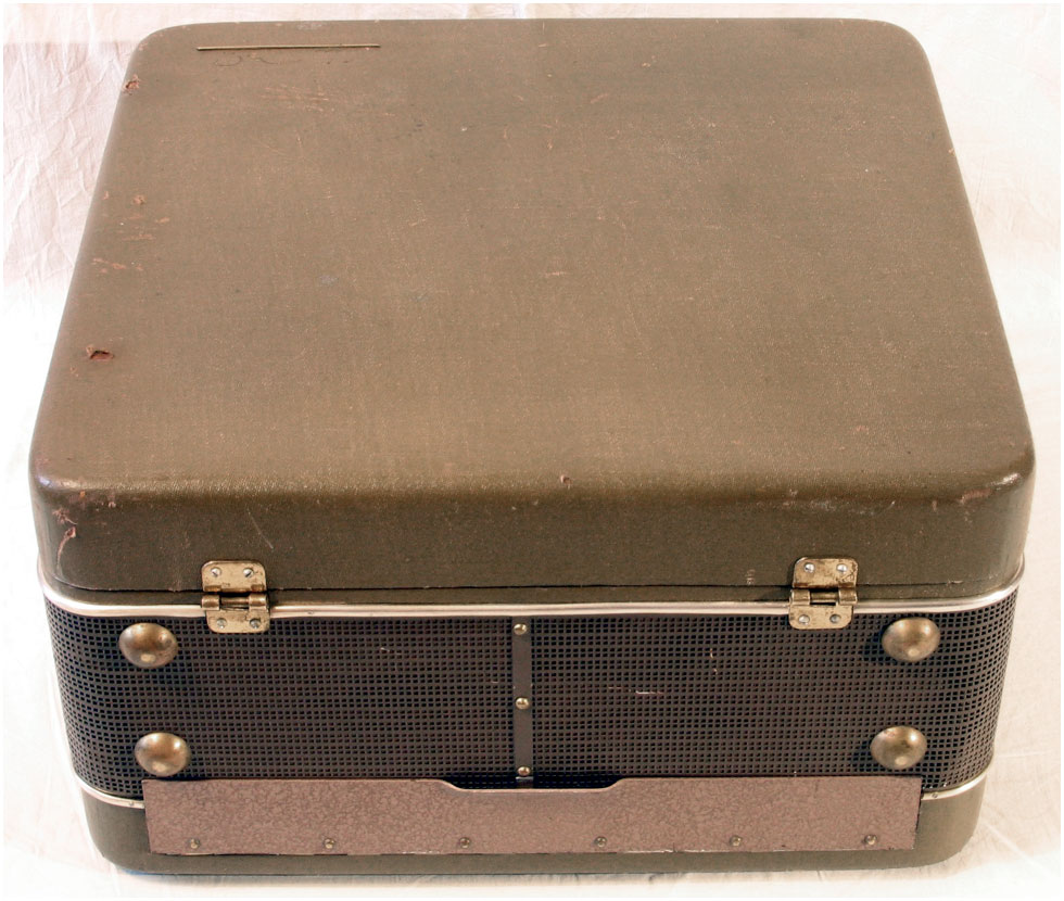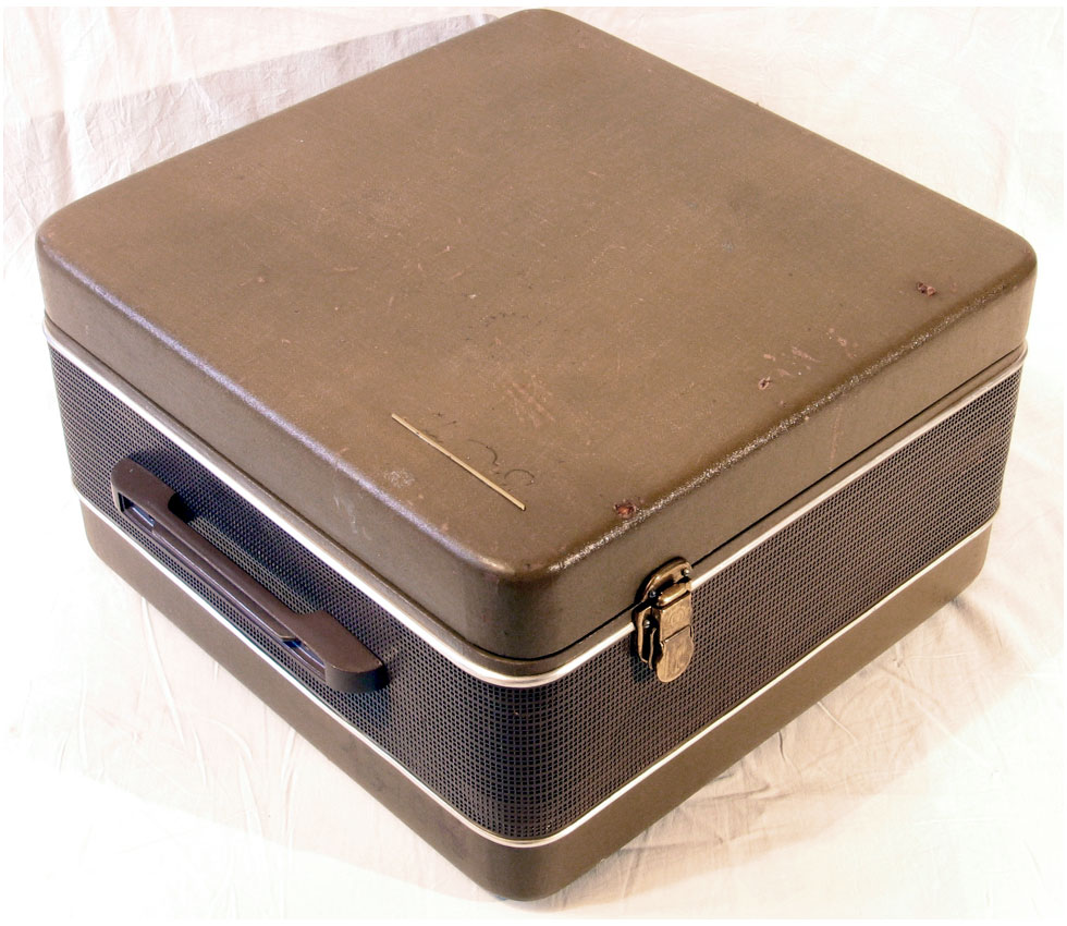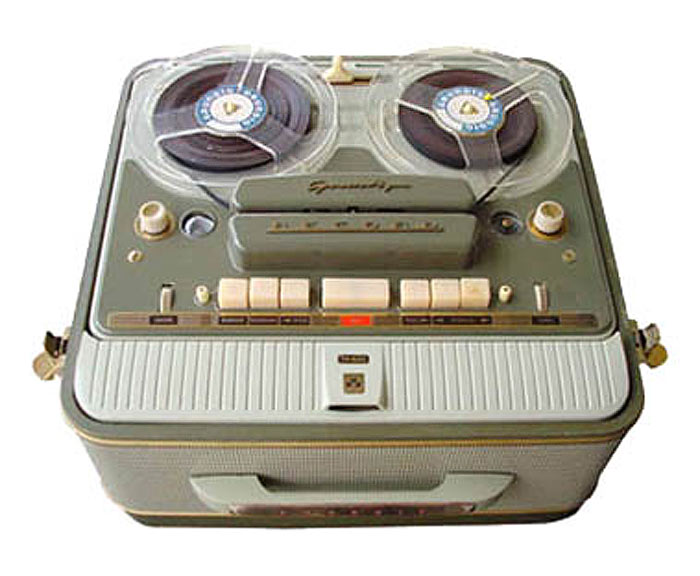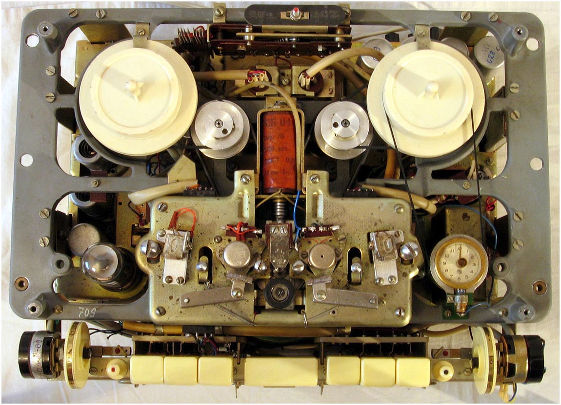 Магнитофон *Мелодия МГ-56* с 1956 года выпускал Новосибирский завод *Точмаш*. Он скопирован с немецкого магнитофона *Grundig TK-820*, 1955 года выпуска (первое фото). Магнитофон *Мелодия МГ-56* предназначен для записи и воспроизведения звуковых программ на магнитной ленте типа 2 с катушками № 18. Запись фонограмм двухдорожечная. Скорость протяжки магнитной ленты 9,53 см/сек и 19,05 см/сек. Диапазон частот канала записи или воспроизведения на большей скорости 50...10000 Гц, на меньшей 100...6000 Гц. Номинальная выходная мощность на двух громкоговорителях 2ГД-3 не менее 2 Вт. Потребляемая от сети мощность при записи около 100 Вт, при воспроизведении 80 Вт. Магнитофон имеет: индикатор уровня записи и схожий с ним по оформлению указатель метража магнитной ленты; кнопку пауза; регуляторы тембра НЧ и ВЧ; устройство выключения в конце рулона ленты. Всевозможные переключения в магнитофоне осуществляются с помощью обычных и тяговых реле, а так же с помощью электромагнитных муфт. Управление всеми режимами работ - кнопочное. Собран магнитофон в футляре из дерева и оклеен декоративным материалом. Габариты магнитофона - 420х420х210 мм. Масса 24 кг. На втором изображении реклама магнитофона *Мелодия МГ-56* в журнале *Техника Молодёжи* № 11 за 1957 год.