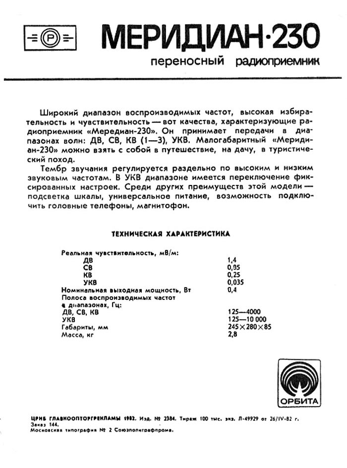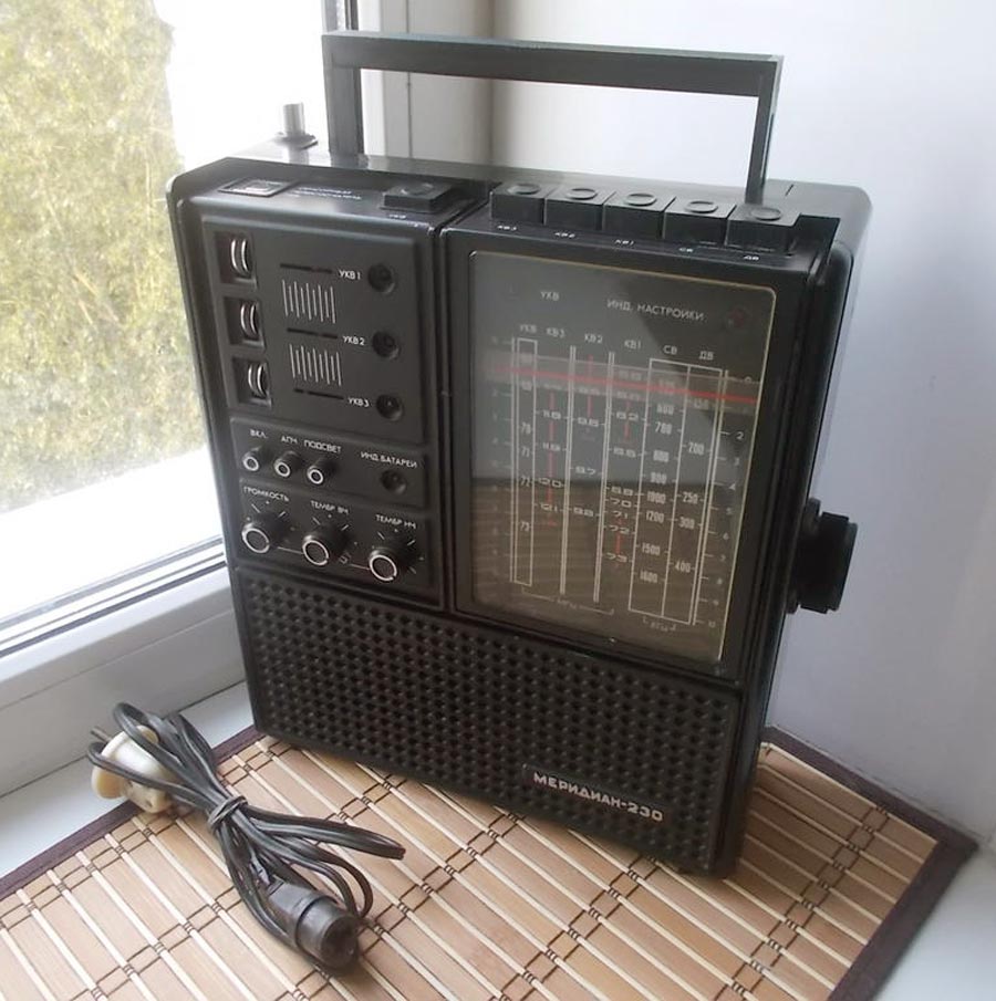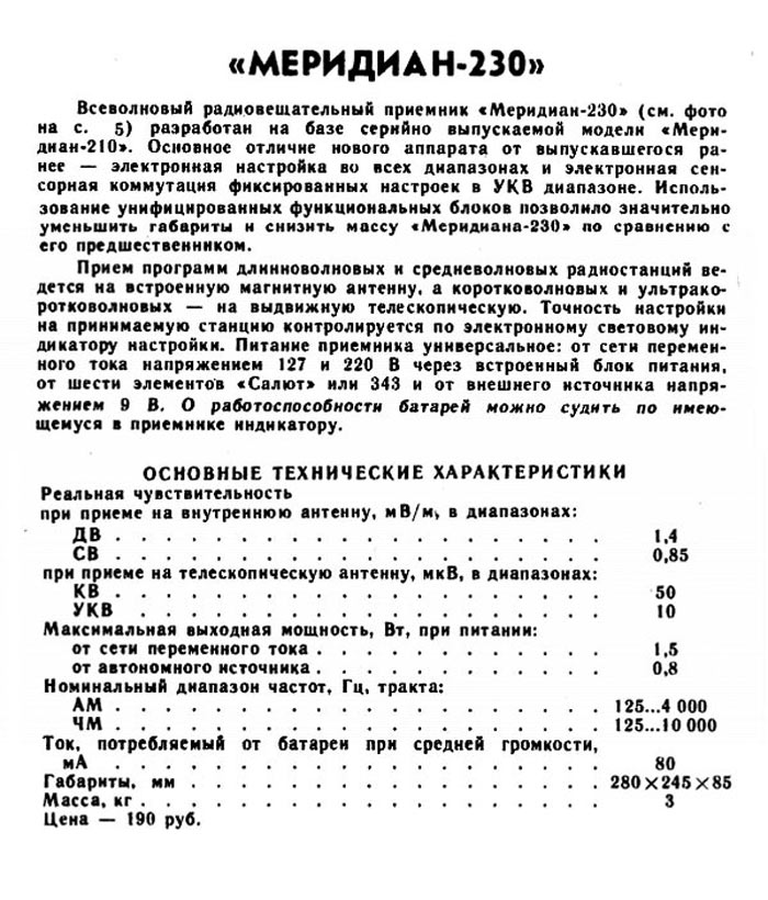 Радиоприёмник *Меридиан-230* с 1982 года производил Киевский завод *Радиоприбор*. Приёмник разработан на основе модели *Меридиан-210*. Основное отличие, это электронная настройка во всех диапазонах и электронная сенсорная коммутация фиксированных настроек в УКВ диапазоне. Использование унифицированных функциональных блоков позволило уменьшить габариты и снизить массу приёмника по сравнению с предшественником. Приём ДВ, СВ радиостанций производится на магнитную антенну, а КВ и УКВ на телескопическую. Точность настройки контролируется электронным световым индикатором настройки. Питание от электросети через встроенный БП, от 6 элементов 343 или от внешнего источника. О работоспособности батарей можно судить по имеющемуся индикатору. Реальная чувствительность в диапазоне ДВ - 1,4 мВ/м, СВ - 0,85 мВ/м, на телескопическую антенну в диапазонах КВ - 50 мкВ, УКВ - 10 мкВ. Максимальная выходная мощность при питании от сети 1,5 Вт, от автономного источника 0,6 Вт. Диапазон воспроизводимых частот звука тракта AM - 125...4000 Гц, ЧМ - 125...10000 Гц. Габариты приёмника 280 х 245 х 85 мм. Масса 3 кг. Цена 190 рублей.