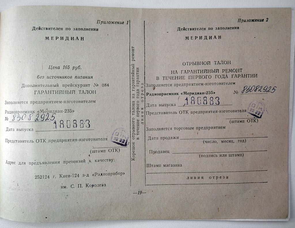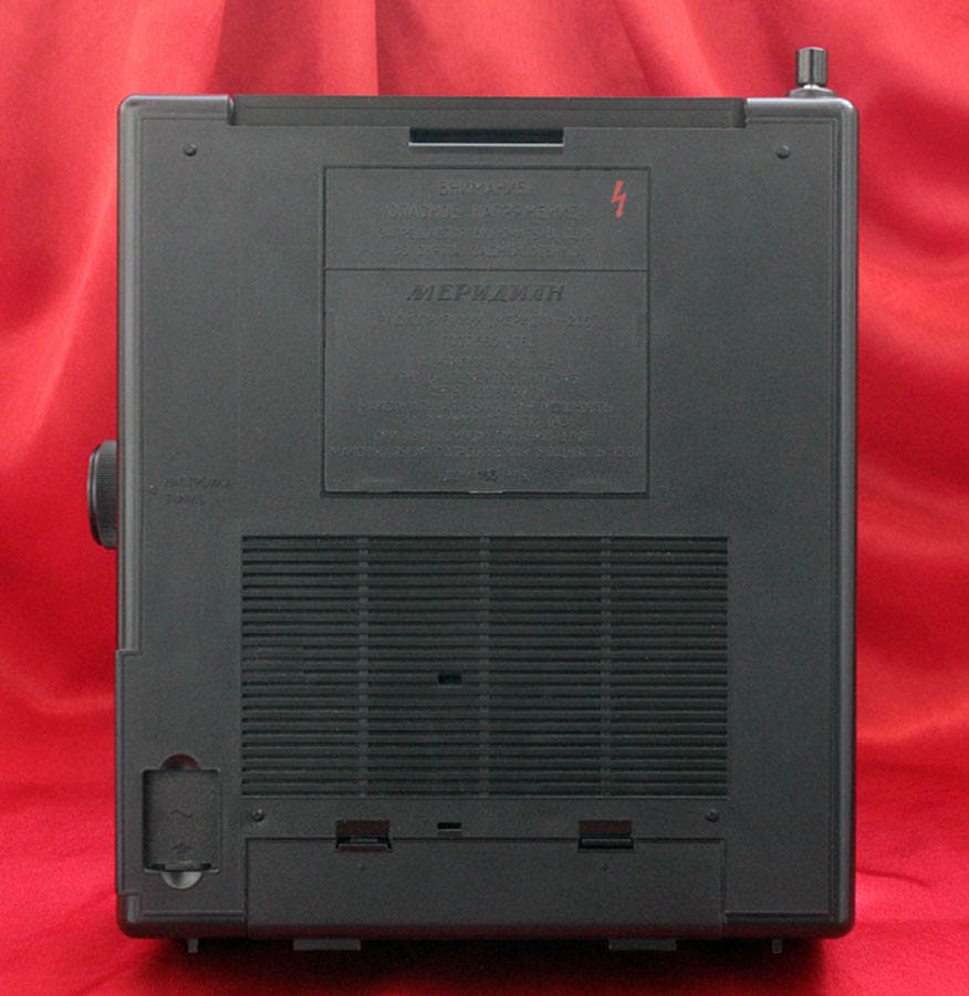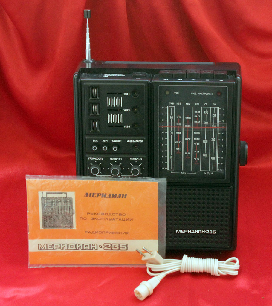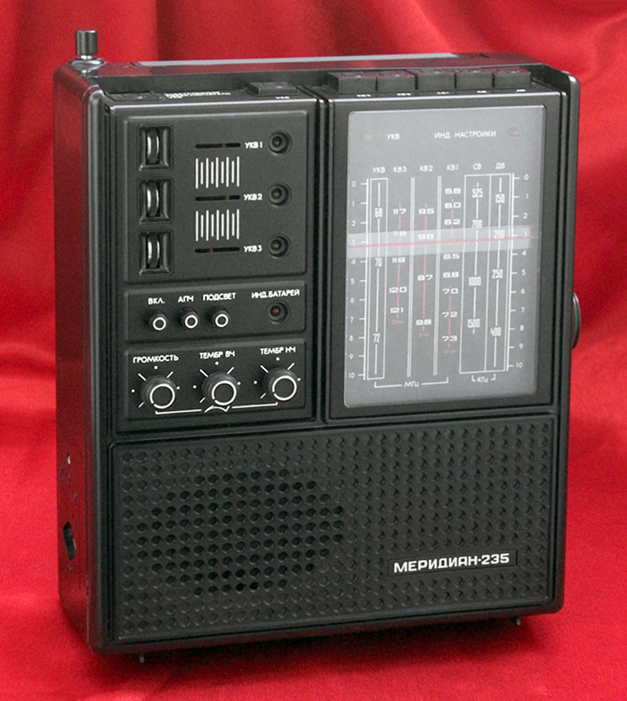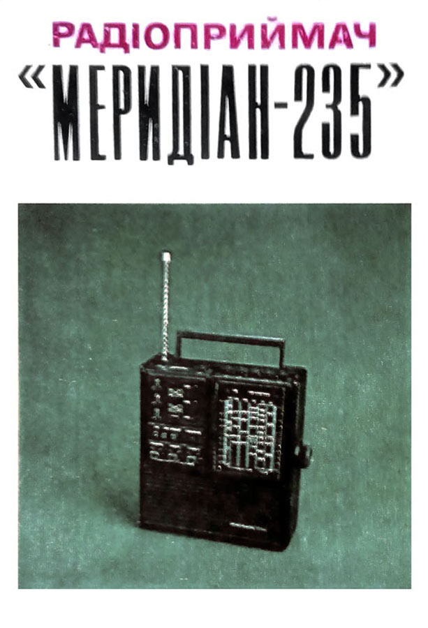 Портативный радиоприёмник *Меридиан-235* с середины 1983 года выпускал Киевский завод *Радиоприбор*. Радиоприёмник предназначен для приёма радиостанций в диапазонах ДВ, СВ, KB и УКВ. Он имеет магнитную антенну для ДВ, СВ диапазонов, в KB и УКВ диапазонах штыревую телескопическую, фиксированную настройку на одну из трёх станций и АПЧ в диапазоне УКВ, регулировку тембра по ВЧ и НЧ, гнёзда для внешней антенны, магнитофона и головных телефонов. Ручка для переноски убирающаяся. Основные данные: Диапазоны: ДВ, СВ, КВ-1 5,8...7,3 мГц, КВ-2 9,5...9,8 мГц, КВ-3 11,7...12,1 мГц, УКВ 65,8...73 мГц. Чувствительность на встроенных антеннах ДВ 0,4 мВ/м, СВ 0,25 мВ/м, KB 100 мкВ, УКВ 20 мкВ. Селективность в АМ тракте не менее 34 дБ. Полоса воспроизводимых звуковых частот АМ тракта - 125...4000 Гц, ЧМ 125...10000 Гц. Максимальная выходная мощность при питании от батарей 0,8 Вт, от сети 1,5 Вт. Источник питания 6 элементов 343 или сеть переменного тока 220 вольт. Габариты модели 280х250х90 мм. Масса 2,8 кг. Цена 135 (145) рублей. Радиоприёмник **Меридиан-236** выпускаемый с 1987 года не отличается от модели **Меридиан-235** и выпускался для ассортимента.