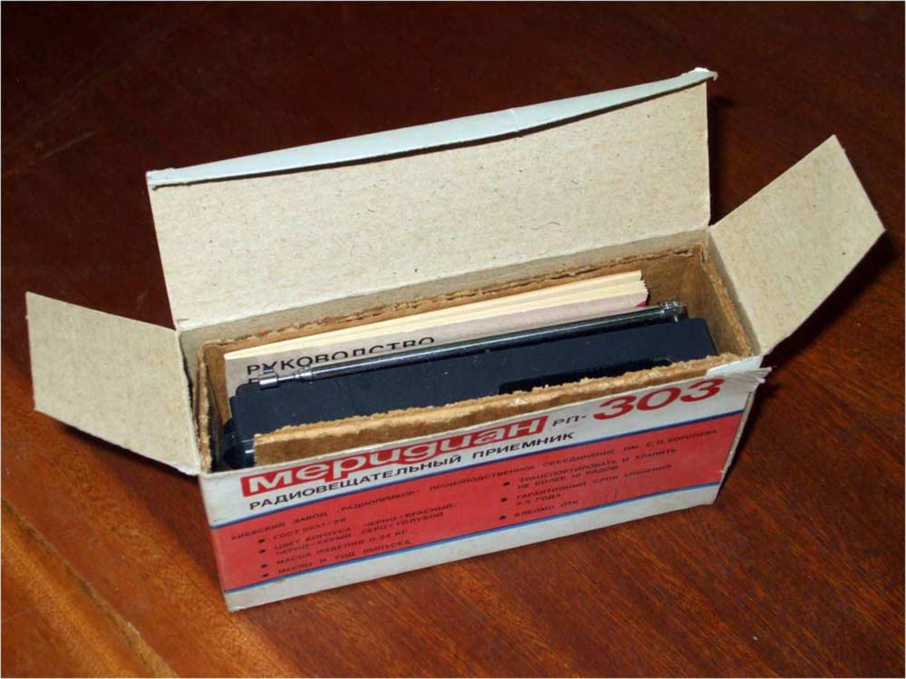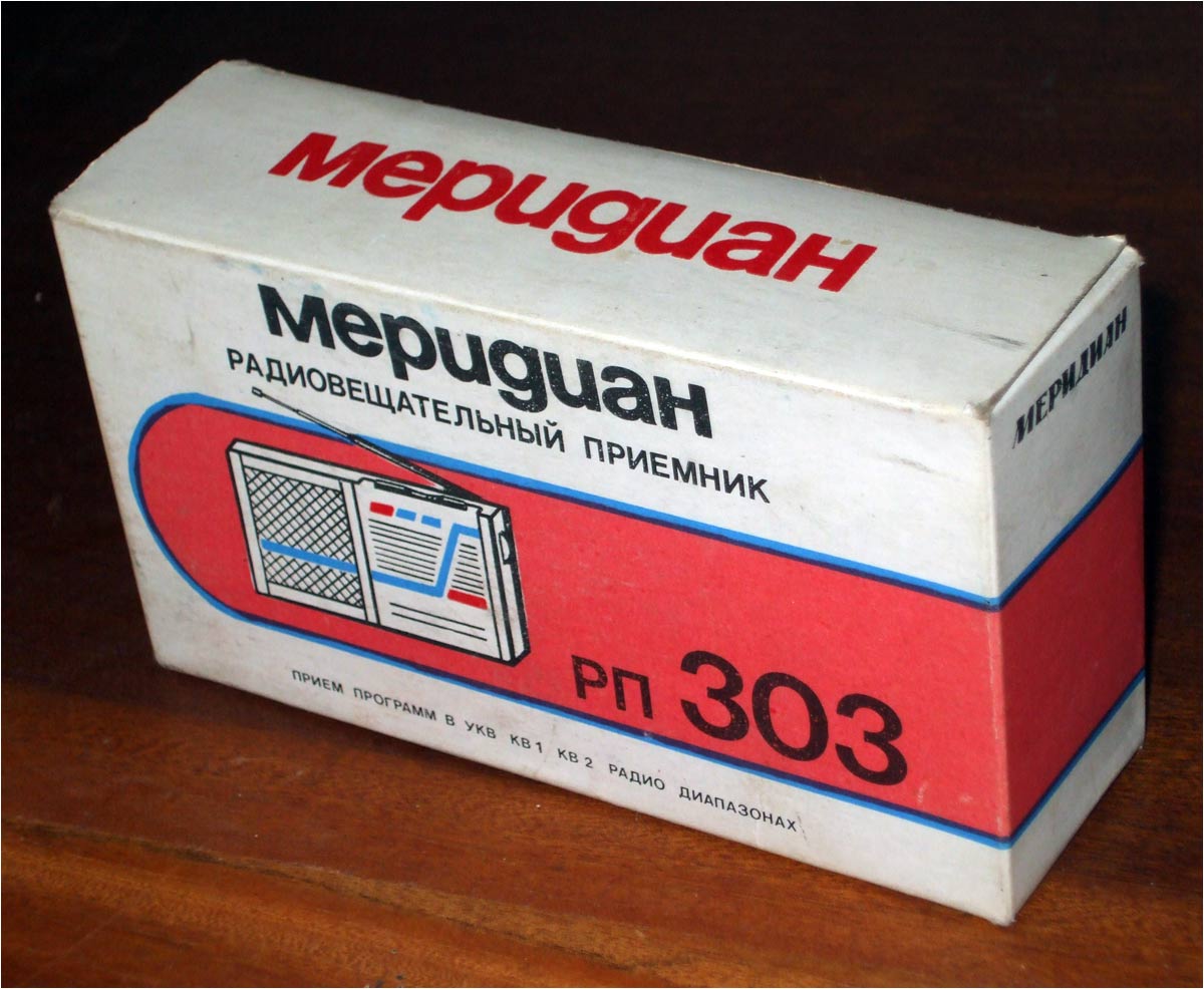 Радиоприёмник *Меридиан РП-303* с 1993 года выпускал Киевский завод *Радиоприбор*. Радиоприёмник **Меридиан РП-303** предназначен для приёма программ радиовещательных станций в диапазоне КВ (2 поддиапазона) и УКВ. Радиоприёмник выполнен на трёх микросхемах и имеет раздельный тракт УПЧ. Для приёма используется выдвижная телескопическая антенна. В диапазоне УКВ используется устройство БШН, обеспечивая отсутствие шумов в промежутках между станциями, а устройство АПЧ стабильность настройки. В диапазонах КВ-1, КВ-2 стабильность приёма обеспечивается АРУ. В модели имеется индикатор разряда батареи. Диапазоны: КВ-1 9,5...9,8, КВ-2 11,7...12,1 МГц. Чувствительность в диапазонах: KB - 0,6, УКВ - 0,2 мВ/м. Селективность в КВ диапазонах 20 дБ. Диапазон частот по звуковому давлению в диапазоне УКВ - 450...3150 Гц. Максимальная выходная мощность 100 мВт. Габариты радиоприёмника - 77,5х28,5х153 мм. Масса - 240 гр.