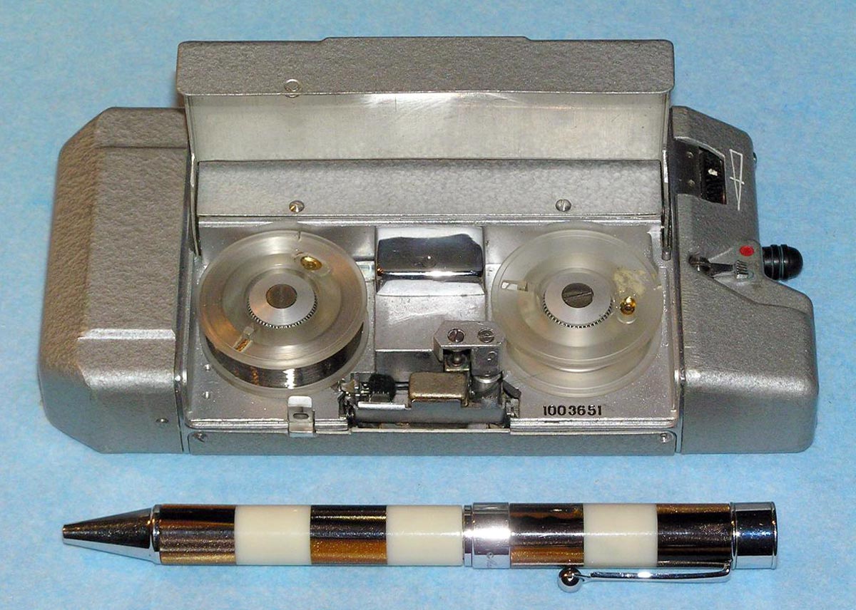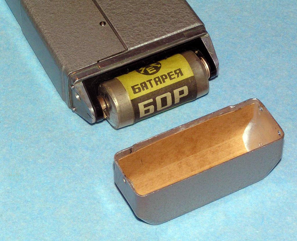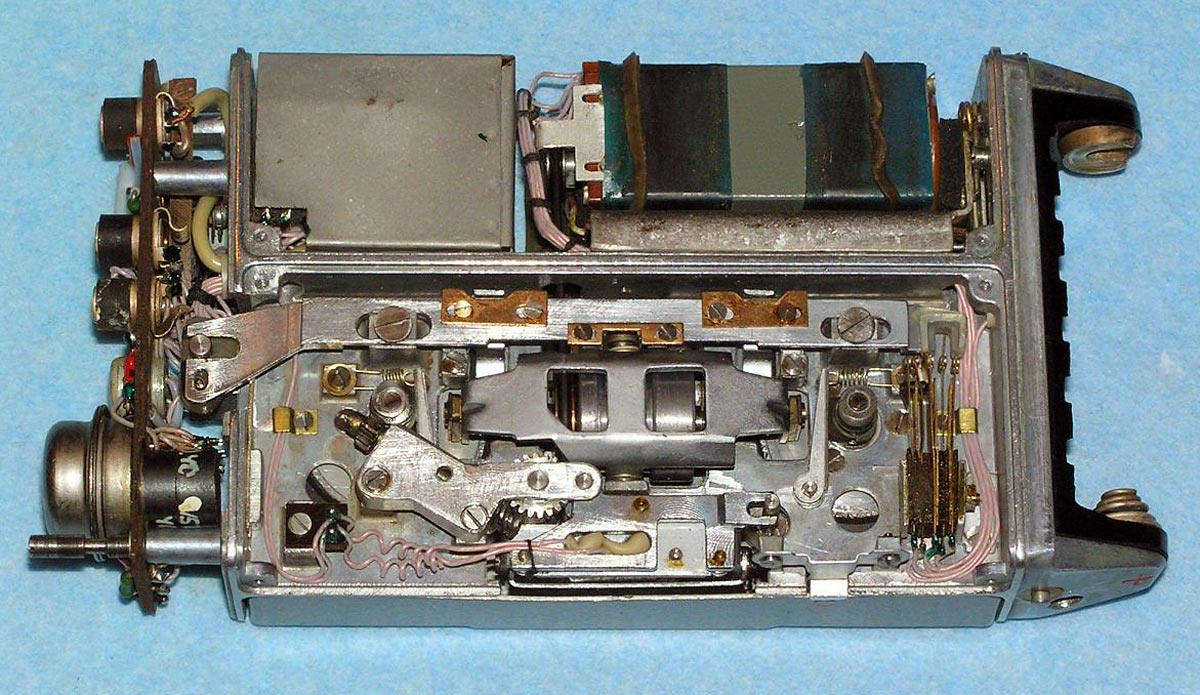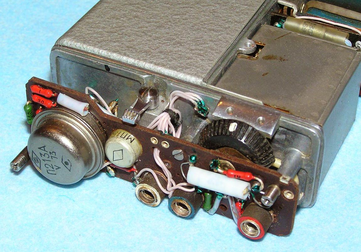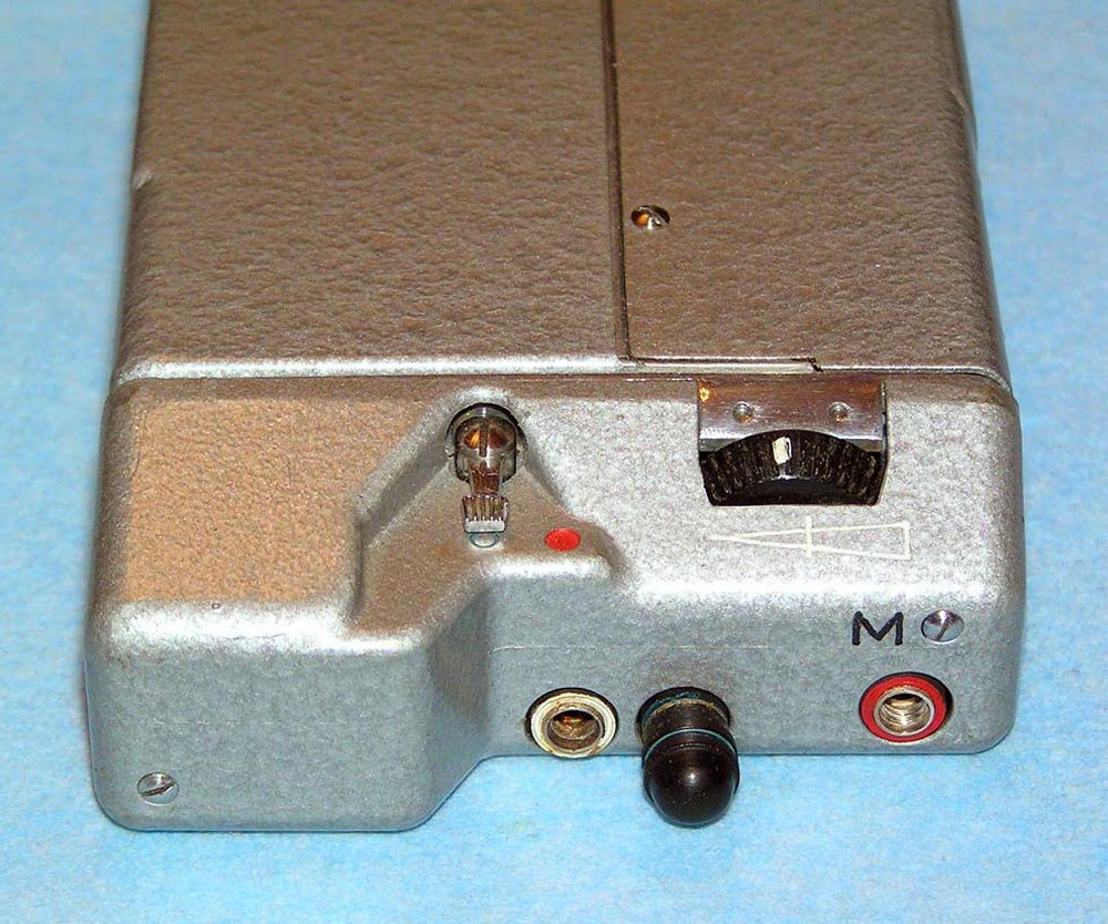 Портативный проволочный диктофон *Мезон* выпускался предположительно с 1960 по 1987 годы для спецслужб и МВД. Габариты аппарата 158х75х26 мм. Вес без питания 500 г. Проволоки на катушке хватает на 1,5 часа записи. Размеры катушки 35х12 мм. Время обратной перемотки 1 час. Питание 7 В от батареи *БОР*, элементов ОР-2К (РЦ-63), аккумуляторов *DEAC* или 5 элементов *Сатурн*, размещаемых во внешнем контейнере. Питание можно подать от внешнего источника через адаптер, вставляющийся в батарейный отсек. Запись осуществляется микрофоном *Нева* или *Т-65*, наушника ТМ-2, или от адаптера. Прослушивание записи осуществляется наушником ТМ-2 или внешним УНЧ. Для подключения микрофона, наушника и адаптера есть разъём с маркировкой *М*. Два других разъема предназначены для переключателя ДУ. Штекеры имеют резьбу, для предотвращения случайного выскакивания. Управляется диктофон переключателем, который в нерабочем состоянии находится в положении *Стоп*, отмеченном на крышке корпуса синим кружком. При переключении переключателя в положение, отмеченное красным кружком, и при закрытой верхней крышке, осуществляется запись, а при открытой - воспроизведение. Обратная перемотка проволоки осуществляется при открытой крышке и переключении переключателя по часовой стрелке до упора. Схема собрана на пяти транзисторах. Для уменьшения наводок блок усилителя помещен в пермаллоевый экран. Разъёмы, схема управления двигателем и генератор подмагничивания собраны на плате, размещенной в торце корпуса. Для регулирования уровня громкости и записи имеется аттенюатор на 3 положения. Стирающей головки нет, стирание осуществляется внешним размагничивающим дросселем. Пассик передает движение от двигателя к горизонтальному маховику, который в свою очередь вращает одну из двух обрезиненных планшайб, в зависимости от режима работы. Универсальная головка перемещается вверх - вниз с помощью червячного механизма. Имеется автостоп, срабатывающий, когда на подающей катушке заканчивается проволока. При этом на подающей катушке освобождается подпружиненный рычажок, удерживаемый витками проволоки, и нажимает на рычаг автостопа, расположенный под подающей катушкой. Последний размыкает контакты цепи двигателя. Комплект имеет необходимый набор аксессуаров, таких как дополнительные катушки, в том числе с проволкой, адаптер питания, адаптер записи от внешнего источника, адаптер для бесконтактной записи с телефонной линии, дроссель размагничивания, батарею *БОР*, чашки элементов ОР-2К (РЦ-63), наушник ТМ-2, тубу со смазкой, устройство заправки проволоки.