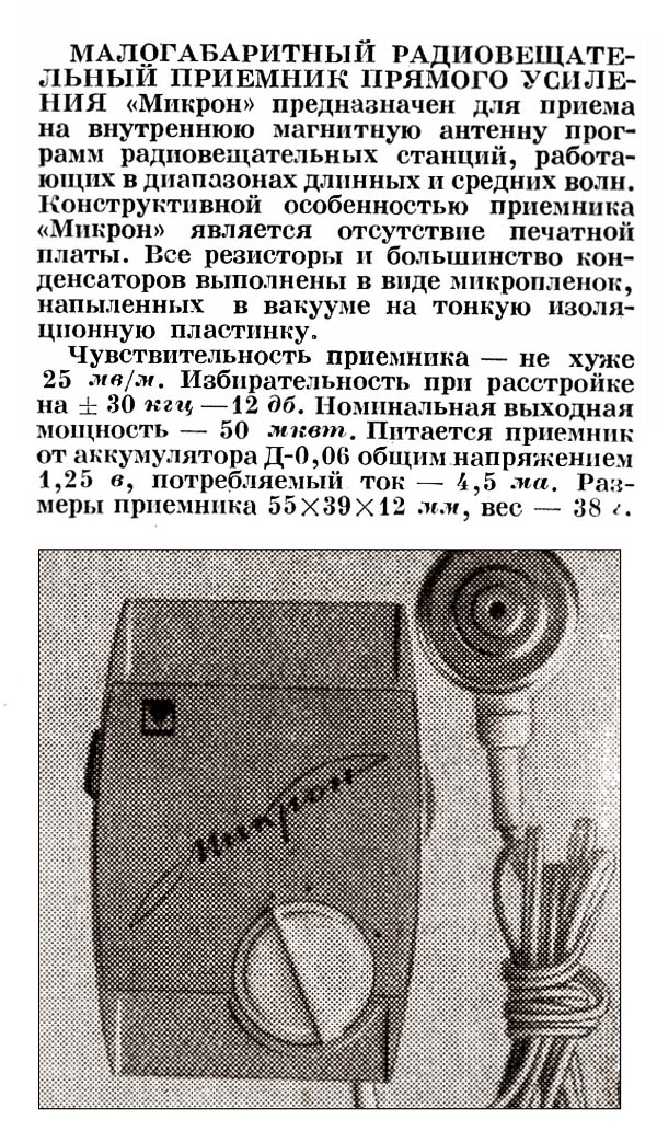 Малогабаритный радиоприёмник *Микрон* с 1969 года выпускал Минский радиозавод. Выпуск приёмника приурочен к юбилейной дате, 100-летию со дня рождения В.И.Ленина (1870-1970 г.). Радиоприёмник **Микрон** предназначен для приёма на внутреннюю магнитную антенну радиовещательных станций, работающих в диапазонах ДВ и СВ. Конструктивной особенностью модели является отсутствие печатной платы. Резисторы и большинство конденсаторов выполнены в виде микропленок, напылённых в вакууме на тонкую изоляционную пластину. Приёмник имеет чувствительность 25 мВ/м. Селективность 12 дБ. Номинальная выходная мощность 50 мкВт. Питание от аккумулятора типа Д-0,01. Потребляемый ток 4,5 мА. Габариты модели 55х39х12 мм,. Масса 38 гр. Радиоприёмник *Микрон* по схеме, конструкции и параметрам аналогичен модели **Микро**, разница лишь в оформлении.