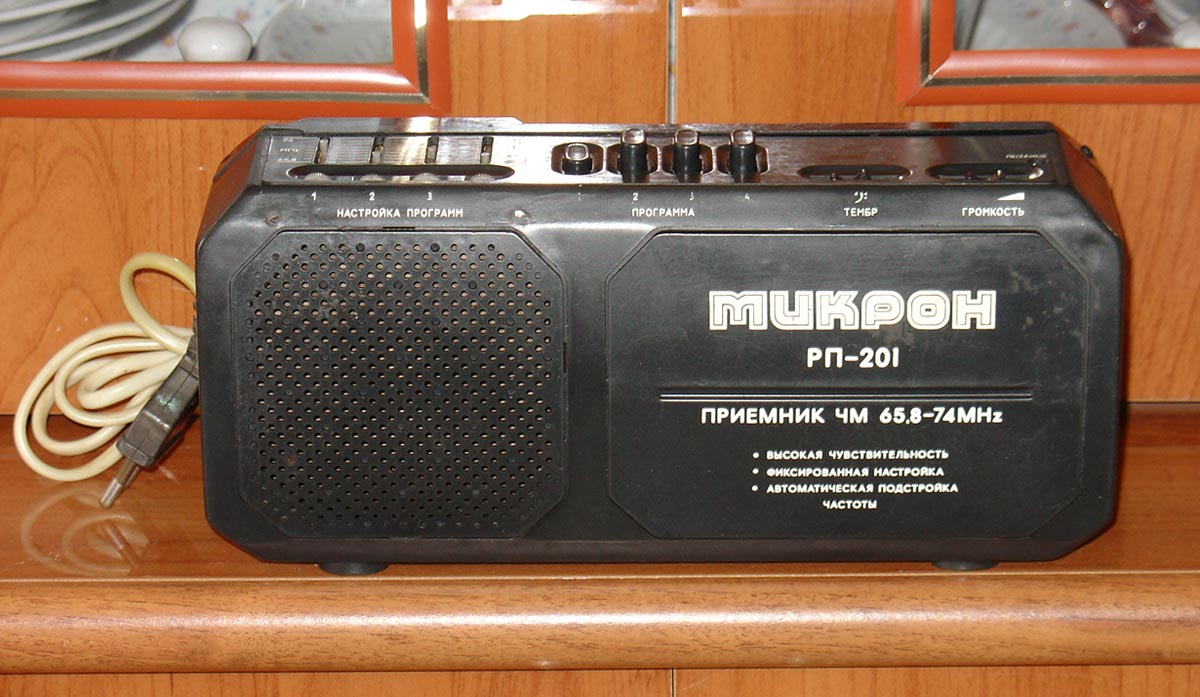 Стационарный транзисторный радиоприёмник *Микрон РП-201* с начала 1993 года выпускал завод имени Фрунзе, город Нижний-Новгород. Радиоприёмник **Микрон РП-201** выпускался для местностей не имеющих проводного трансляционного обычного или трёхпрограммного радиовещания или которое прекратило работу по экономическим причинам. Приёмник имеет высокую чувствительность и обеспечивает уверенный приём вещательных УКВ радиостанций в городской черте или сельской местности за счет пассивного или активного включения прилагаемой антенны. Электропитание осуществляется от сети переменного тока или от внешнего источника 12 В. Фиксация любых 4-х программ с последующим выходом на них простым нажатием кнопки, делает приёмник удобным в эксплуатации. Приёмник характеризует очень низкая потребляемая мощность, весьма низкий уровень шума и фона. Технические характеристики: Диапазон частот 65.8...74,0 Мгц. Чувствительность с пассивной антенны 20 мкВ, с активной 5 мкВ. Диапазон воспроизводимых частот по звуковому давлению 315...6300 Гц. ПЧ 76 кГц. Максимальная выходная мощность 0,5 Вт. Потребляемая мощность 5 Вт. Габариты радиоприёмника 250х120х80 мм. Масса 1 кг.