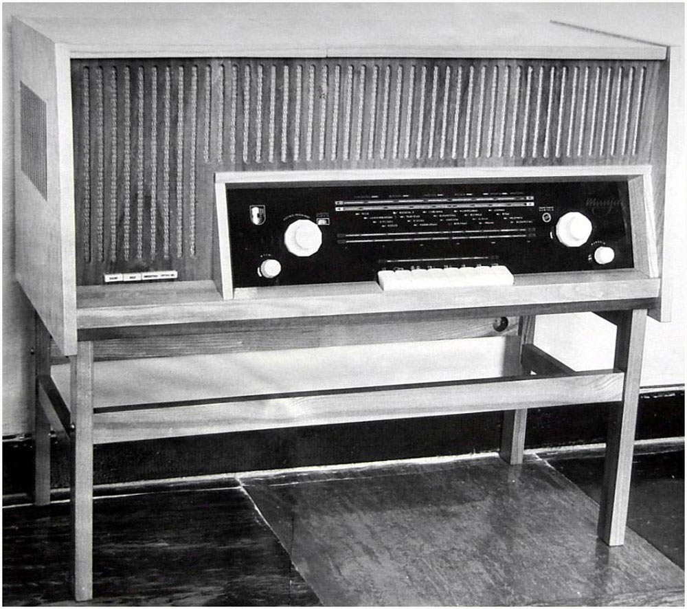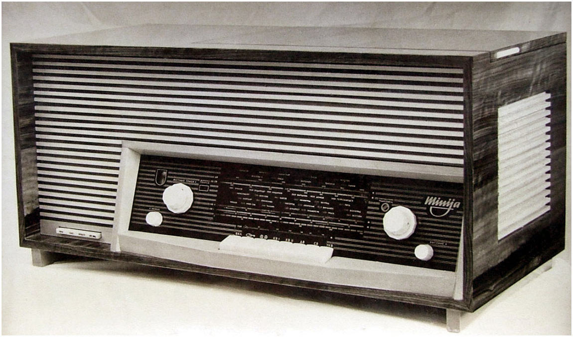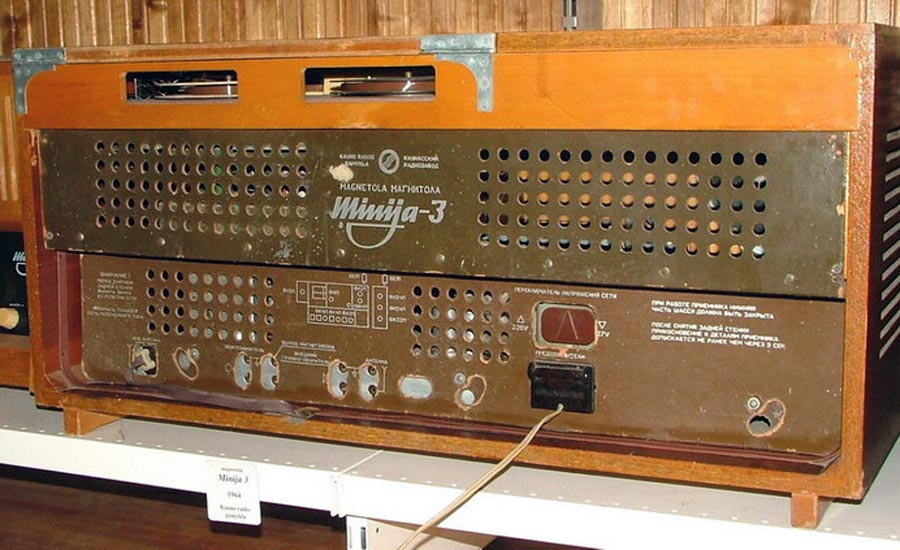 Сетевая ламповая магнитола *Миния-3* с I-кв 1964 года выпускал Каунасский радиозавод. *Миния-3* это модернизированный вариант магнитолы **Миния-2**. Магнитола представляет собой восьмиламповый приёмник 1-го класса, объединённый с магнитофонной панелью типа **Вильняле**. Магнитола служит для приёма радиостанций в диапазонах ДВ, СВ, КВ и УКВ-ЧМ, а также для записи или воспроизведения речевых и музыкальных программ. Скорости протяжки магнитной ленты 19,05 см/сек и 9,53 см/сек. Время непрерывной записи при ёмкости катушек в 350 метров и скорости 19,05 см/сек - 30 минут, при скорости 9,53 см/сек около одного часа на каждой дорожке. Номинальная выходная мощность усилителя около 1,5 Вт. Чувствительность 3 мв от микрофона и 200 мв от звукоснимателя. Рабочий диапазон частот на скорости 19,05 см/сек - 40...12000 гц, 9,53 - 63...10000 гц. Полоса пропускания тракта НЧ и АС 40...12000 гц. Коэффициент нелинейных искажений 5%. Относительный уровень помех -40 дб. Коэффициент детонации 0,3% на скорости 9,53 см/сек. Частота генератора тока стирания и подмагничивания 55 кгц. Потребляемая мощность при работе приёмника 85 вт, магнитофона 125 вт. Размеры магнитолы 826х404х377 мм. Масса 29 кг. Магнитола размещена в деревянном декоративном ящике. Под верхней крышкой расположена МП, где находятся подкатушники, блок головок, ручки переключения скорости, рода работы, уровня записи, кнопка временный стоп, индикатор уровня записи, гнездо микрофона. На передней стенке, под шкалой приёмника находится клавишный переключатель диапазонов, регулятор громкости и тембров. АС состоит из двух громкоговорителей типа 4ГД-28 расположенных на передней панели слева, и одного бокового 1ГД-28. На задней стенке находятся гнёзда антенн, заземления, внешнего громкоговорителя, звукоснимателя и выхода сигнала. Там же находится переключатель сети и предохранители. Магнитола выпускалась в настольном и напольном вариантах.