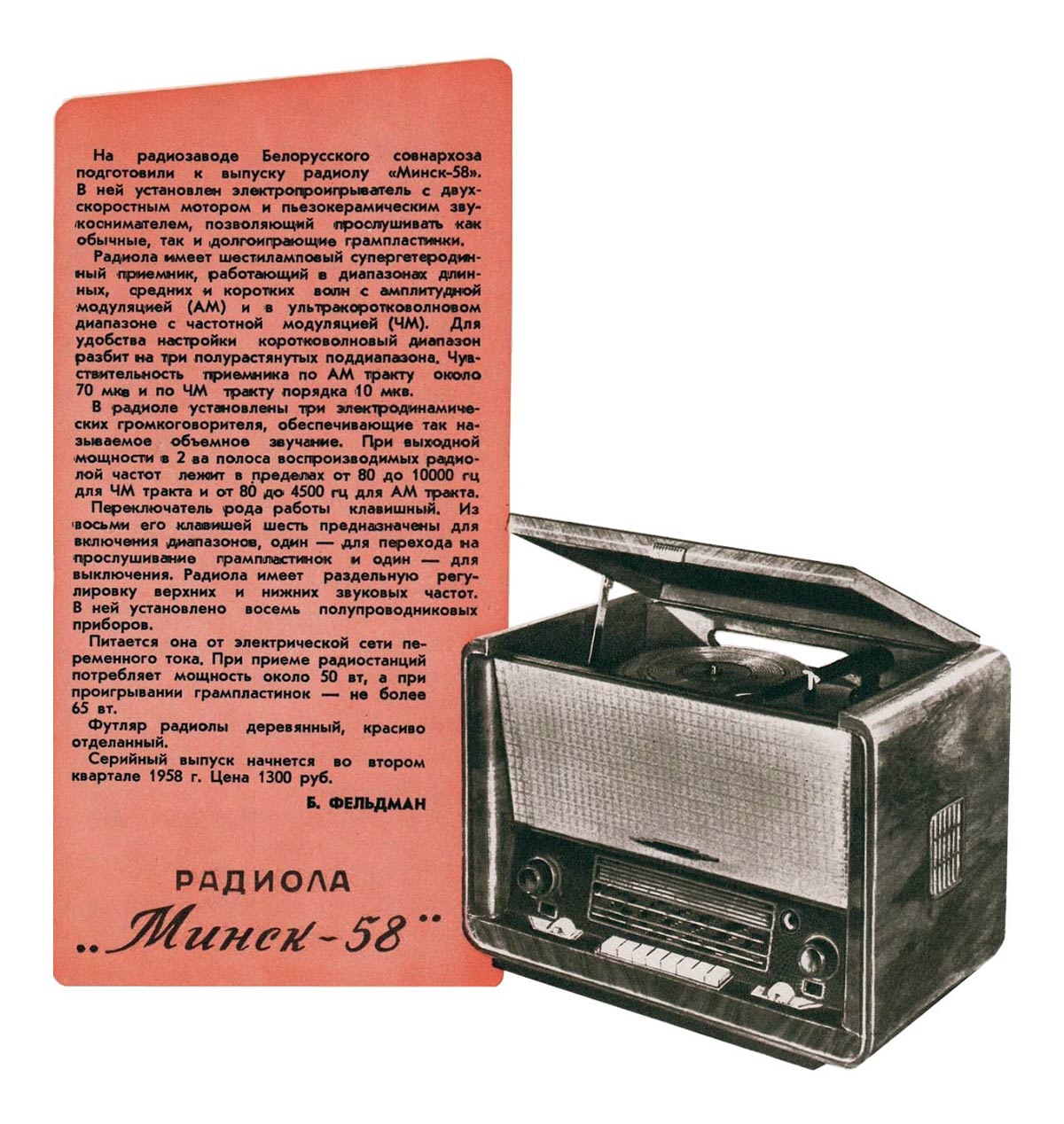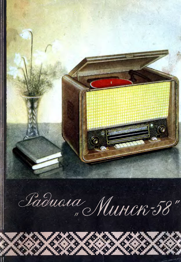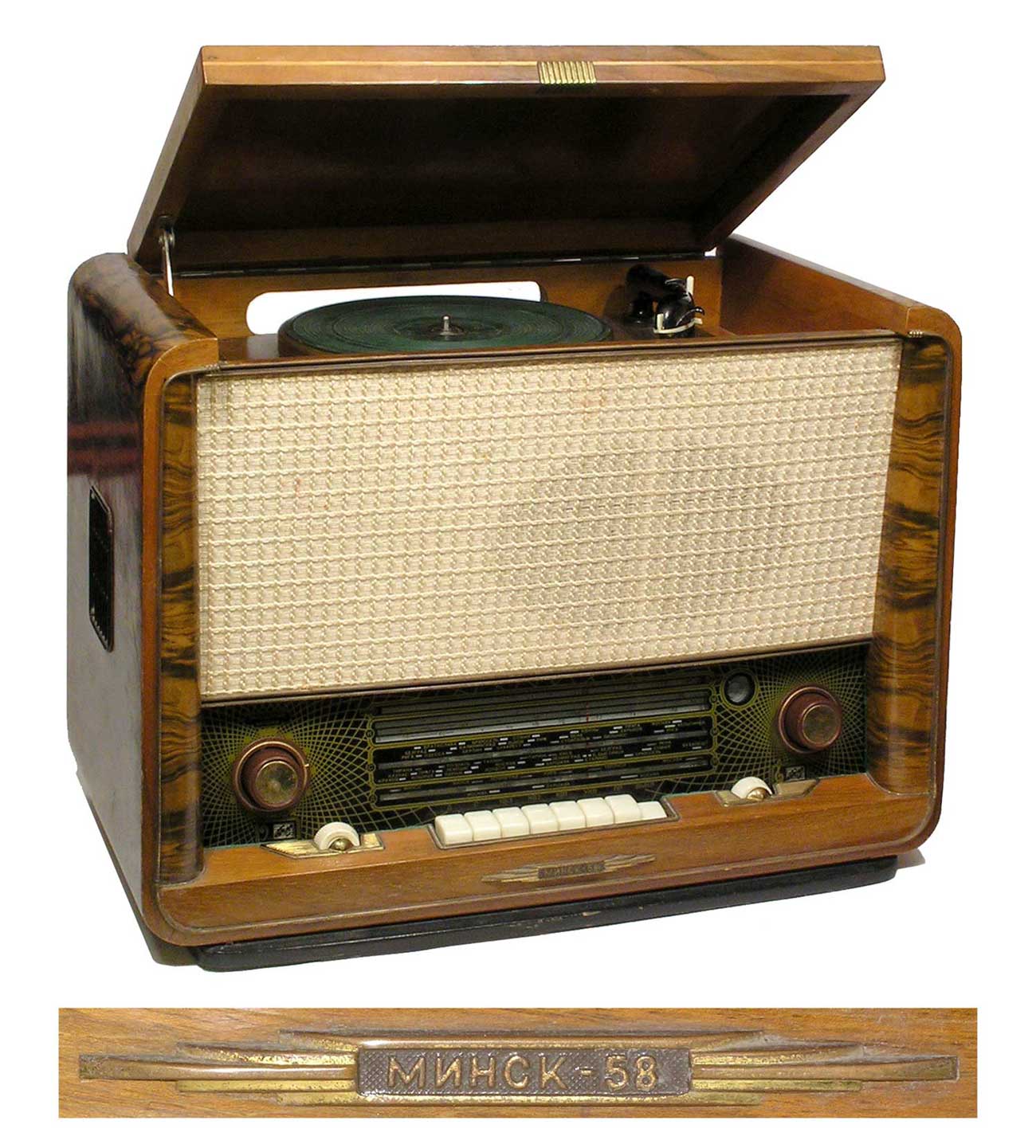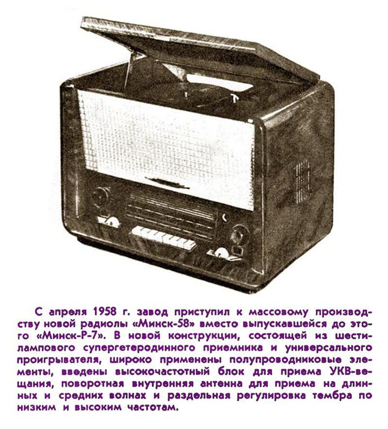 Радиола сетевая ламповая *Минск-58* с 1958 года выпускалась на Минском радиозаводе. Радиола **Минск-58** предназначена для приёма радиовещательных станций, работающих в диапазонах: ДВ, СВ, KB, УКВ, а также для проигрывания обычных и долгоиграющих пластинок. Диапазон KB разбит на 3 поддиапазона. Для приёма в диапазоне ДВ, СВ применена внутренняя поворотная магнитная антенна, для приёма в УКВ-ЧМ диапазоне внутренний диполь. В радиоле осуществлена раздельная и плавная регулировка тембра по низким и высоким звуковым частотам, плавная регулировка полосы пропускания по промежуточной частоте в AM тракте (от 3,5 до 18 кГц), автоматическая регулировка усиления. Акустическая система радиолы состоит из 3-х громкоговорителей, одного широкополосного 5ГД-14 и двух высокочастотных ВГД-1, обеспечивающая малонаправленную характеристику излучения во всем диапазоне воспроизводимых звуковых частот. При приёме УКВ-ЧМ станций и проигрывании долгоиграющих пластинок акустическая система радиолы и её электрический тракт обеспечивают эффективное воспроизведение звукового спектра в полосе звуковых частот - 70...10000 Гц. В радиоле применены следующие радиолампы: 6Н3П, 6И1П, 6К4П, 6Н2П, 6П14П, 6Е5С. Номинальная выходная мощность усилителя низкой частоты 2 Вт. Размеры радиолы - 590х426х330 мм. Вес 18 кг.