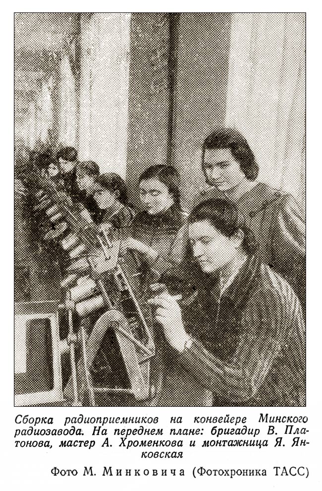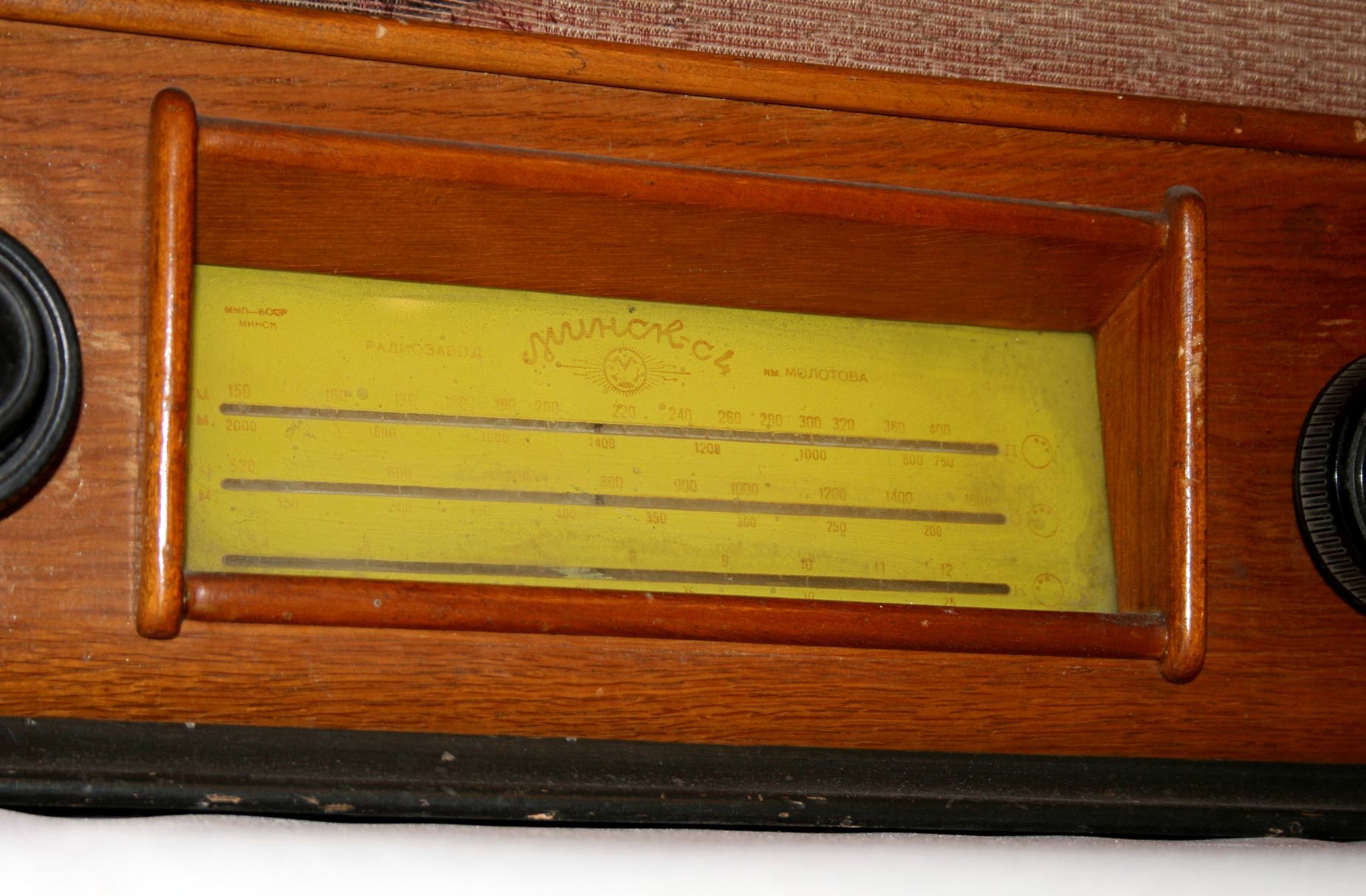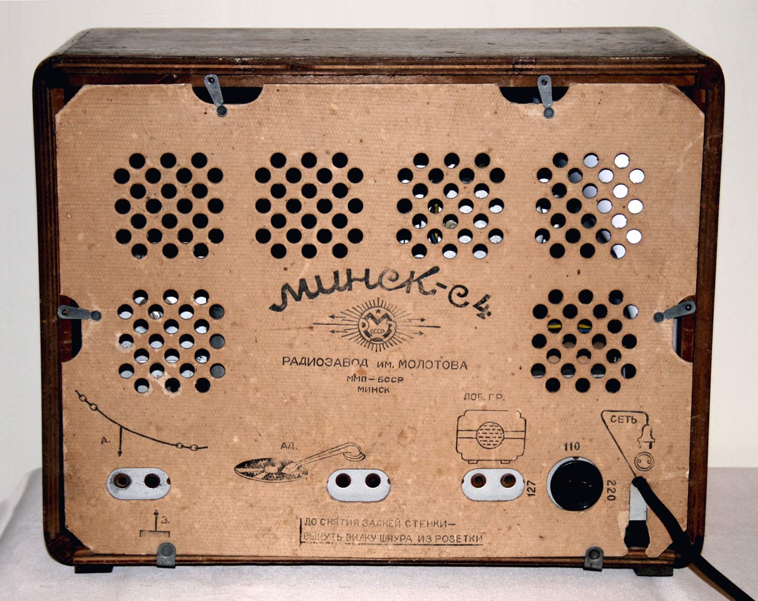 Радиоприёмник *Минск С-4* с 1947 года выпускал Минский радиозавод им. Молотова. **Минск С-4** - четырёхламповый, трёхдиапазонный ДВ, СВ, КВ, сетевой настольный супергетеродинный радиоприёмник, собранный в деревяном полированном футляре. С начала 1951 года радиоприёмник выпускался и Минским радиозаводом. Диапазоны: ДВ: 150...410 кГц (2000...732 м), СВ: 520...1600 кГц (577...187 м), КВ 5,5...15,4 МГц (54,7...19,46 м). ПЧ 465 кГц. Чувствительность в диапазонах: ДВ, СВ - 200 мкВ, КВ - 300 мкВ. Избирательность по соседнему каналу в диапазонах: ДВ, СВ, КВ - 26 дБ. Номинальная выходная мощность 0,7 Вт. Полоса воспроизводимых частот 150...3000 Гц. Потребляемая от сети мощность 50 Вт.