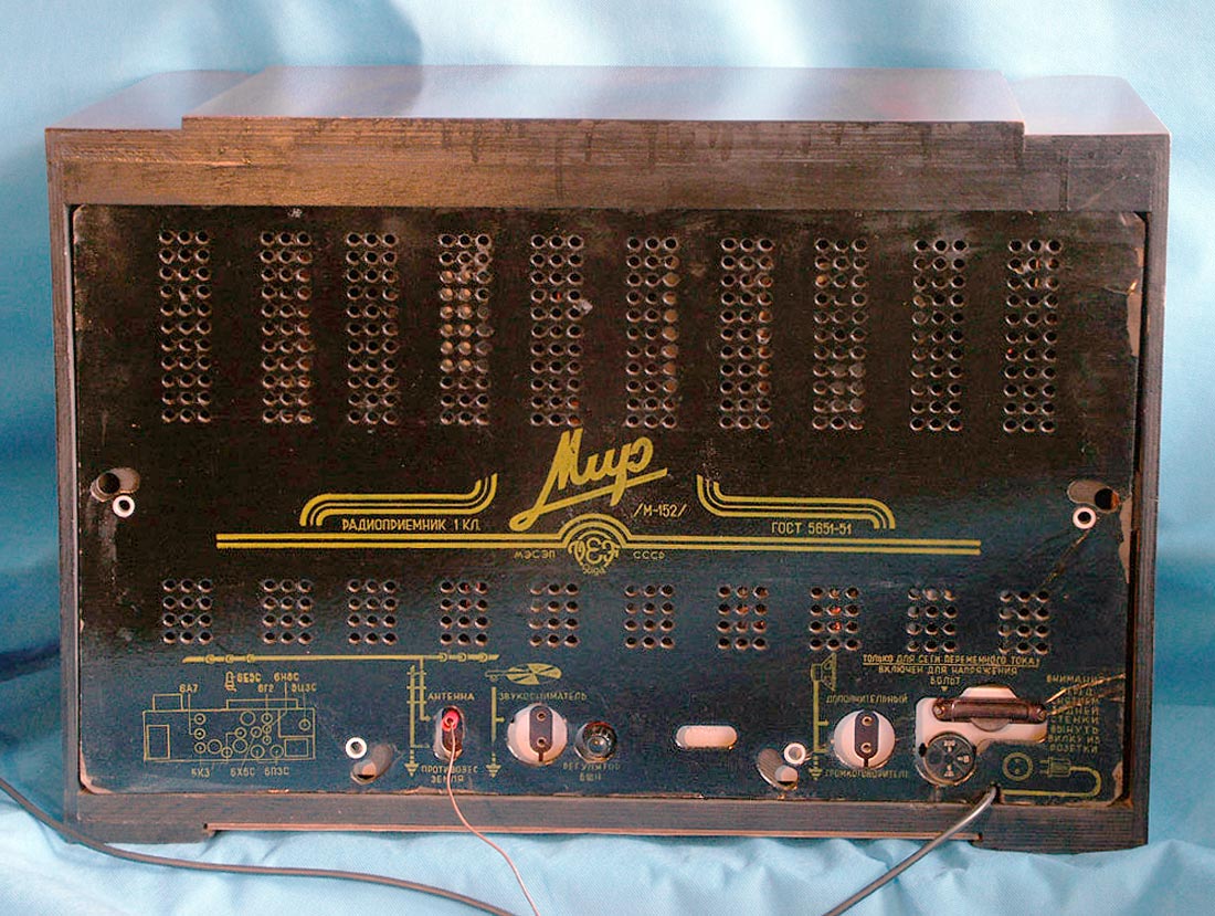 Радиоприёмник сетевой ламповый *Мир М-152* с 1952 года выпускал Рижский Государственный электротехнический завод ВЭФ. *Мир М-152* представляет собой 13 ламповый всеволновый супергетеродин 1 класса, с питанием от сети переменного тока. Предназначен для приёма радиостанций в 6-ти диапазонах: ДВ, СВ и КВ и для воспроизведения грамзаписи внешним ЭПУ. КВ диапазон разбит на 4 поддиапазона, перекрывающие радиовещательные участки от 25 до 75 метров. УПЧ имеет регулятор полосы пропускания от 7 до 13 кГц. Чувствительность 50 мкВ. Чувствительность со входа звукоснимателя 160 мВ. Избирательность по соседнему каналу 60 дБ, по зеркальному каналу в ДВ 60 дБ, СВ 50 дБ, КВ 34 дБ. Номинальная выходная мощность 4 Вт. Полоса воспроизводимых частот звука на громкоговорителях 8ГД-2 и 3ГД-2 - 60...6500 Гц. Потребляемая мощность 160 Вт. Габариты приёмника 720х490х370 мм. Его вес 35 кг.