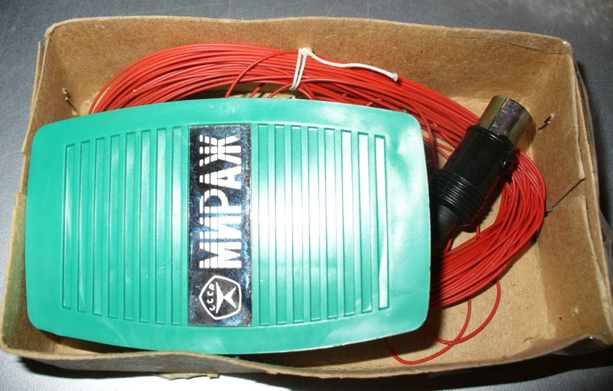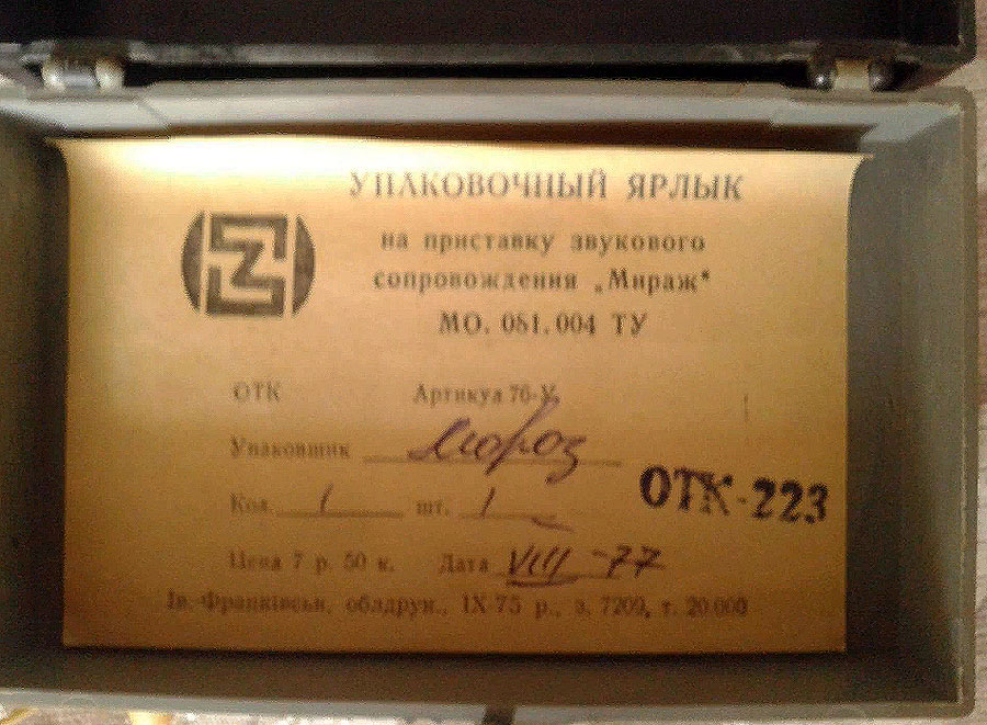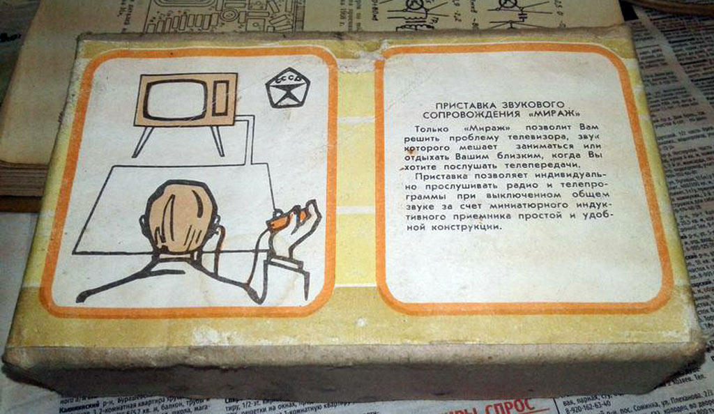 Приставка звукового сопровождения *Мираж* выпускалась предположительно с 1975 года. Приставка предназначена для беспроводного прослушивания звукового сопровождения бытовой аппаратуры в пределах комнаты. В самой приставке собрана схема высокочувствительного усилителя звуковой частоты, на входе которого включена низкочастотная катушка магнитной антенны. Выход усилителя нагружен на головной телефон. Выход УМ магнитофона, электрофона, телевизора или приёмника нагружен на замкнутую петлю провода, который растянут на полу или на стене комнаты. В петле образуется переменное электромагнитное поле звуковой частоты которое и принимает приставка *Мираж*. Где-то в начале 80-х внешний вид и цена приставки изменилась. Приставка выпускалась вплоть до начала 90-х.