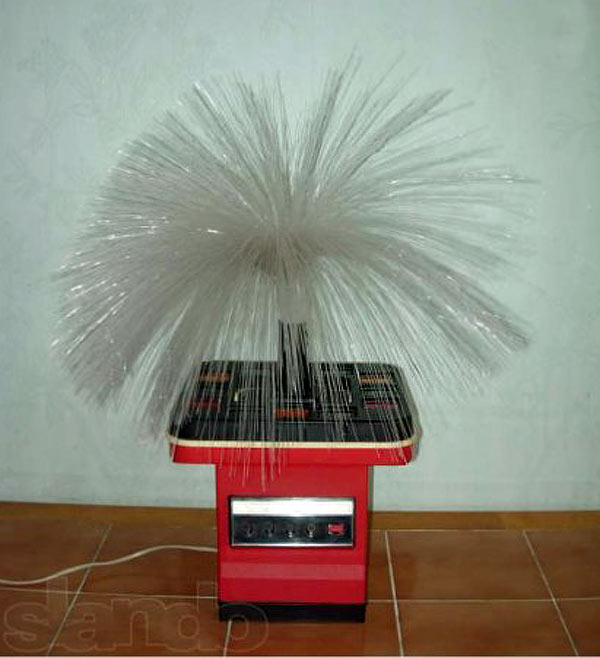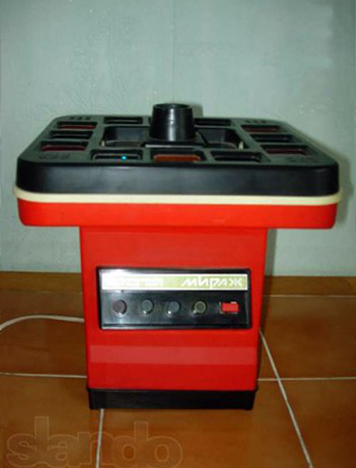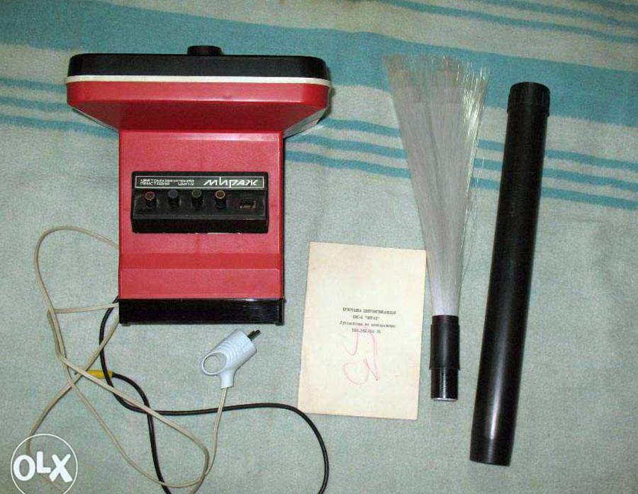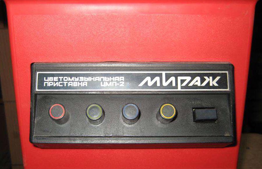 Цветомузыкальная приставка *Мираж ЦМП-2* с 1989 года выпускалась Конструкторским Бюро Автоматики НПО *Химавтоматика*. ЦМП предназначена для получения светоцветовых эффектов при прослушивании речевых и музыкальных программ от любых источников. Эффекты проявляются в виде радужного свечения нитей из светооптического волокна различными цветами и оттенками, а так же изменяющейся яркости. Диапазон рабочих частот приставки 20...20000 Гц разделён на четыре канала. Красный обозначает низкие частоты, зелёный - средние и синий - высокие. Жёлтый свет является фоновым. Масса приставки 4 кг. Цена 198 рублей.