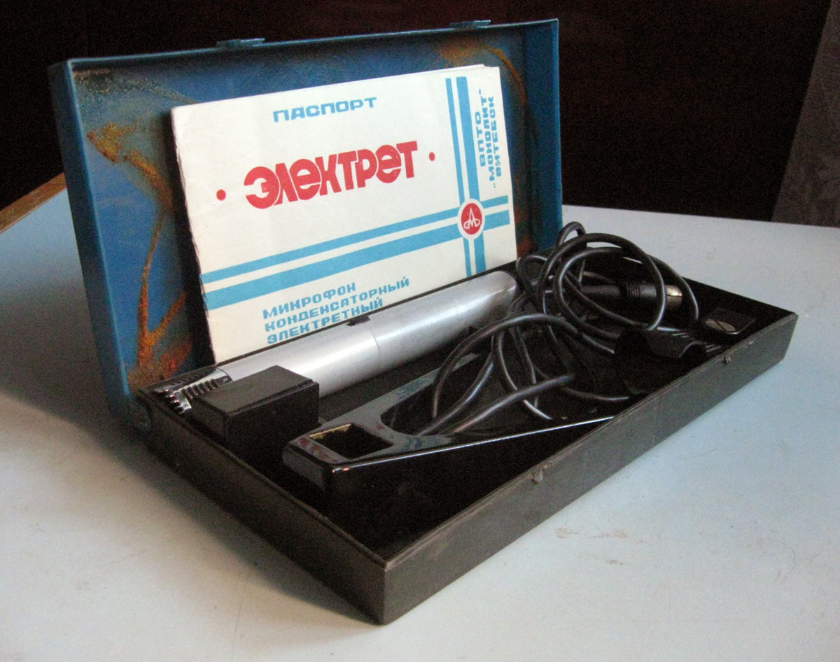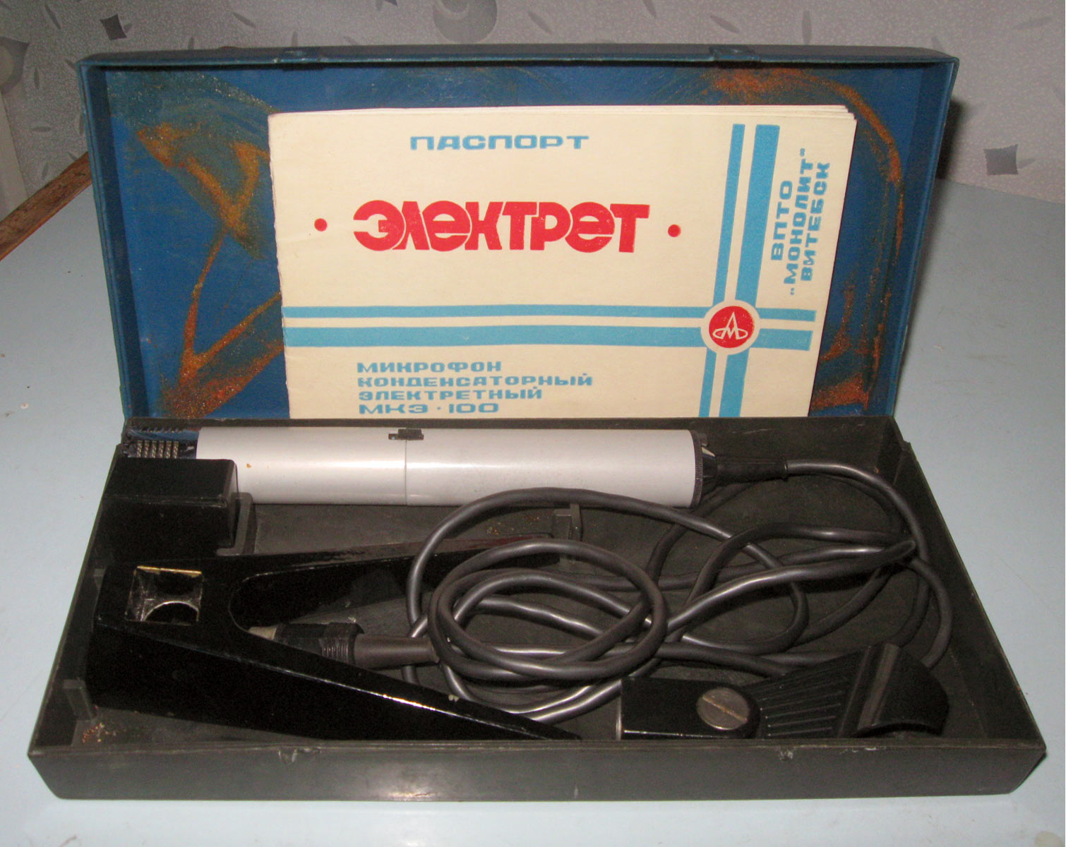 Микрофон конденсаторный электретный *МКЭ-100* (Электрет) выпускался предположительно с 1977 года несколькими предприятиями страны.