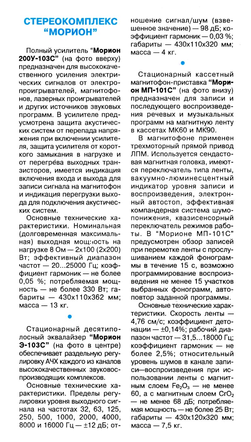 Стереокомплекс *Морион* с 1995 года выпускал выпускал Пермский завод аппаратуры дальней связи. Состоит из магнитофона-приставки *МОРИОН МП-101С*, эквалайзера *МОРИОН Э-103С* и полного усилителя *МОРИОН 200У-103С*. Модели выпускались в разное время и объединены в 1995 году.