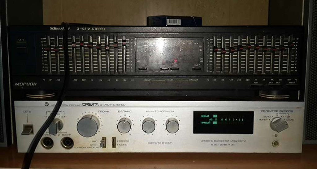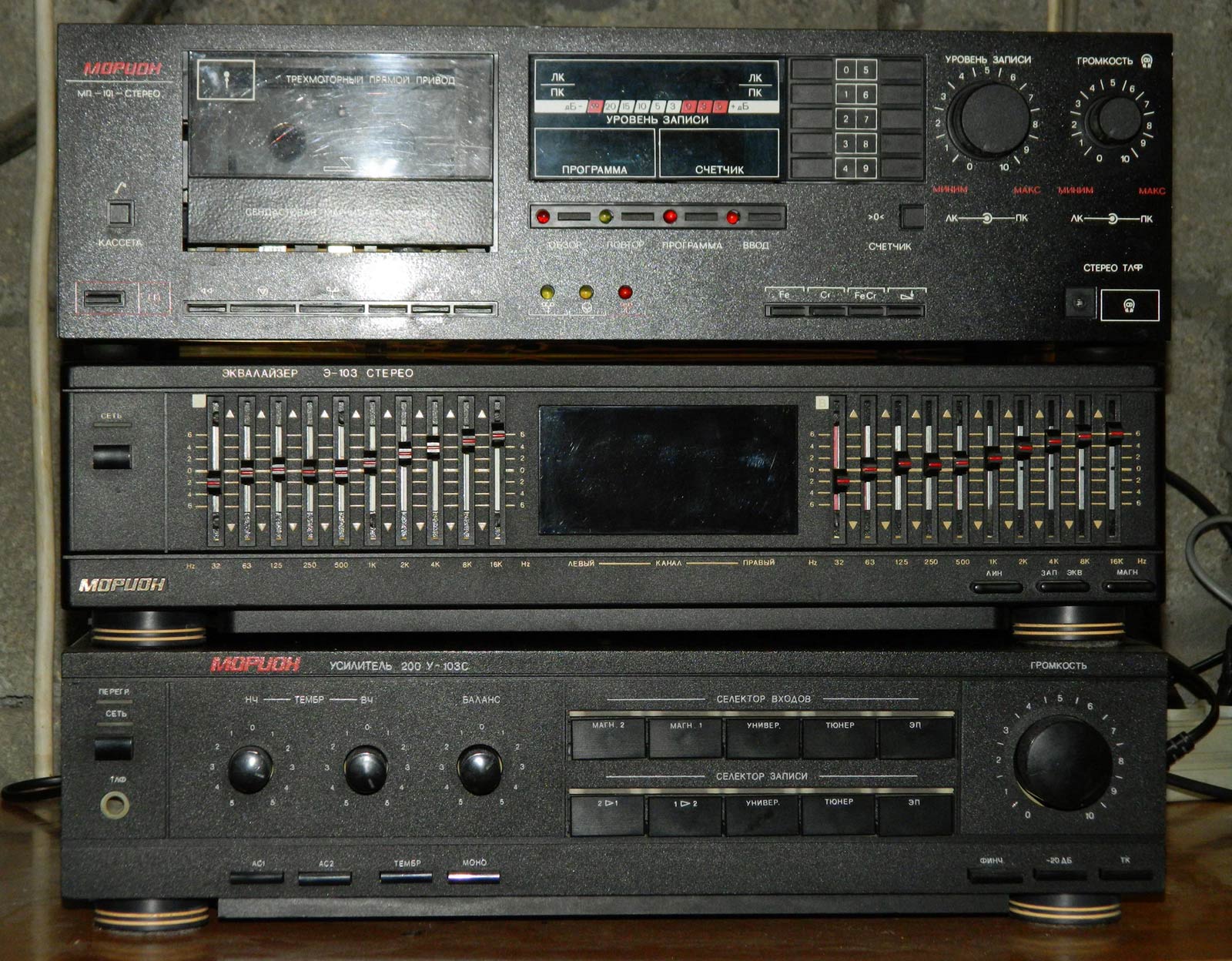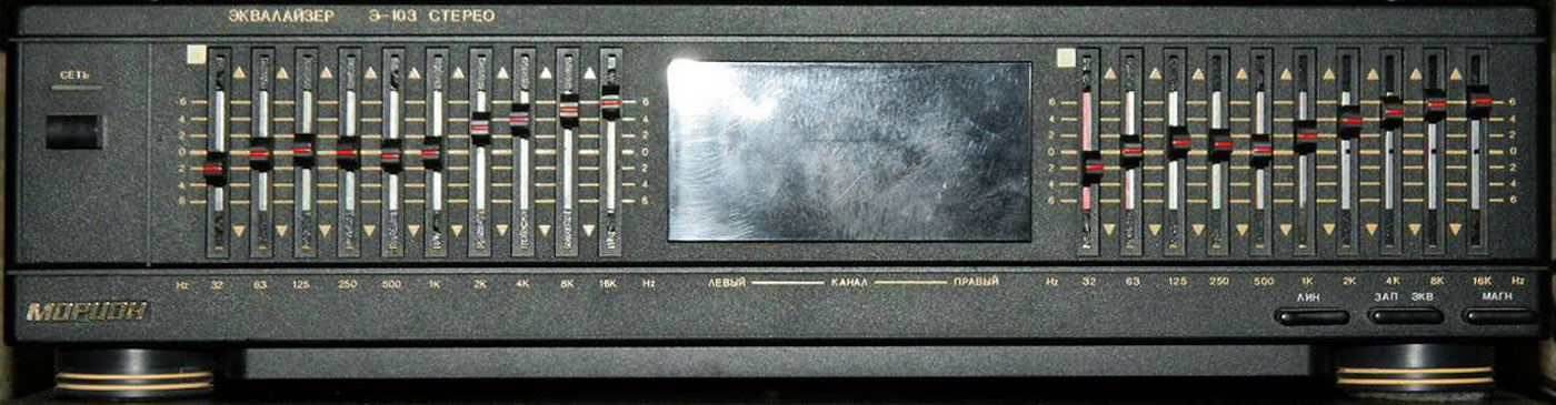 Эквалайзер *Морион Э-103-стерео* выпускался с начала 1995 года Пермским АО *Морион*. Эквалайзер *Морион Э-103 стерео* предназначен для корректировки АЧХ звуковых стереофонических фонограмм. Эквалайзер входил в радиокомплекс *Морион*, но продавался так же и как автономный аппарат. В 1995 году АО *Морион* выпустил небольшую партию эквалайзеров *Морион Э-103-2 стерео* со спектроанализатором.