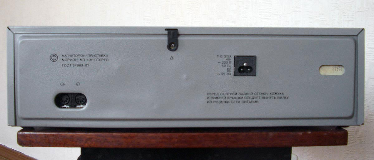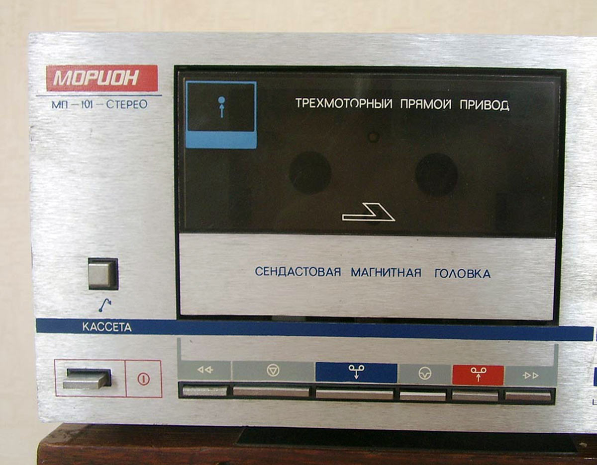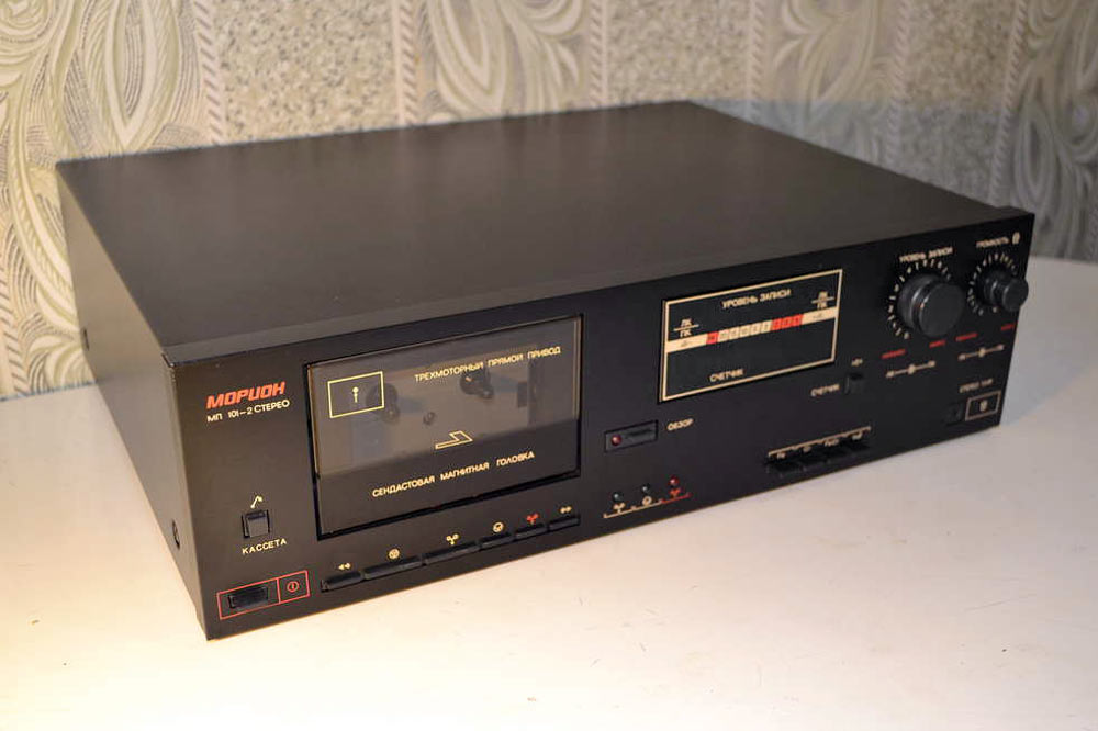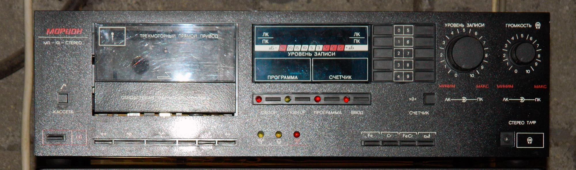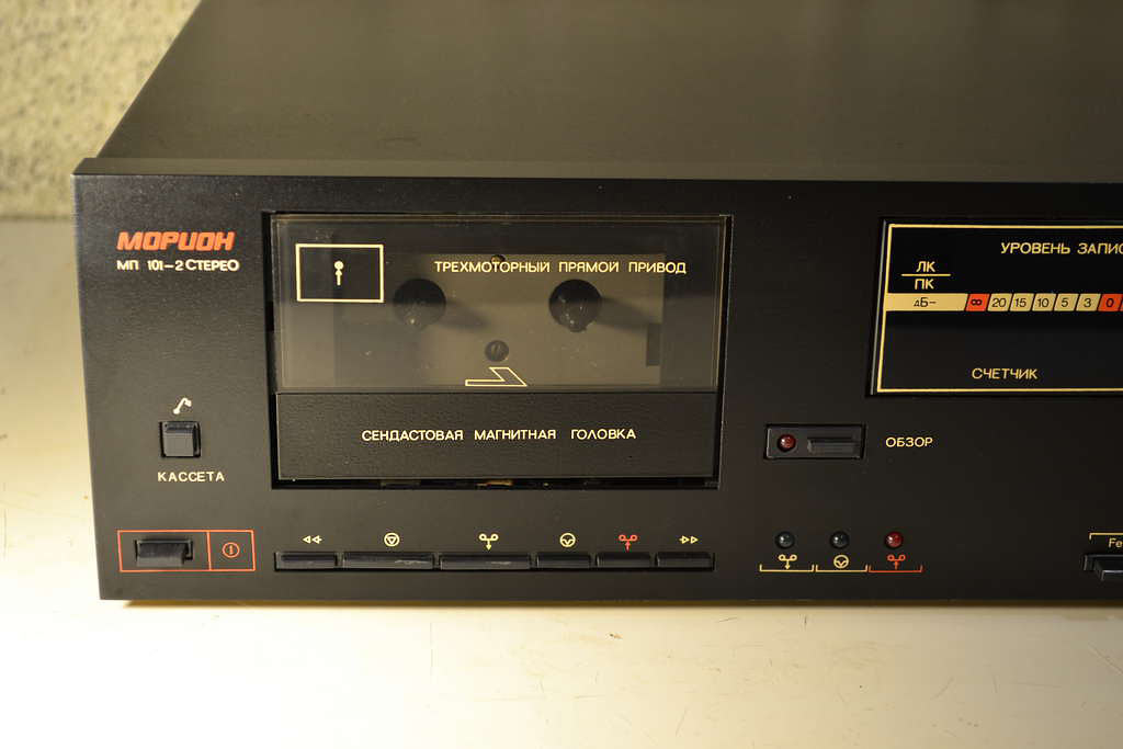 Кассетный магнитофон-приставка *Морион МП-101-стерео* с 1987 года выпускал Пермский завод аппаратуры дальней связи. МП 1-й группы сложности **Морион-101-стерео** построен на базе МП **Вега МП-120-стерео** и предназначен для высококачественной записи на магнитную ленту фонограмм и их воспроизведения через стереофонические телефоны и внешнее УКУ с АС. В модели применено псевдосенсорное управление режимами работ, имеется автостоп, электронный счётчик расхода ленты, компандерный шумоподавитель, программатор для воспроизведения заранее выбранных фрагментов фонограммы с индикацией их номера, предусмотрена возможность работы в режиме обзор. В МП применена сендастовая магнитная головка. Скорость протяжки ленты 4,76 см/сек. Коэффициент детонации 0,15%. Диапазон частот звука при использовании ленты **Fe** - 40...14000 гц, **Cr** - 31,5...16000 Гц. Уровень шумов и помех в канале З/В -56 дБ. Габариты МП - 430х320х120 мм, масса 7,5 кг. Цена 500 рублей. МП работала и в комплексе, состоящим из эквалайзера *Морион Э-103-стерео* и усилителя *Морион 200У-103-стерео*. С начала 1993 года магнитофон-приставка выпускалась с упрощениями под наименованиями *Морион МП-101-1-стерео* без шумоподавителя и *Морион МП-101-2-стерео* без шумоподавителя и блока для програмирования.