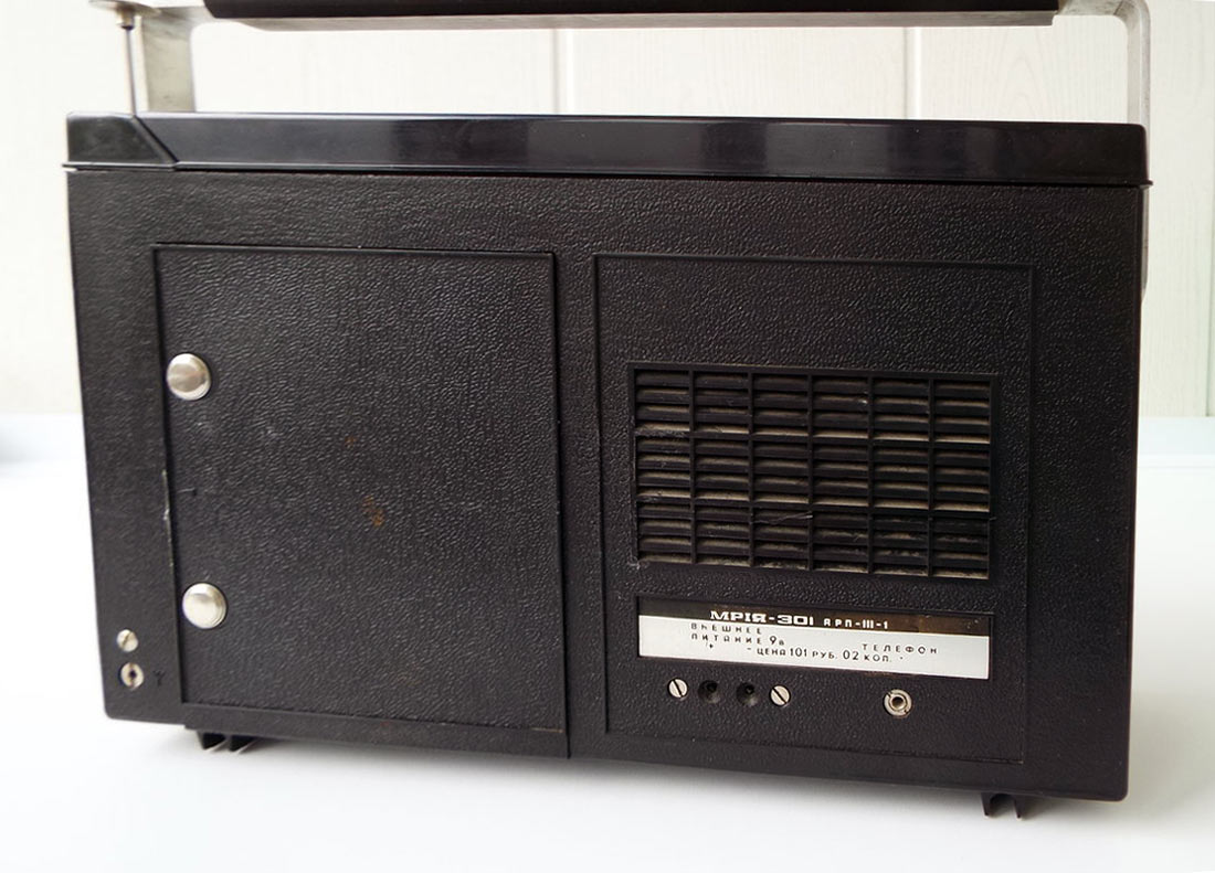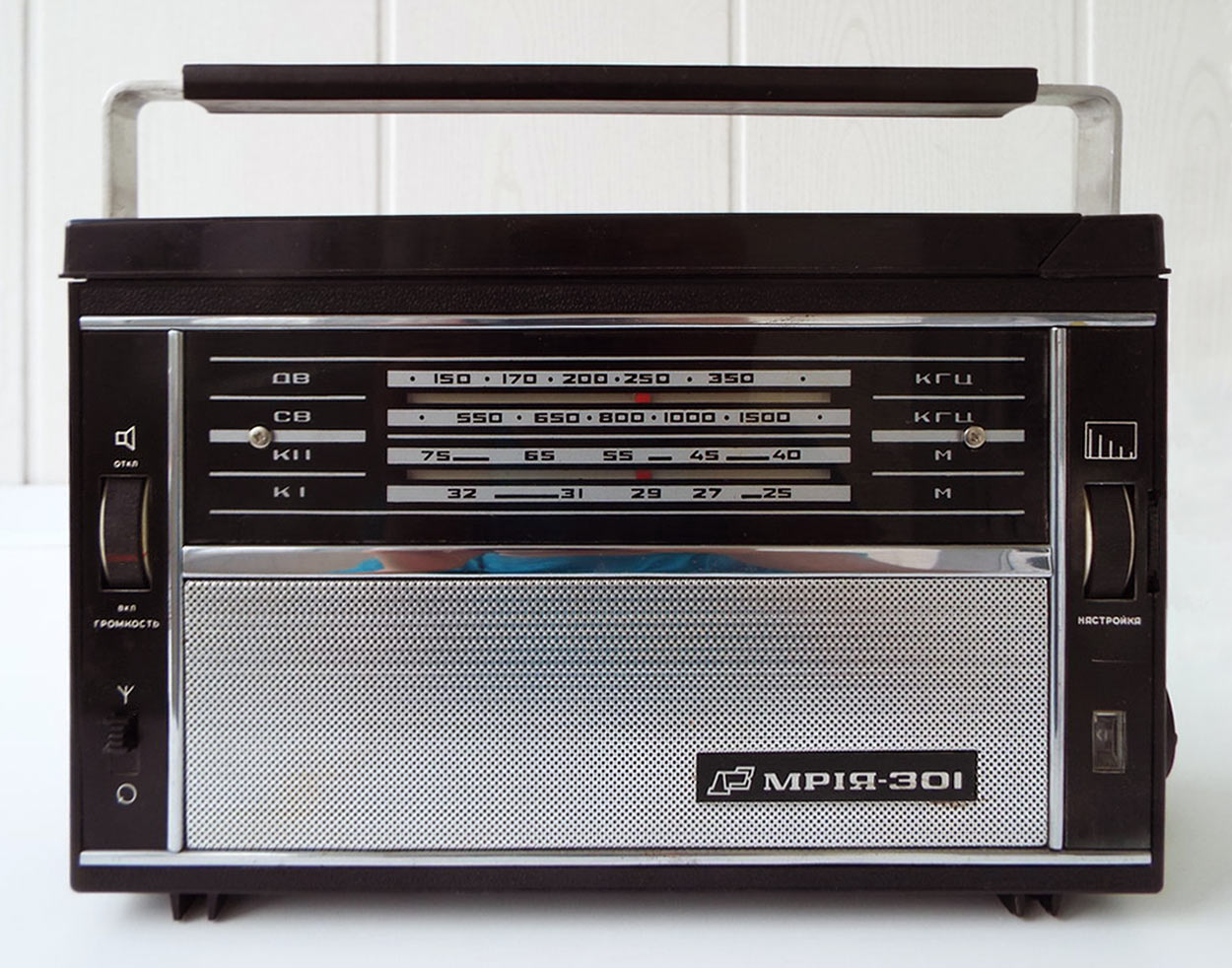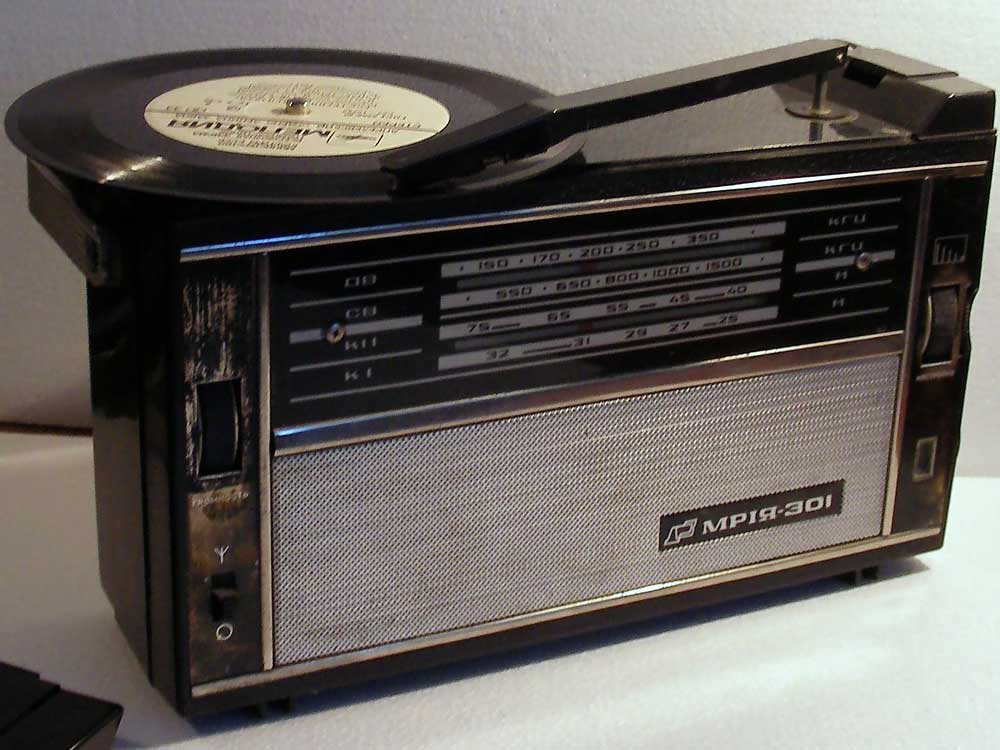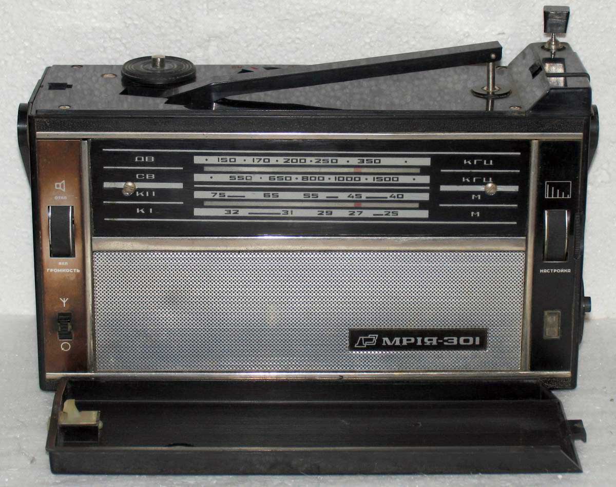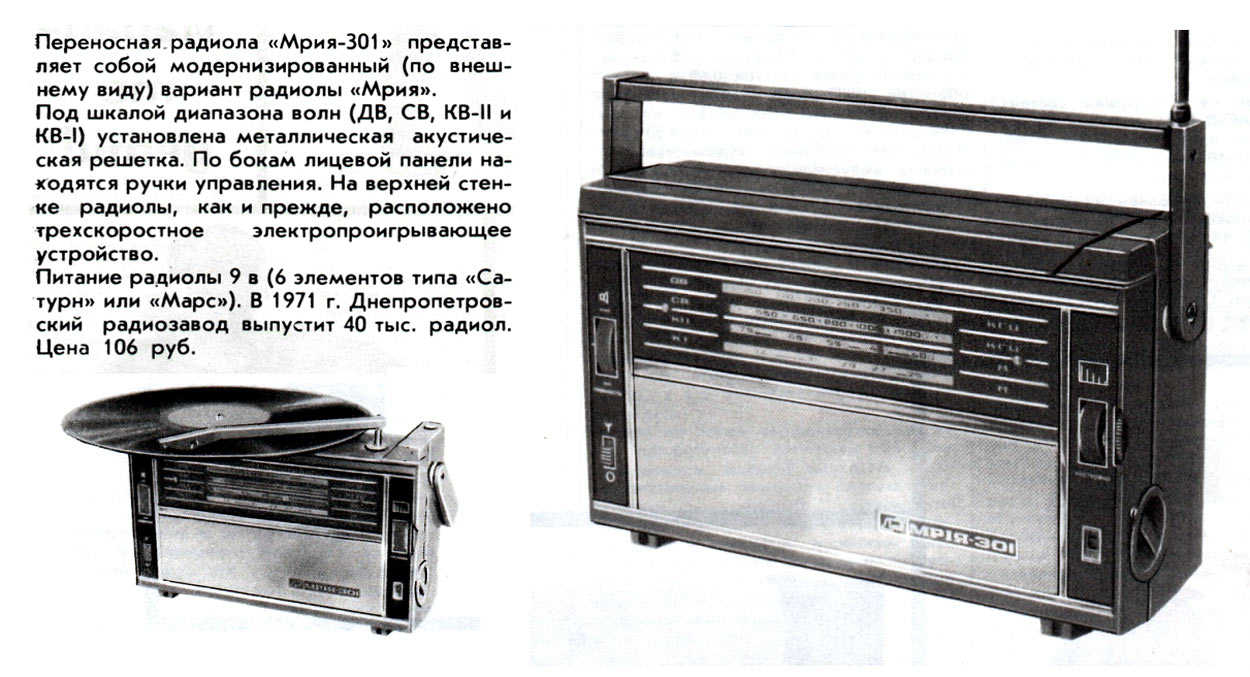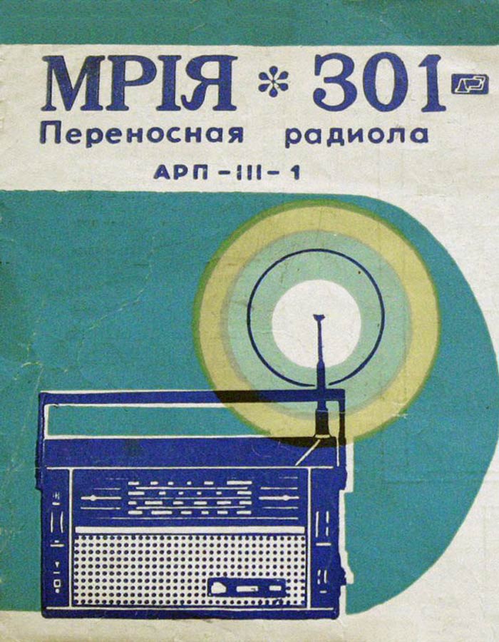 Портативная транзисторная радиола 3-го класса *Мрия-301* с 1971 выпускалась Днепропетровским радиозаводом. **Мрия-301** - радиола на 9 транзисторах и 2 диодах с электропроигрывающим устройством типа ЭПУ-6-9В. Диапазоны принимаемых волн: ДВ, СВ, КВ-1 - 31...25 м и КВ-2 - 75...41 м. В диапазоне КВ приём ведется на штыревую (телескопическую) антенну. Максимальная чувствительность при выходной мощности 50 мВт: на ДВ 500 мкВ/м, СВ 200 мкВ/м, КВ 30 мкВ. Реальная чувствительность на ДВ 1,5 мВ/м, СВ 0,8 мВ/м и КВ 100 мкВ. Избирательность по соседнему каналу: на ДВ, СВ не менее 40 дБ. Ослабление зеркального канала на ДВ - 30, СВ - 26, КВ - 12 дБ. Действие АРУ: при изменении входного сигнала на 26 дБ, выходное напряжение изменяется на 6 дБ. Полоса воспроизводимых звуковых частот 300...3500 Гц. Номинальная выходная мощность, при КНИ всего тракта приёмника не более 5% - 250 мВт. Среднее звуковое давление в полосе воспроизводимых звуковых частот 0,3 Па. Источник питания: шесть элементов типа 373. Напряжение питания 9 В. Ток, потребляемый приёмником, при отсутствии сигнала 15 мА. Работоспособность радиоприёмника сохраняется при снижении напряжения питания до 4 вольт. Длительность работы приемника при средней громкости от одного комплекта элементов типа 373: не менее 100 ч. Электропроигрывающее устройство имеет 3 частоты вращения диска: 33; 45 и 78 об/мин. Ток, потребляемый электродвигателем не более 85 мА. Габариты радиолы 288 х 117 х 90 мм. Масса с батареями 3 кг.