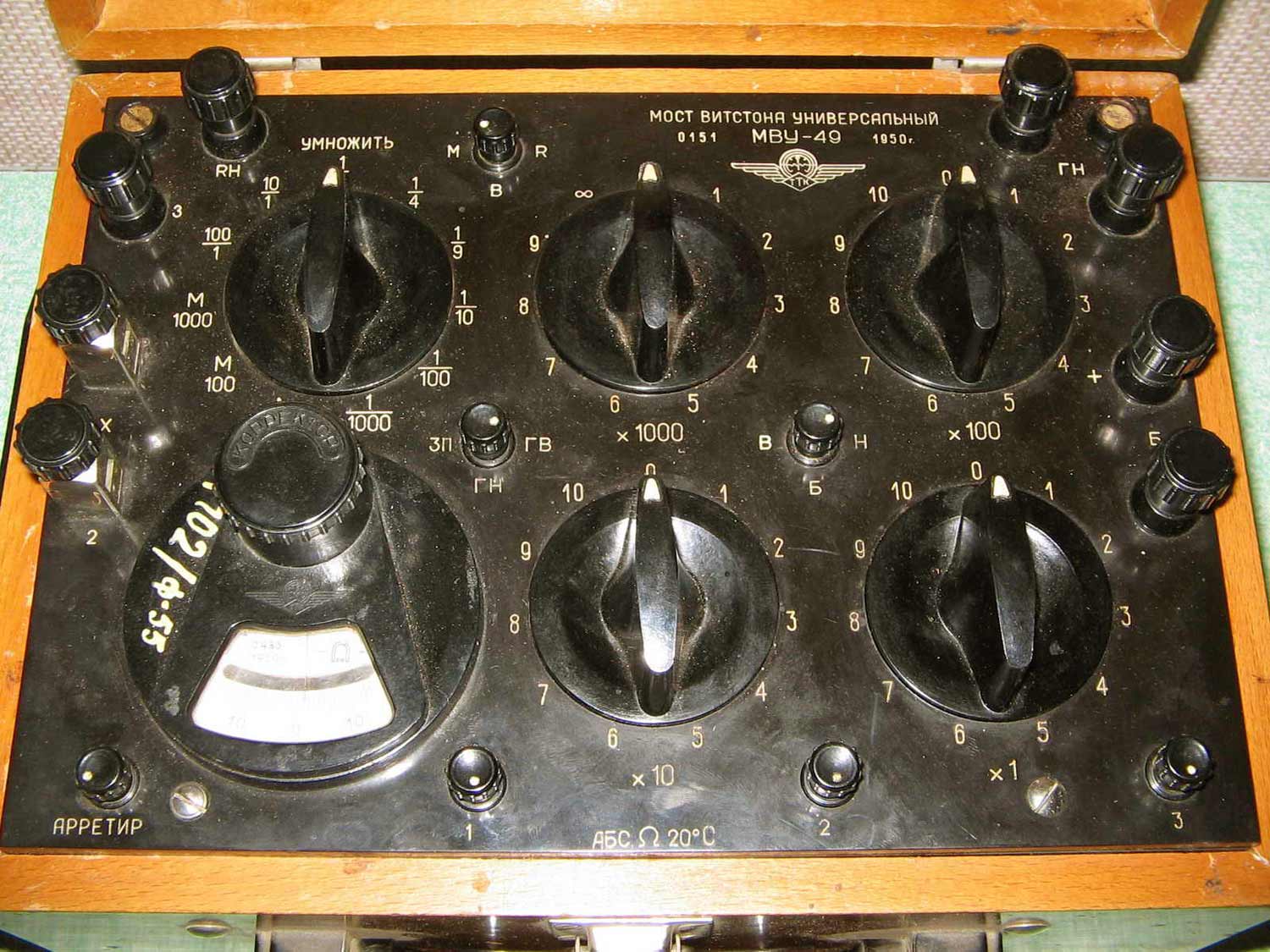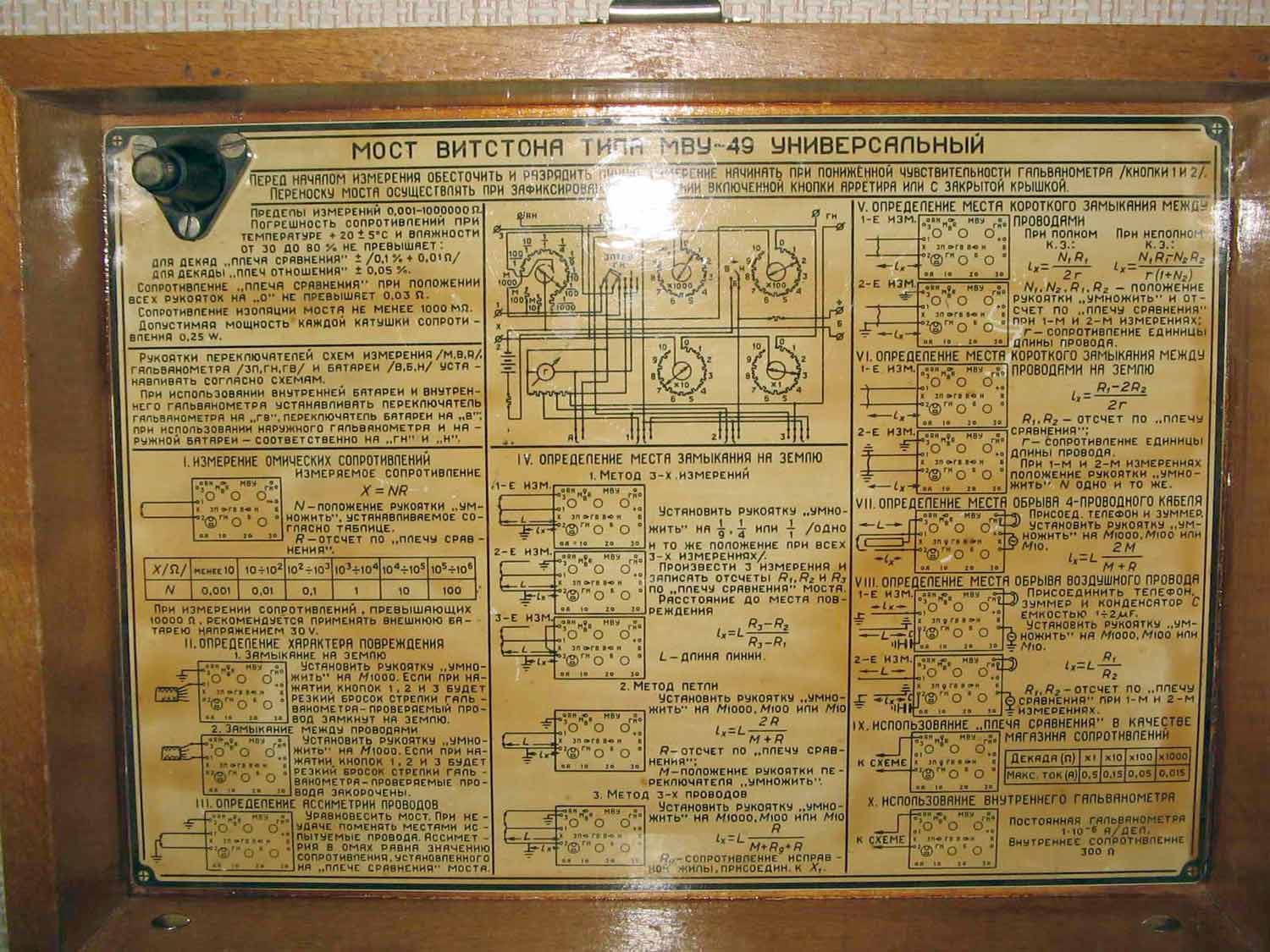 Мост постоянного тока *МВУ-49* выпускался с 1950 года. Мост предназначен для определения характера и места повреждения в воздушных и кабельных линиях и для измерения сопротивлений на постоянном токе от 10 до 100000 ом с погрешностью ±0,2%. Прибор дает возможность производить следующие виды измерений и испытаний: Измерение сопротивлений на постоянном токе. Определение характера повреждений воздушной или кабельной линии: замыкания на землю; замыкания между проводами. Определение асимметрии проводов. Определение места замыкания одного провода на землю: по способу трех измерений; по способу петли; по способу трех проводов. Определение места короткого замыкания между проводами на землю. Определение короткого замыкания между проводами. Определение места обрыва четырёхпроводного кабеля. Определение места обрыва провода воздушной линии. Кроме того, возможно: использование плеча сравнения моста в качестве магазина сопротивлений; использование внутреннего гальванометра моста отдельно в качестве нулевого прибора.