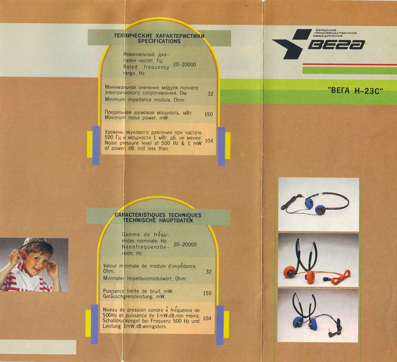 Стереофонические телефоны *Вега Н-23* и *Вега Н-23-1С* выпускало Бердское ПО *Вега* соответственно с 1987 и 1990 года. Телефоны предназначены для индивидуального высококачественного прослушивания музыкальных фонограмм с моно и стереофонической бытовой радиоаппаратуры. Диапазон рабочих воспроизводимых частот - 20...20000 Гц. Сопротивление 32 Ом. Номинальная подводимая мощность 1 мВт, максимальная 150 мВт. Масса телефонов 60 гр.
