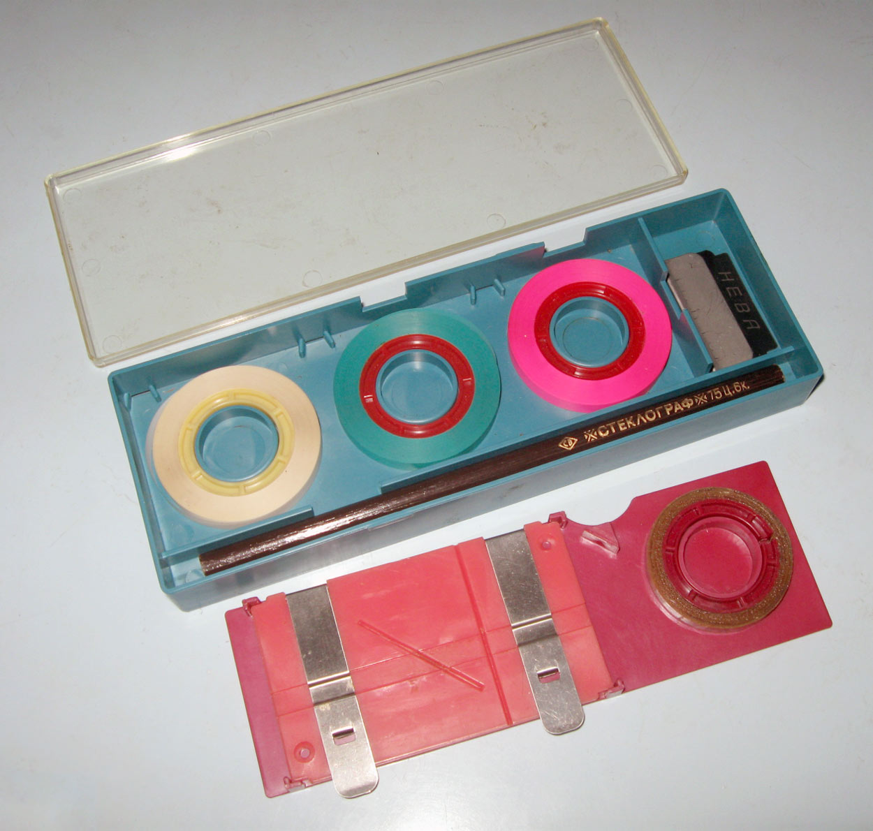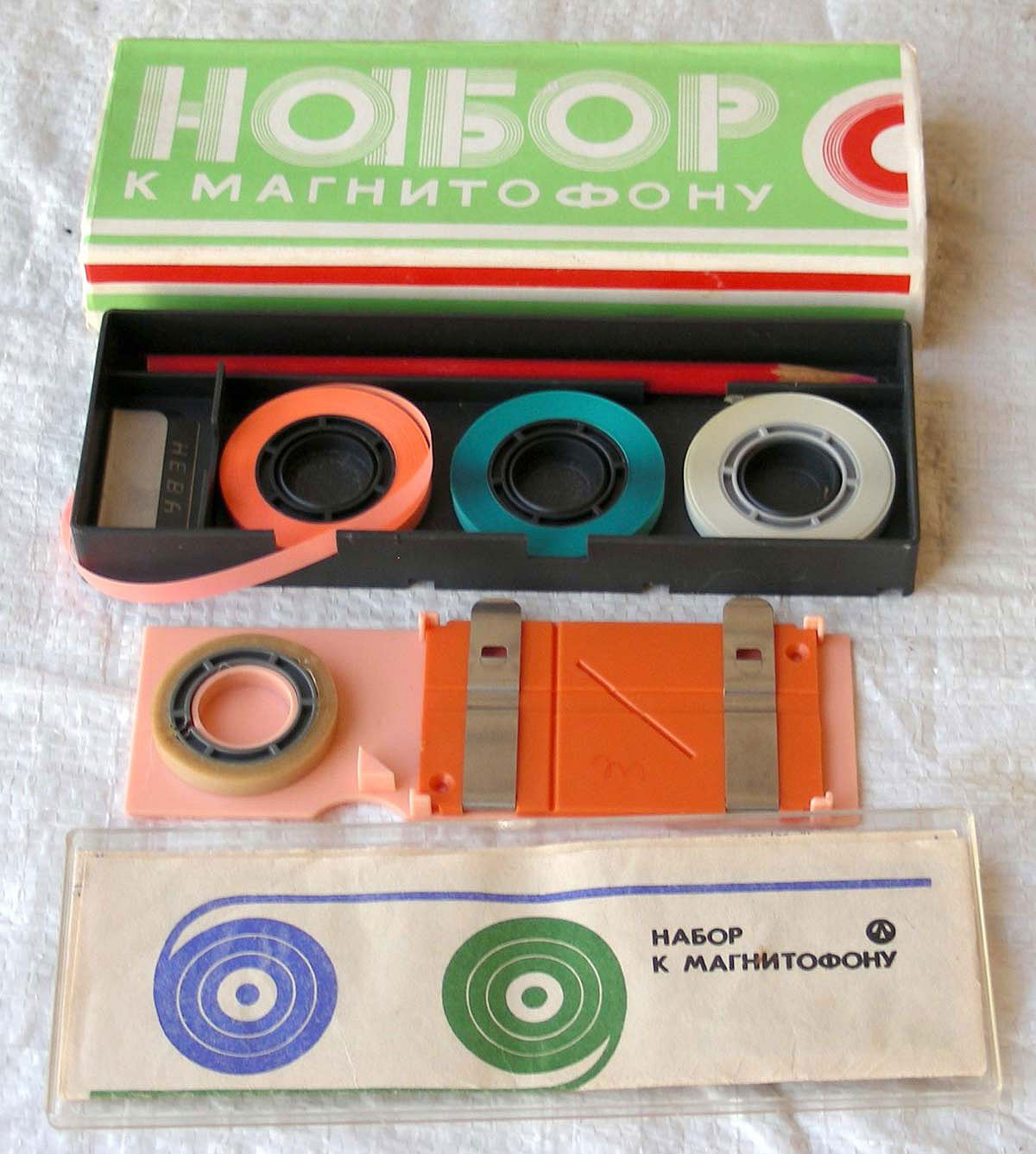Набор ракордов к магнитофоным лентам под наименованием *Набор к магнитофону* предположительно с 1976 года выпускал Ленинградский электромеханический завод *Равенство*. Набор к магнитофону предназначен для подклейки цветных ракордов (немагнитных, обычно лавсановых цветных отрезков) для более полного использования магнитной ленты и предовращения её от потёртости на концах рулонов. Склеивающую ленту из набора можно использовать и для механического монтажа фонограмм. Все ракорды и склеивающая лента имеют как и магнитная лента ширину 6,25 мм. Что примечательно, наборы 1976 года имели по 25 метров ракордов каждого цвета, тогда как наборы 1980 года уже имели только по 20 метров. Последние два фото - набор 1980 года.